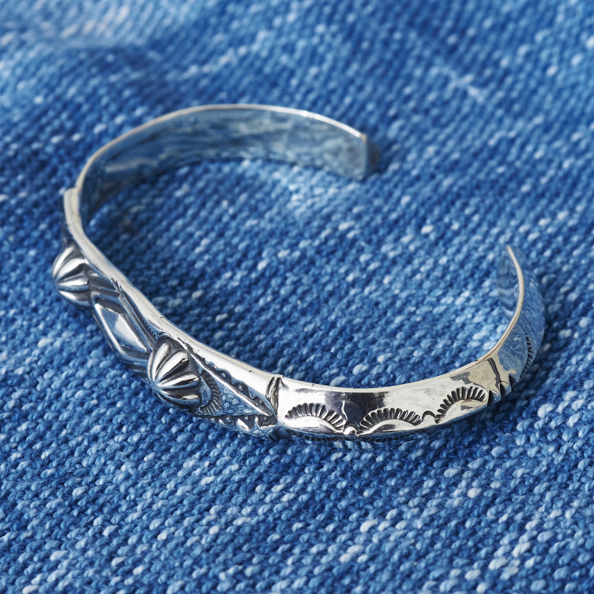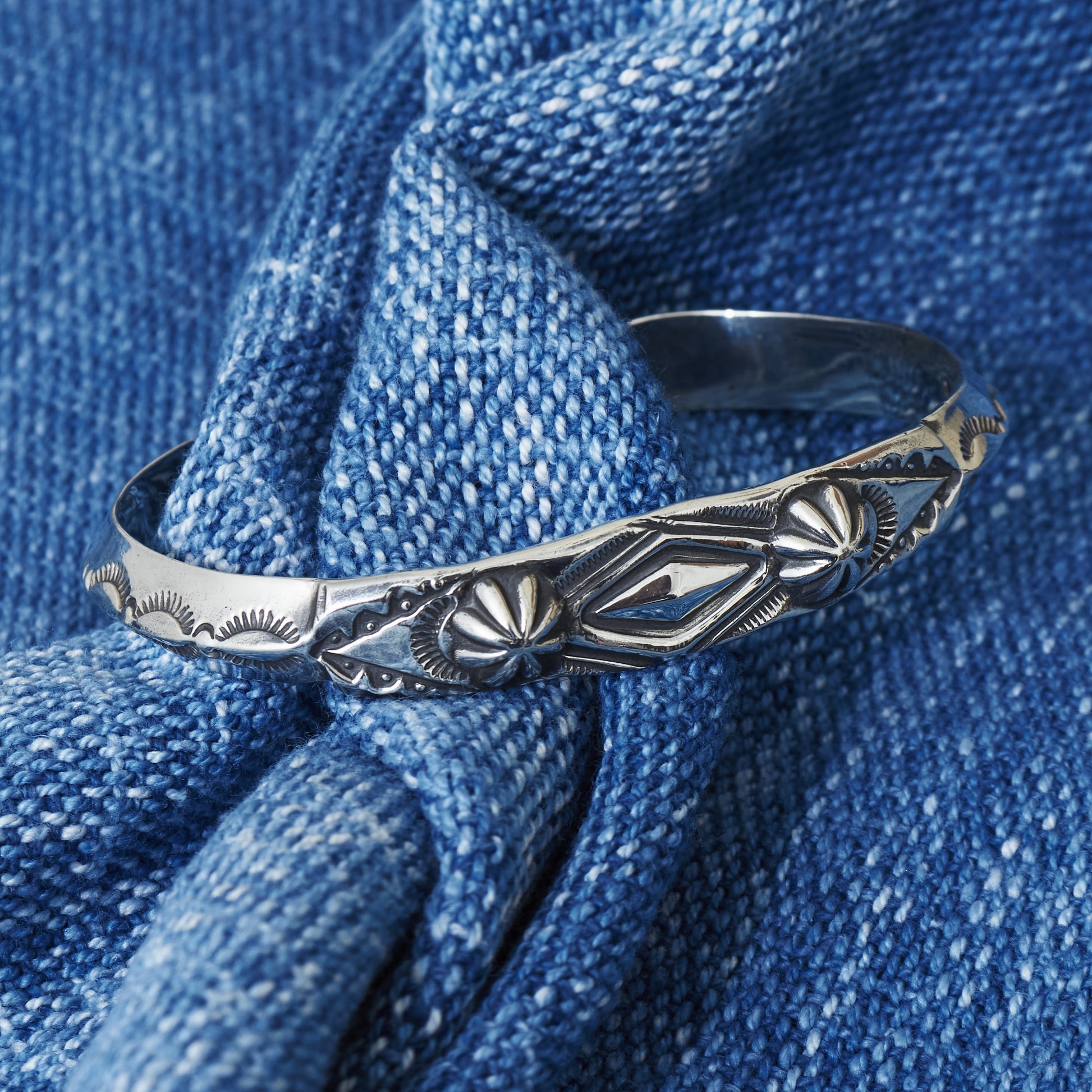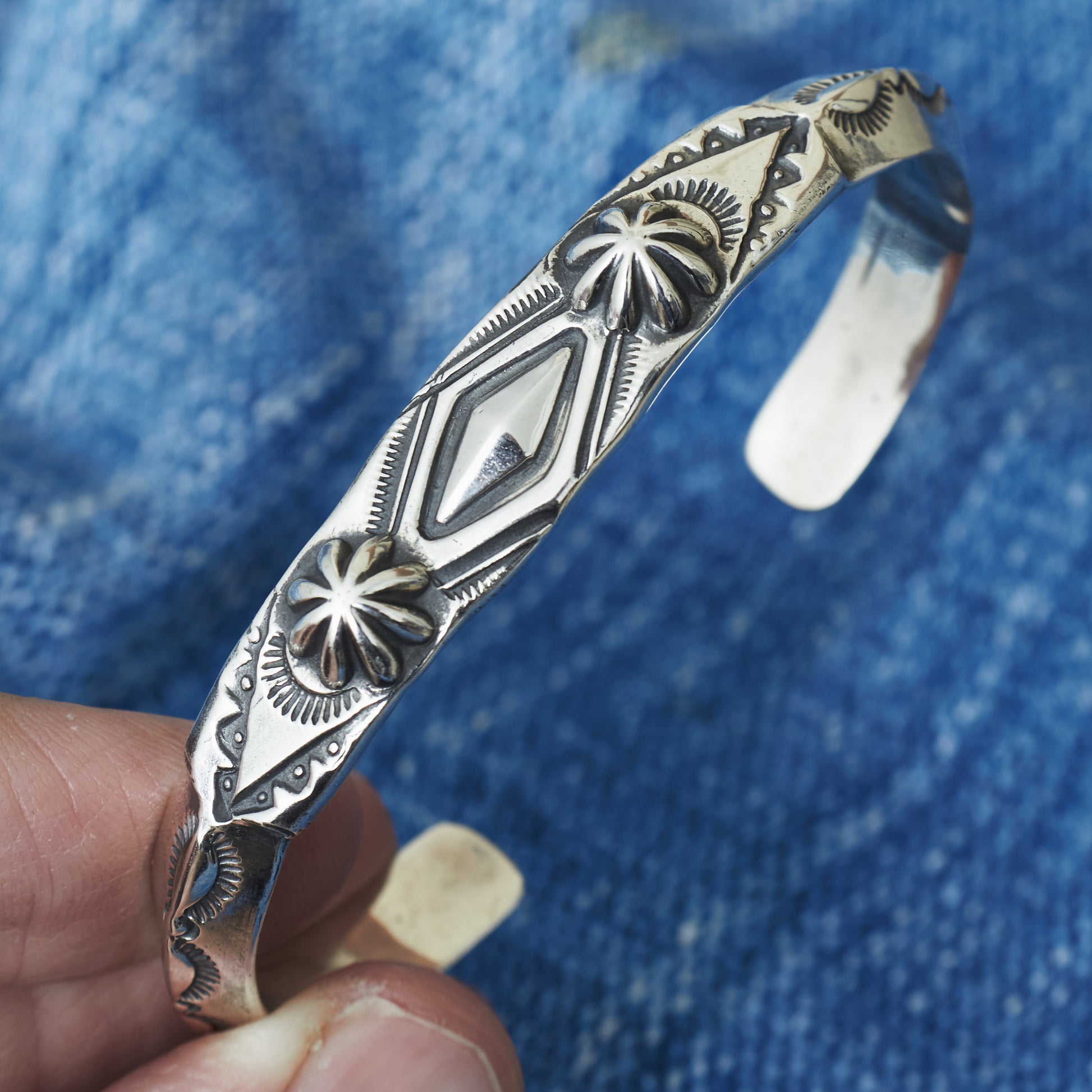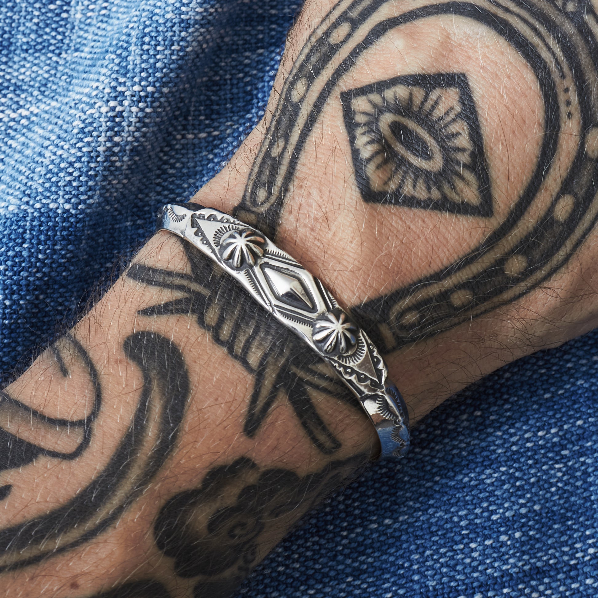 This silver bracelet is all handmade made by Larry Smith in Japan. Inspired by Native American jewelry from the so called Fred Harvey era dating back to the early 20th century. This thin bracelet looks great worn as it is or combined with other bracelets around you wrist.