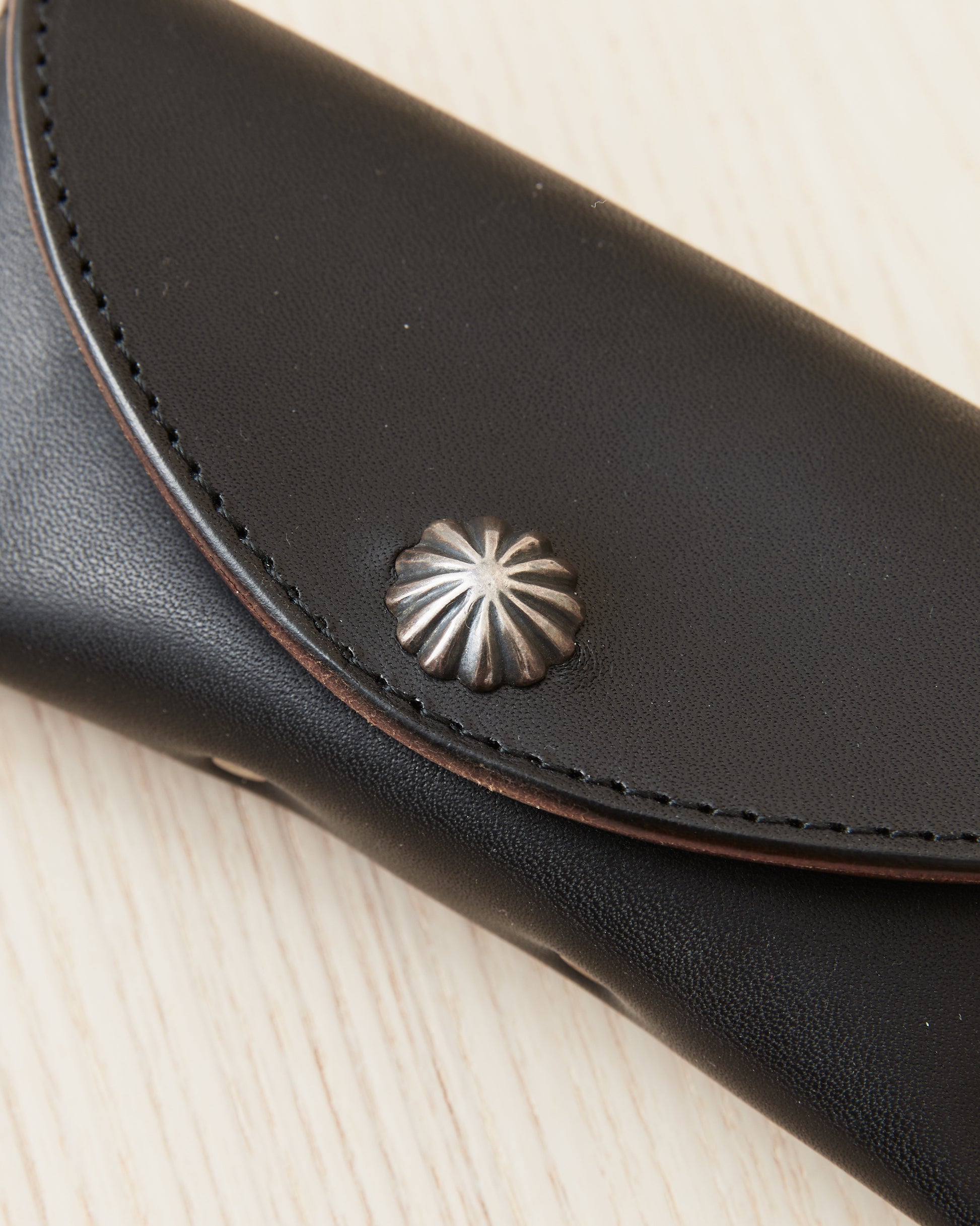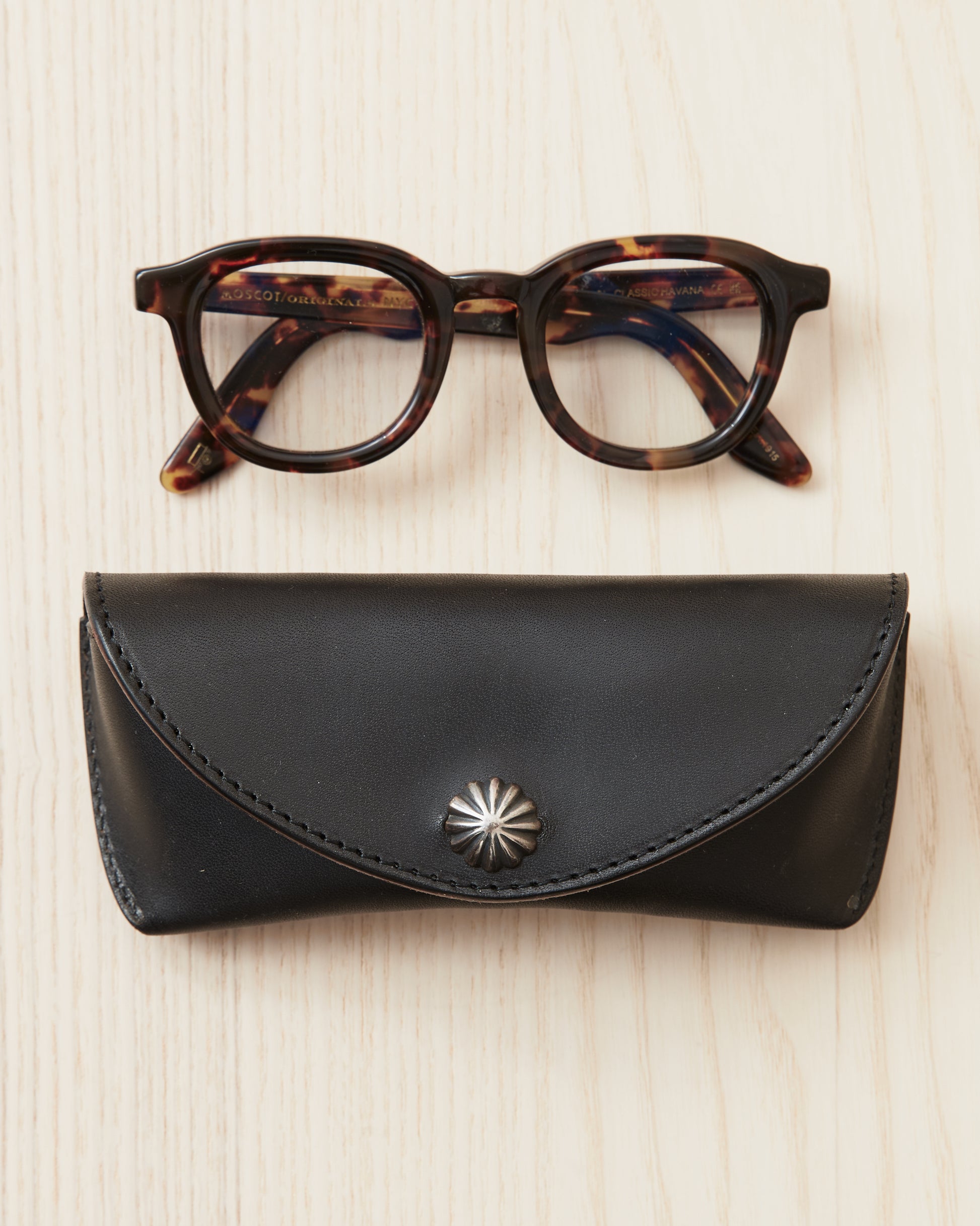 Protect your glasses with this steer hide case made by Larry Smith in Japan. The case is made of a light black steer hide that will look even better the more it gets used, the button is covered with a silver concha and the inside of the case is lined with a black velvet that will make sure that your glasses are protected and wont get scratched.