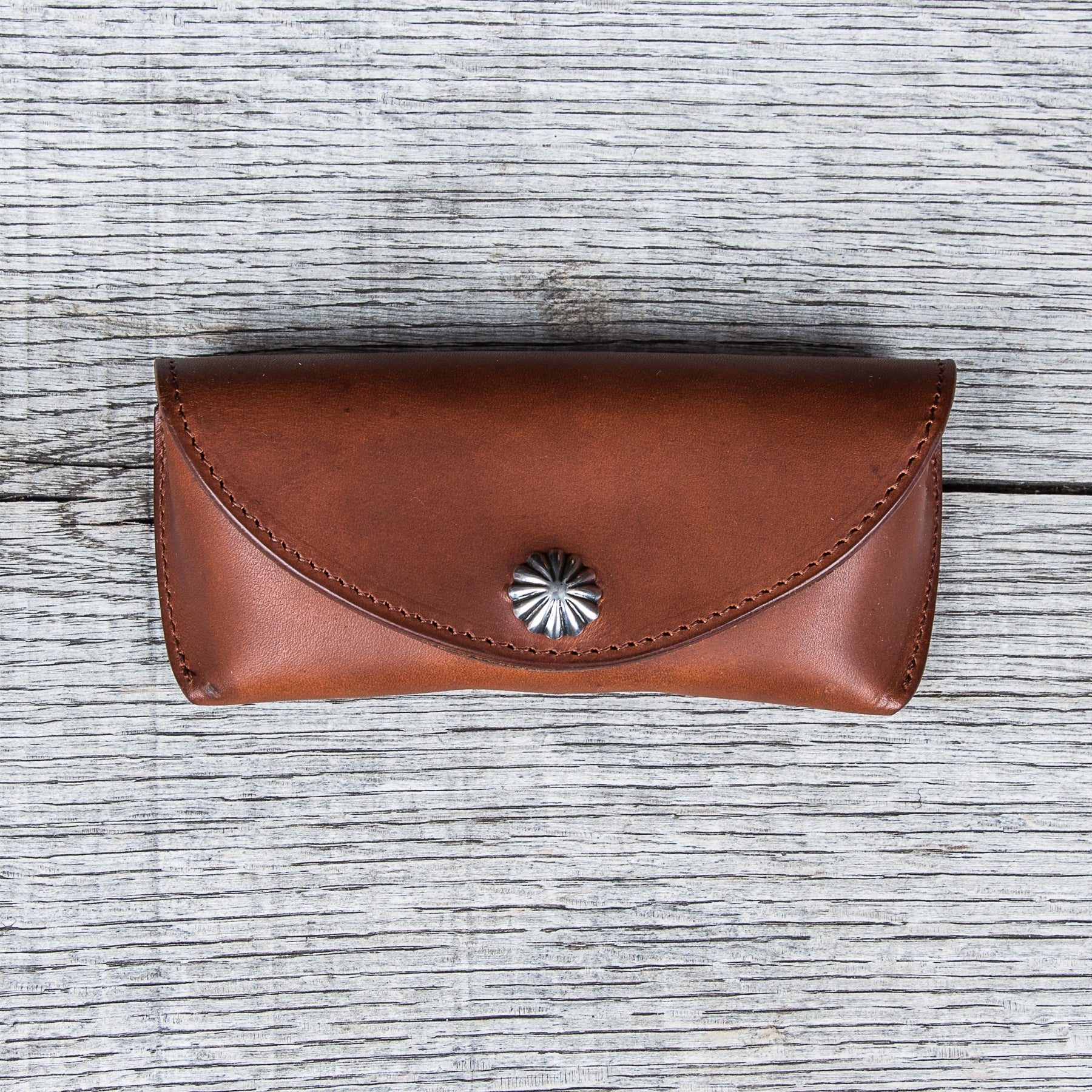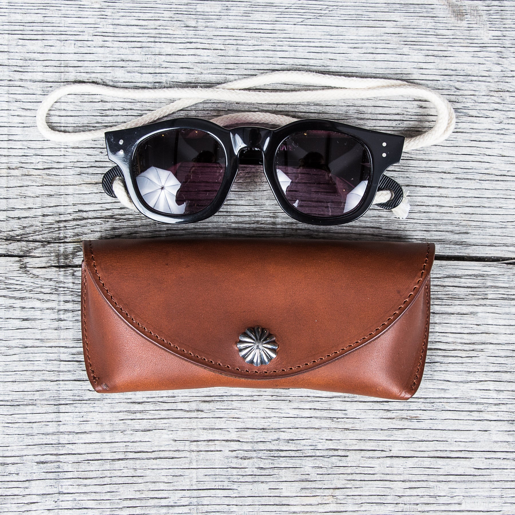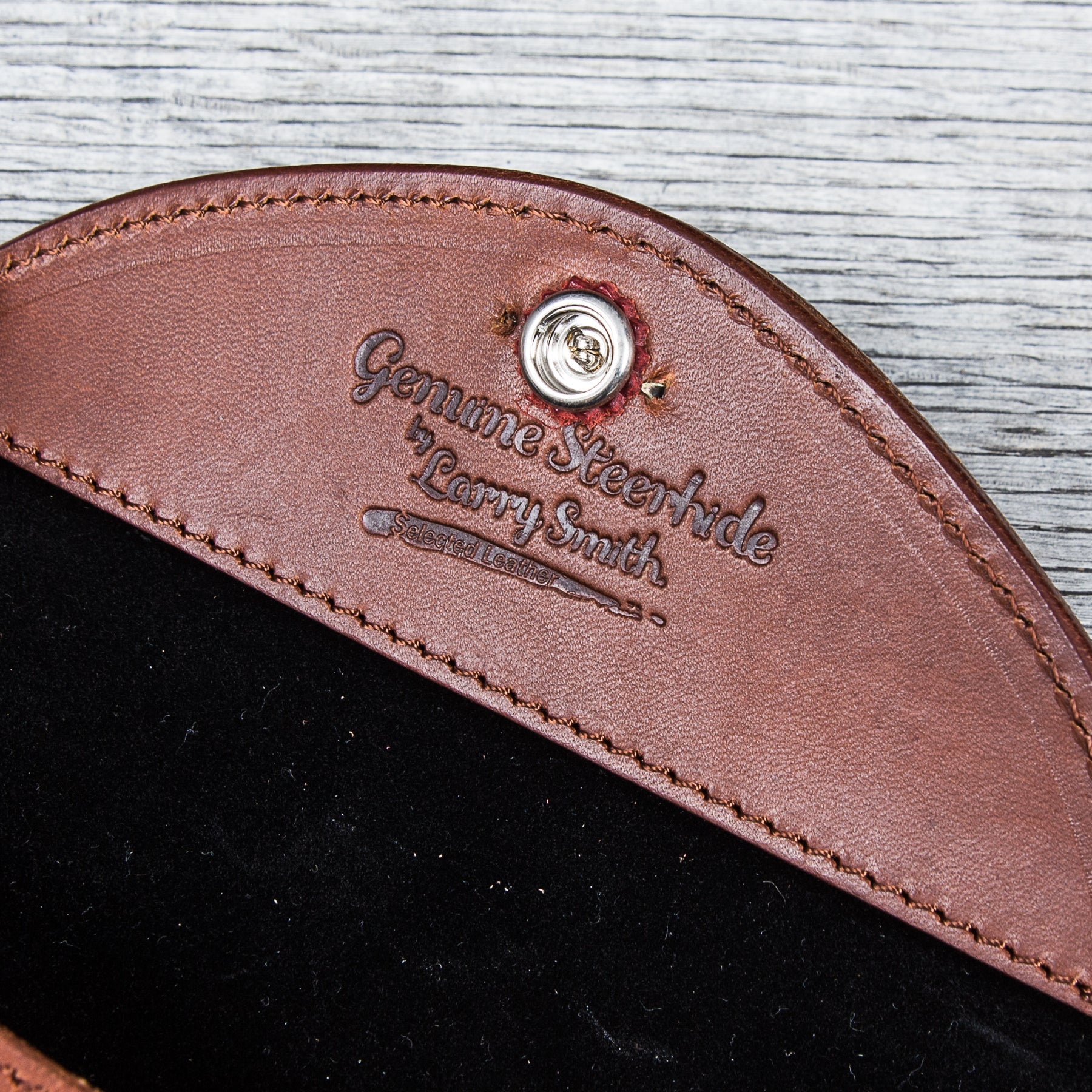 Protect your glasses with this steer hide case made by Larry Smith in Japan. The case is made of a light brown steer hide that will darken and look better the more it gets used, the button is covered with a silver concha and the inside of the case is lined with a black velvet that will make sure that your glasses are protected and wont get scratched.