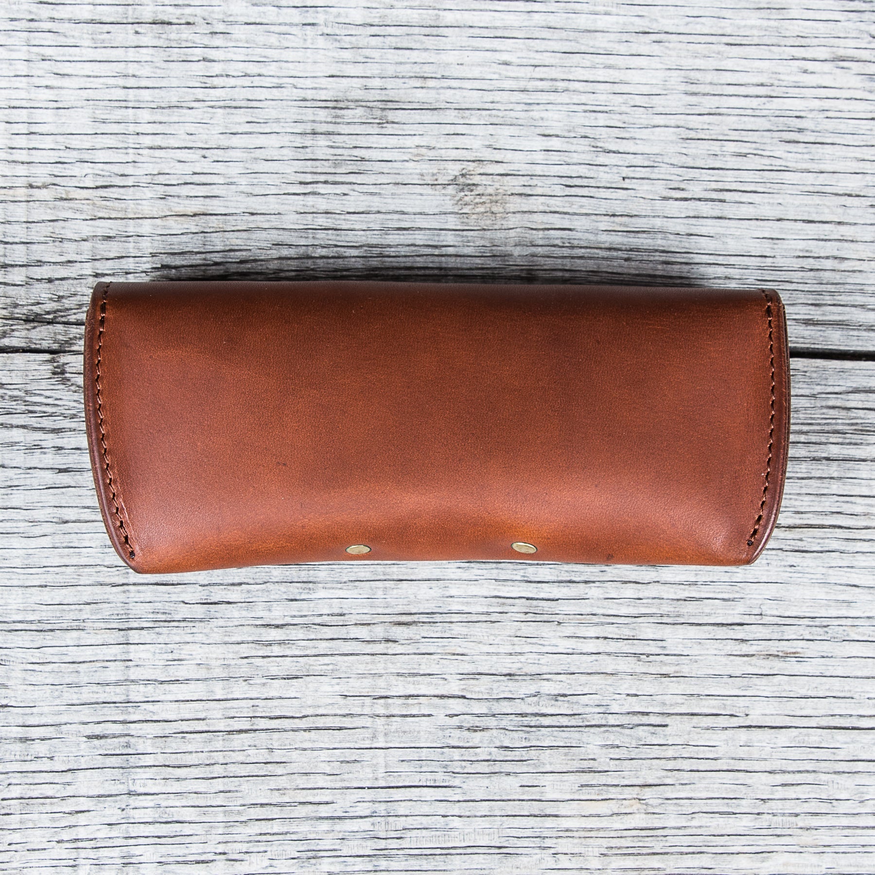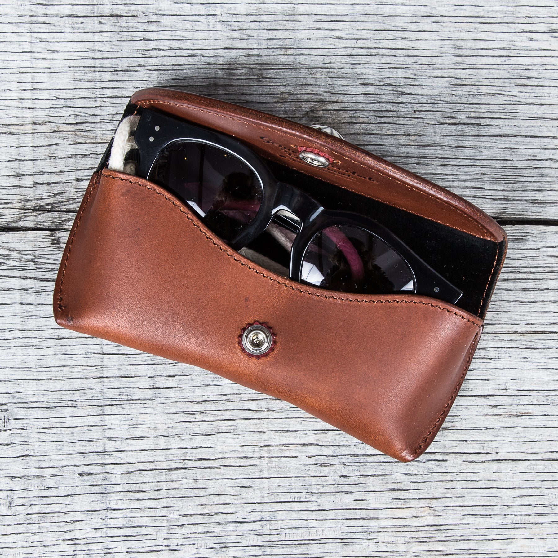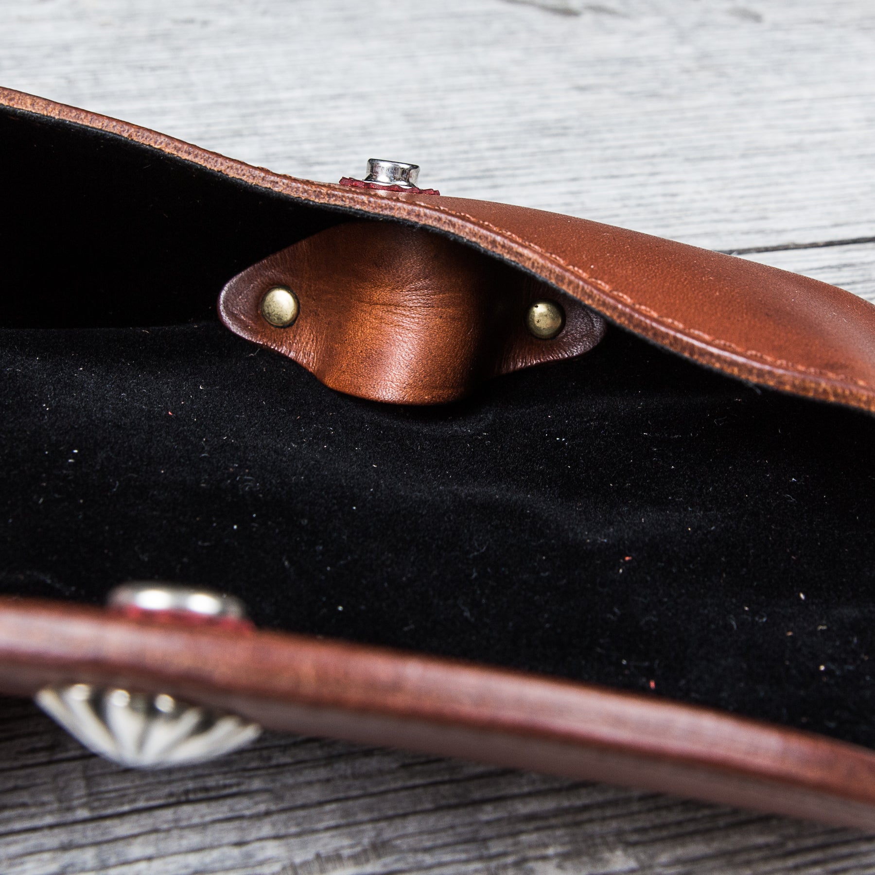 Protect your glasses with this steer hide case made by Larry Smith in Japan. The case is made of a light brown steer hide that will darken and look better the more it gets used, the button is covered with a silver concha and the inside of the case is lined with a black velvet that will make sure that your glasses are protected and wont get scratched.