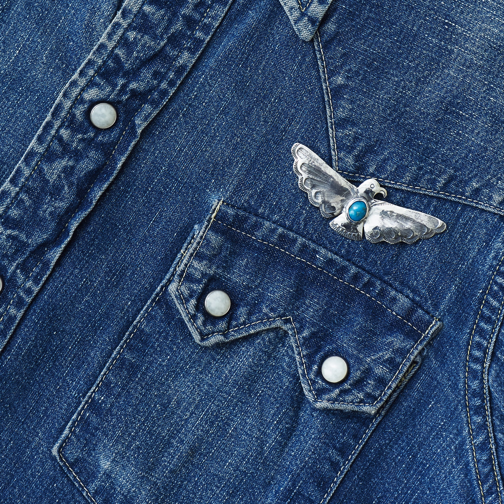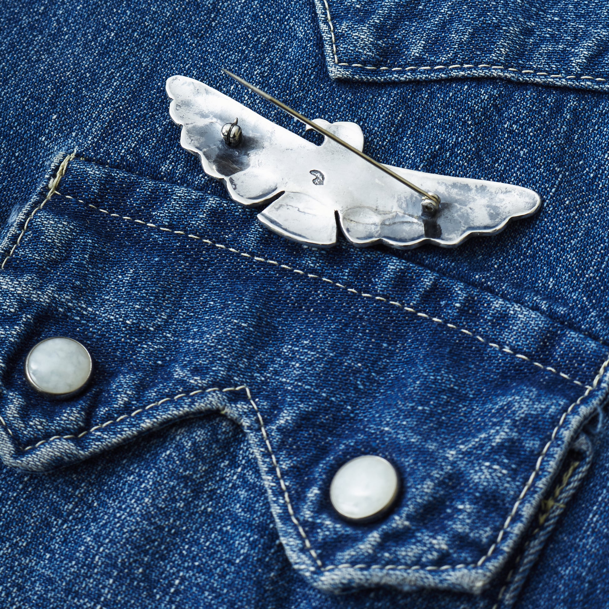 Thunderbird silver brooch made by hand in Japan by Larry Smith. Inspired by Native American jewelry from the so called "Fred Harvey era" dating back to the early 20th century.
