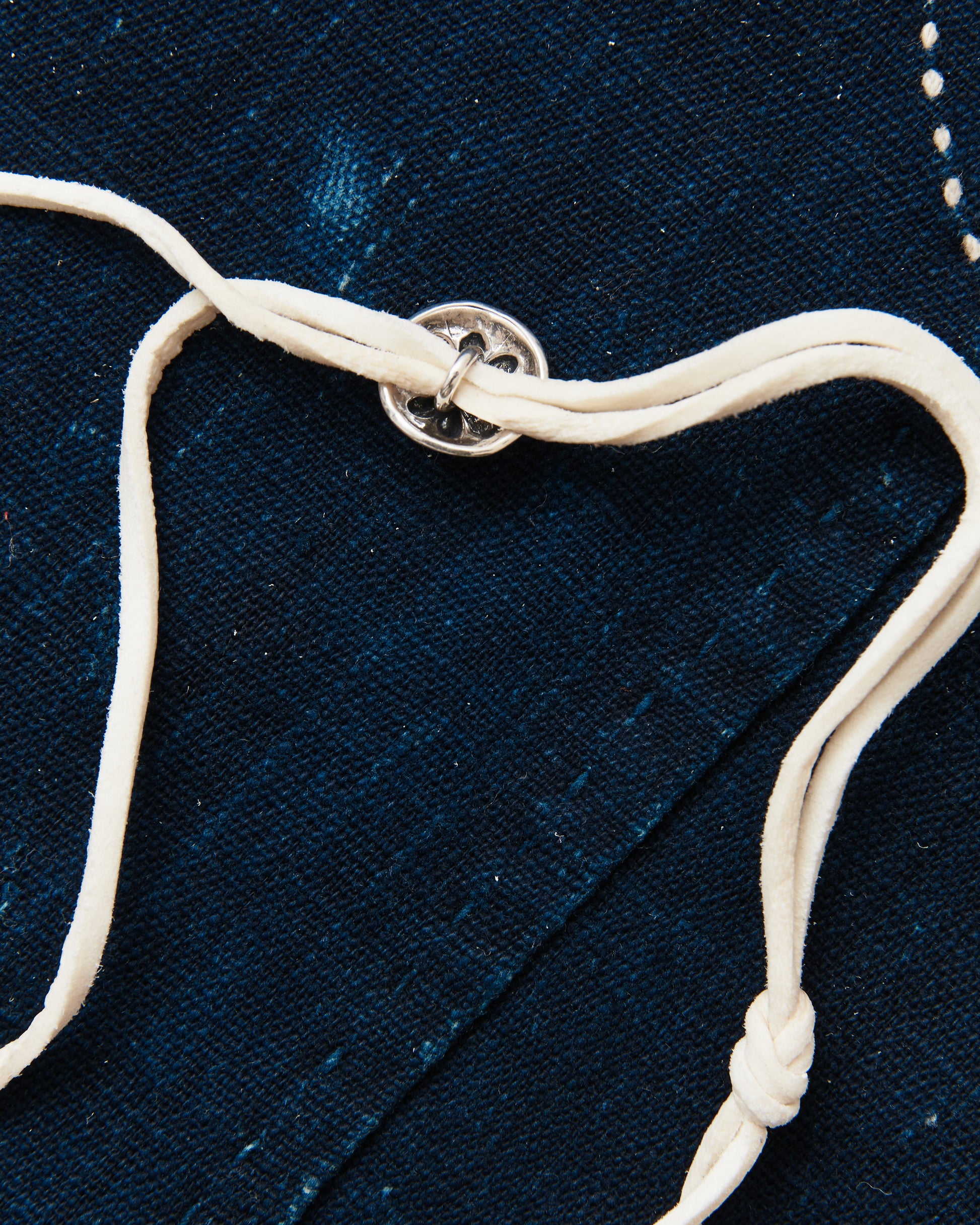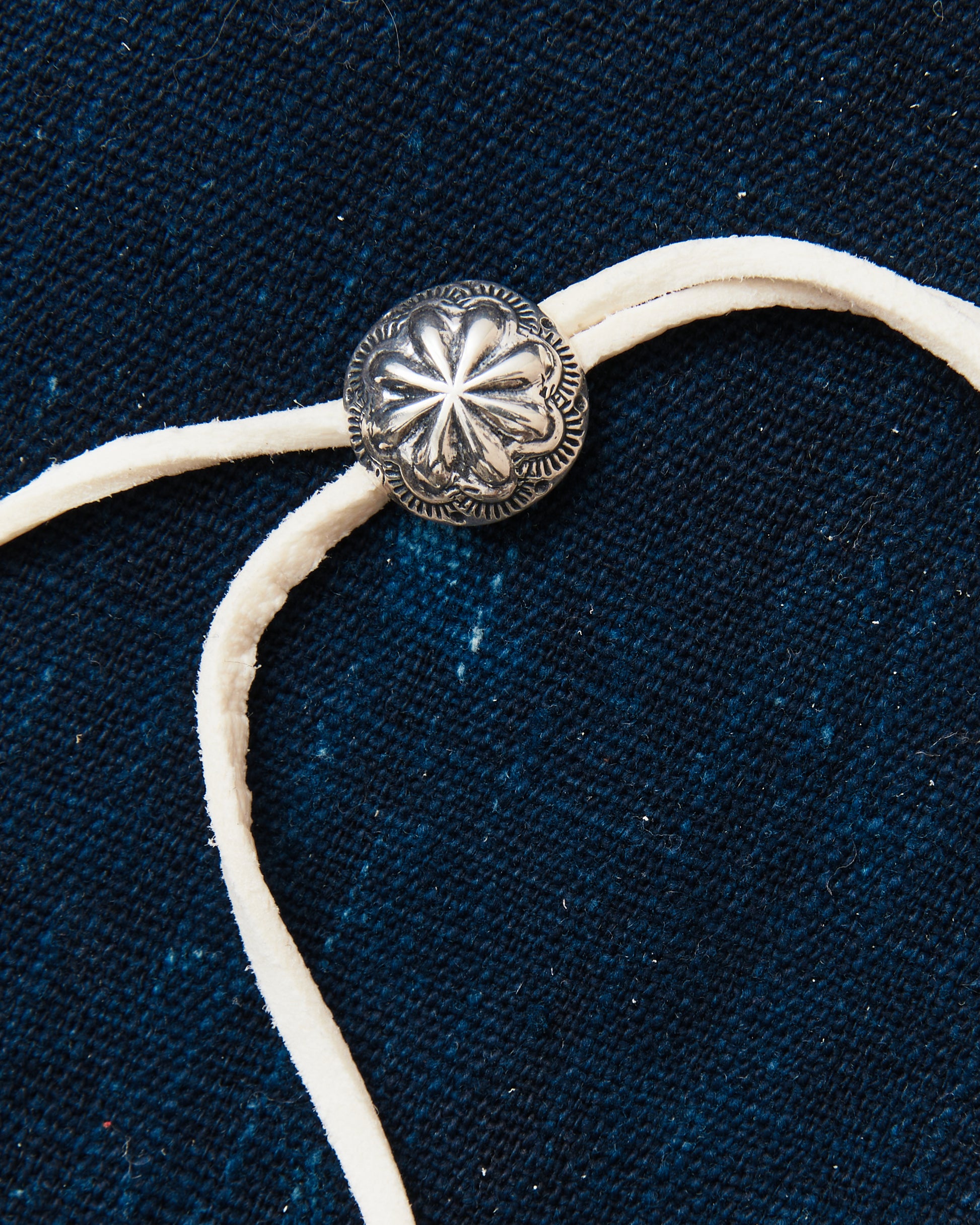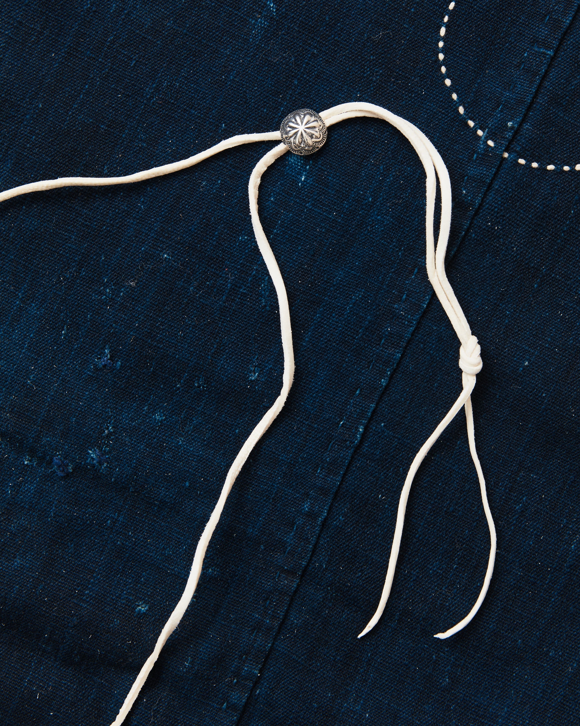 This is a necklace by Larry Smith. It is made with three beautiful blue turquoise teardrop beads, threaded on a white deer skin lace, together with eight silver beads. You can also adjust the length of the necklace with a silver concho button at the nack of the neck. Full length of the necklace, measuring from the knot, is about 85 cm. This is without adjusting the length with the silver concho.