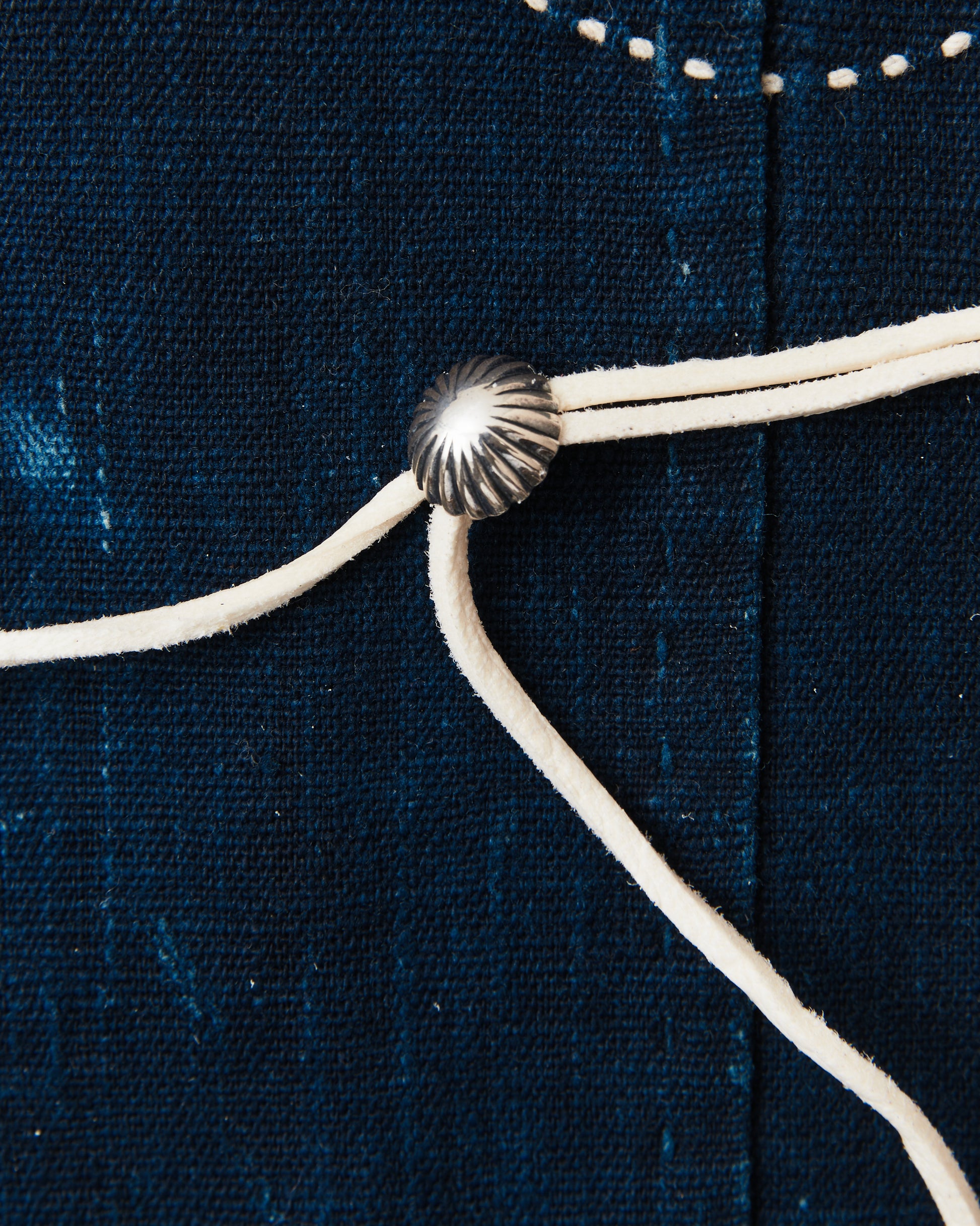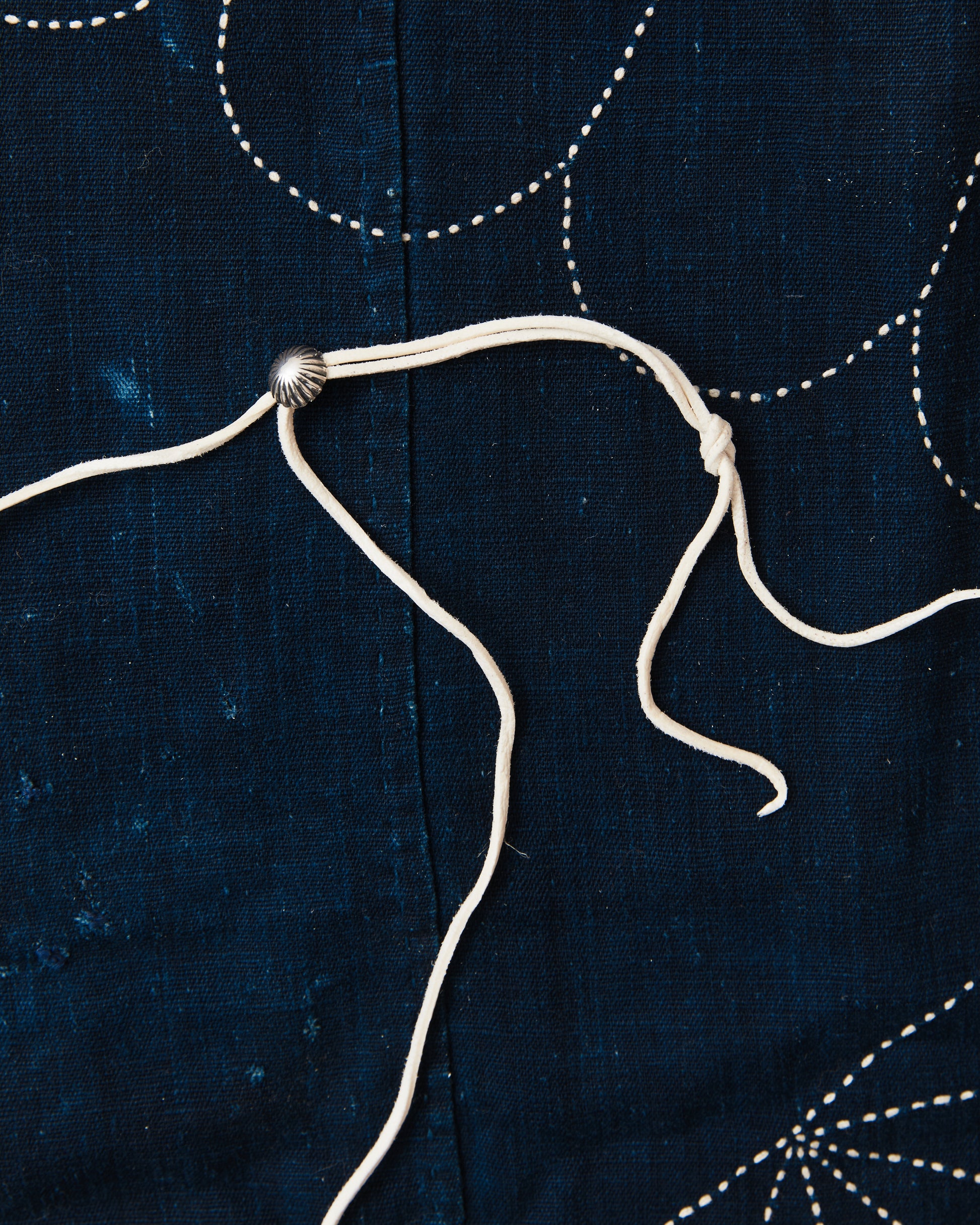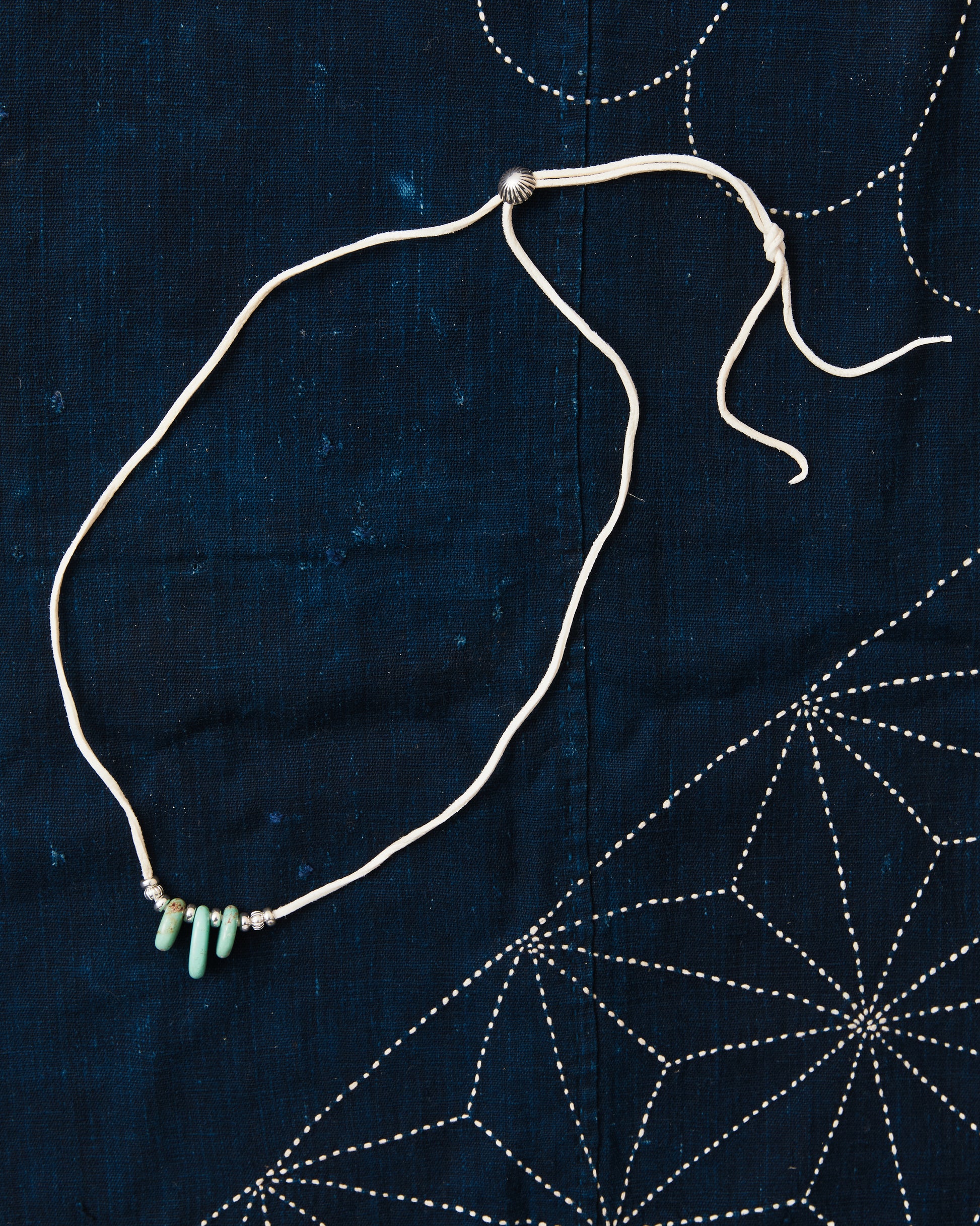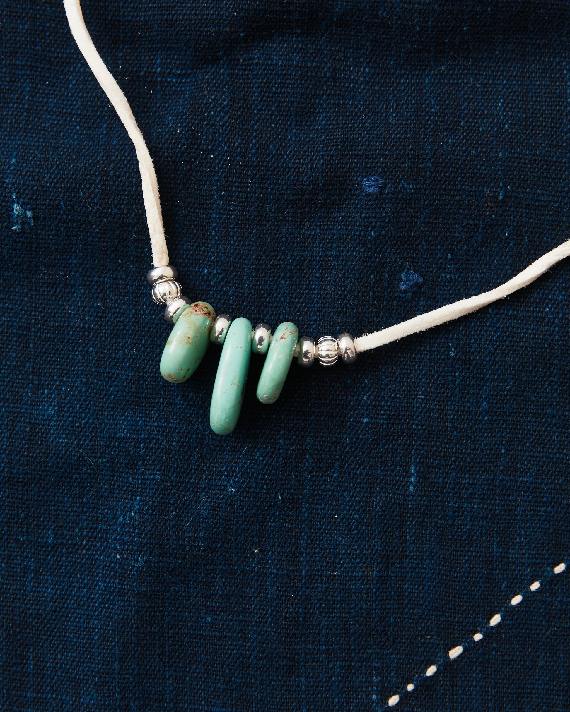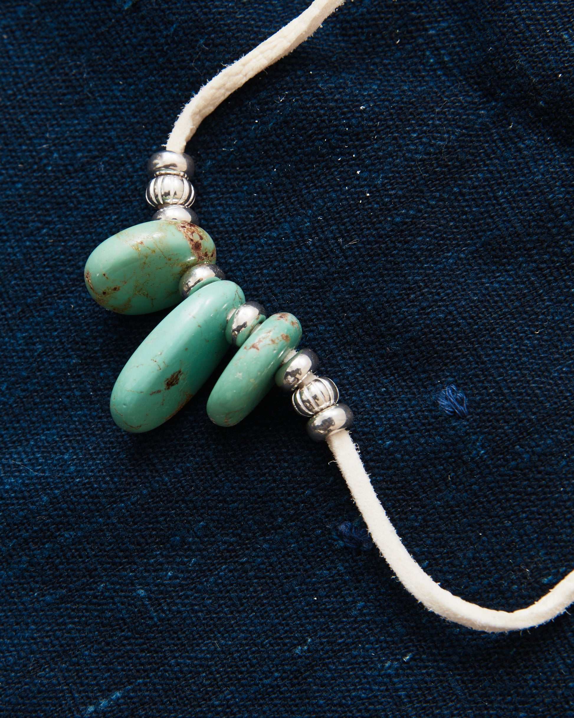 This is a necklace by Larry Smith. It is made with three beautiful green turquoise teardrop beads, threaded on a white deer skin lace, together with eight silver beads. You can also adjust the length of the necklace with a silver concho button at the nack of the neck. Full length of the necklace, measuring from the knot, is about 85 cm. This is without adjusting the length with the silver concho.