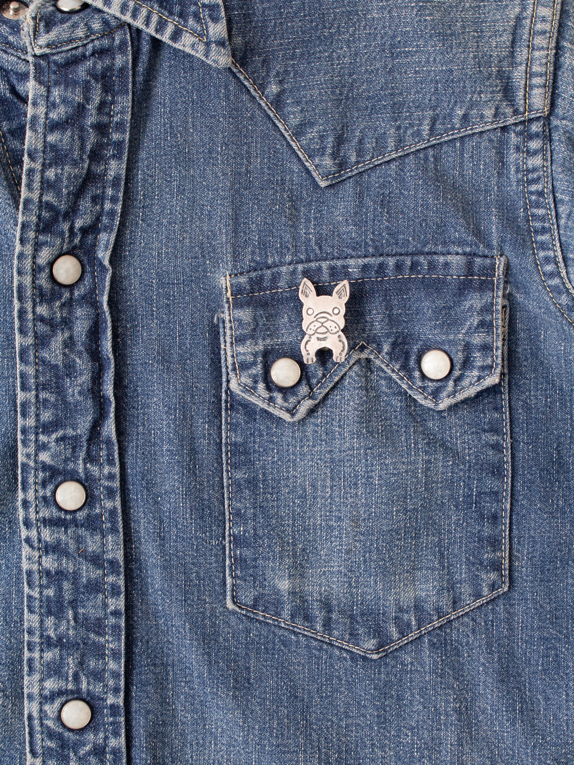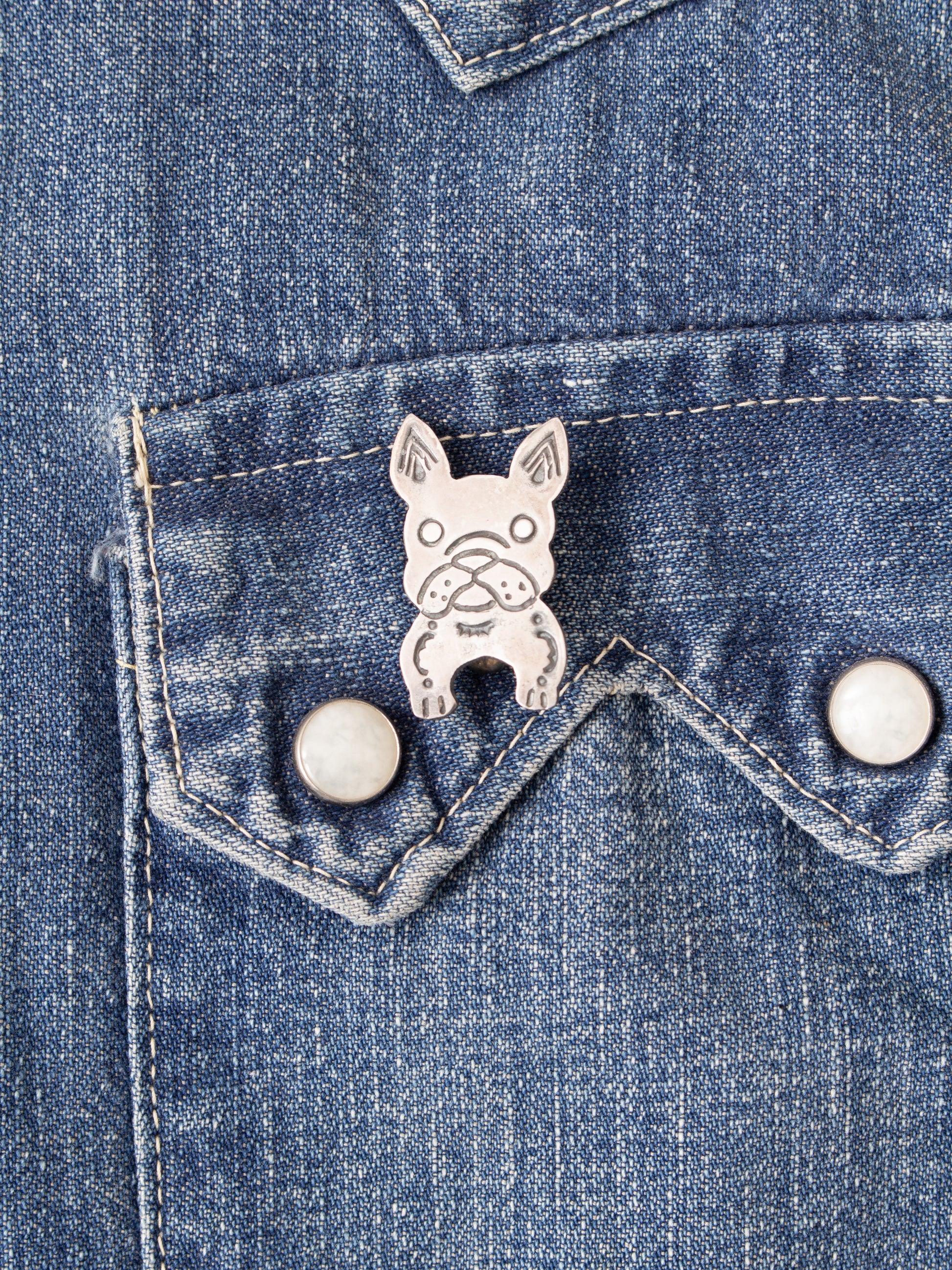 This hand made silver brooch represents a French Bulldog decorated with small native stamps.