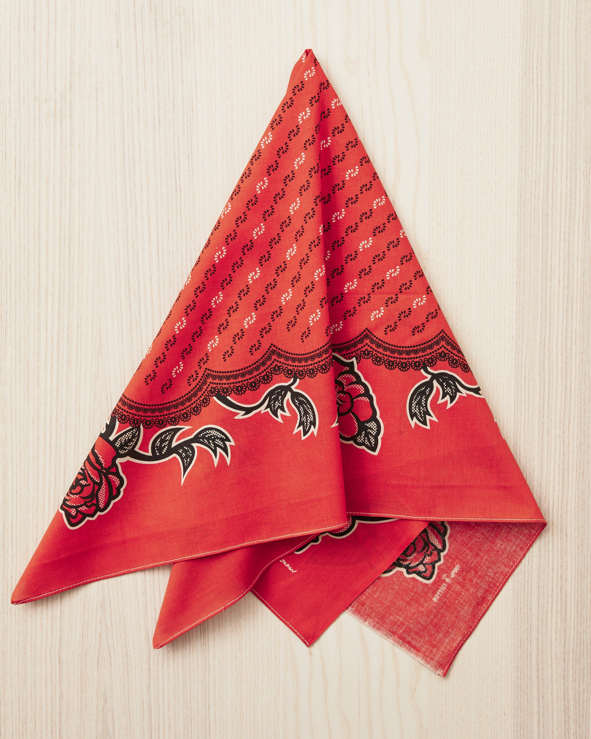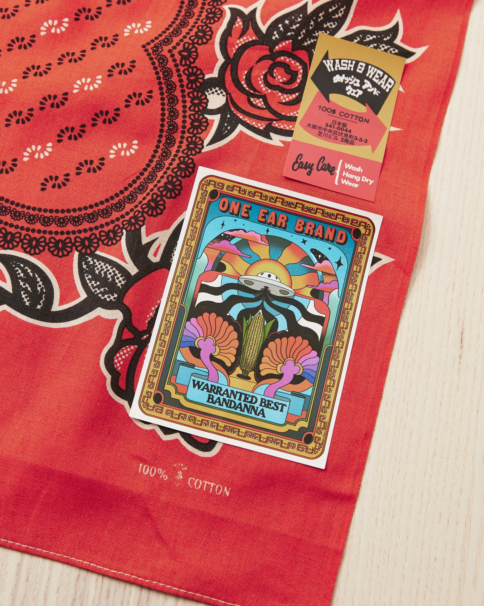 One Ear Brand bandanas are 100% completely made in Japan. Each shuttle woven bandana has two selvedge sides on fabric that is 90cm x 90cm or 70cm x 70cm. Shrinkage will occur and light colors are sensitive to washing and sunlight. Please take care accordingly.