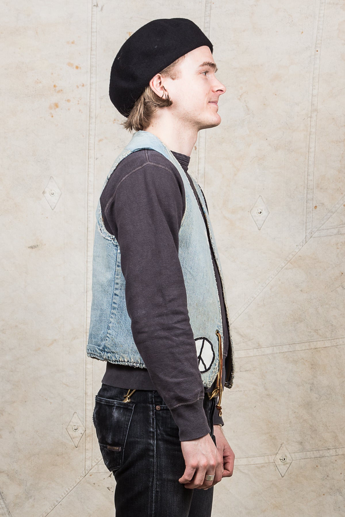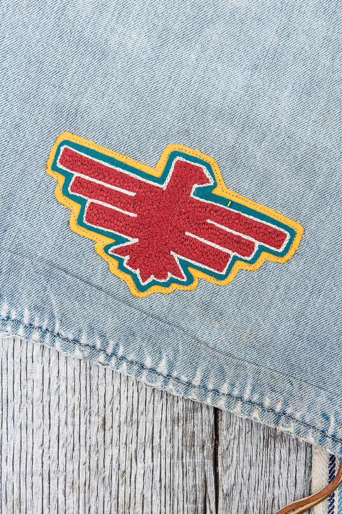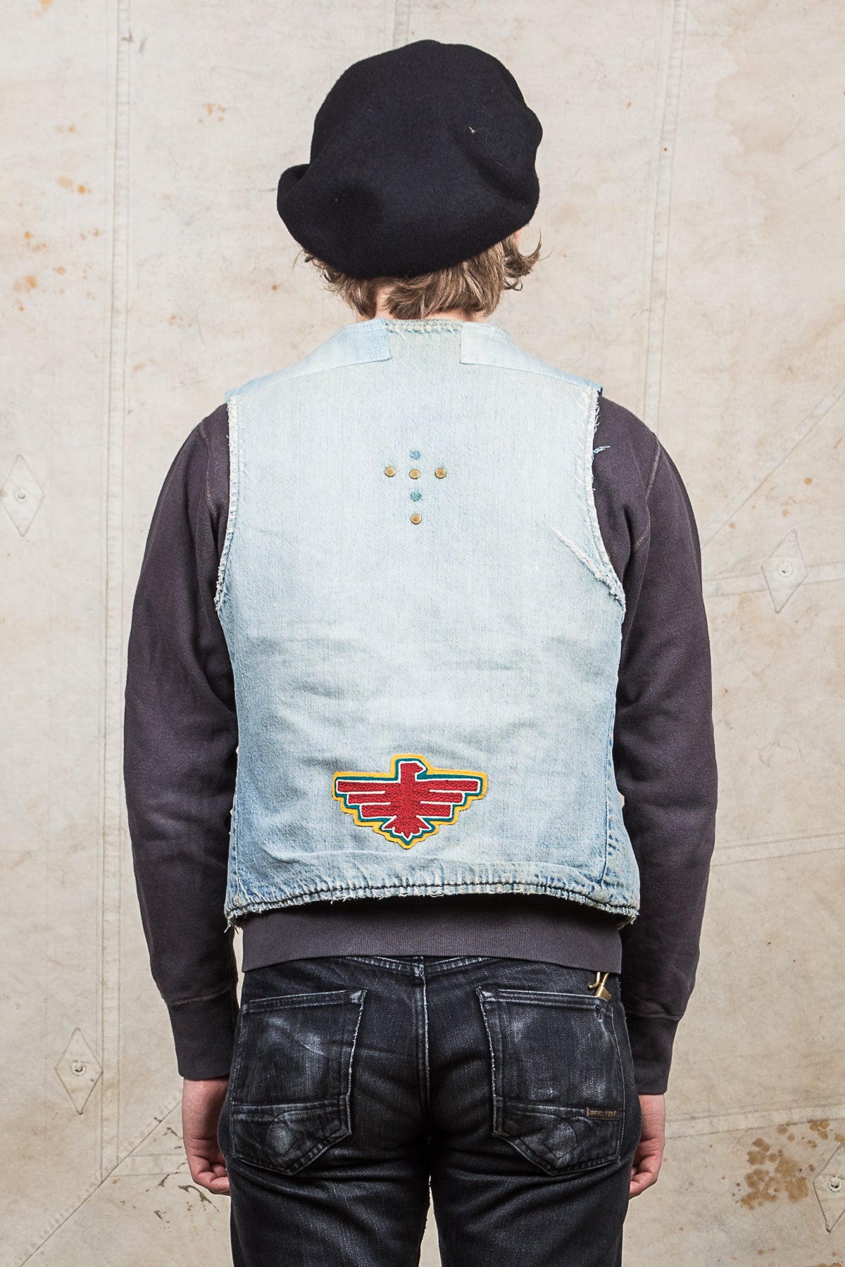 This vest has seen many of days of use and it's visible that it has been loved by the previous owner or owners. The denim is faded to perfection and has been patched on both shoulders. The vest has also been decorated with a riveted cross on the back, a hand made chain stitch thunderbird patch and a home made peace patch on the front. The vest will most likely need more maintenance if one continue to use it but it is the kind of garment that will only look better the more it is patched and loved.