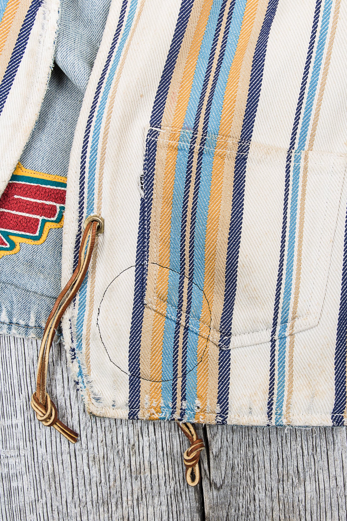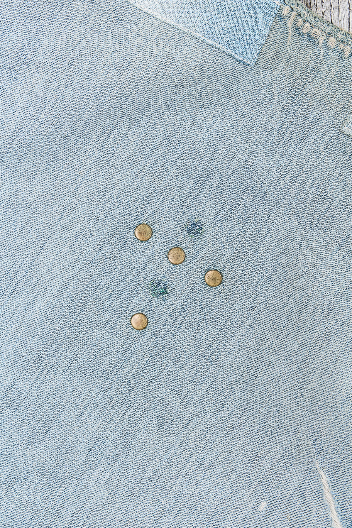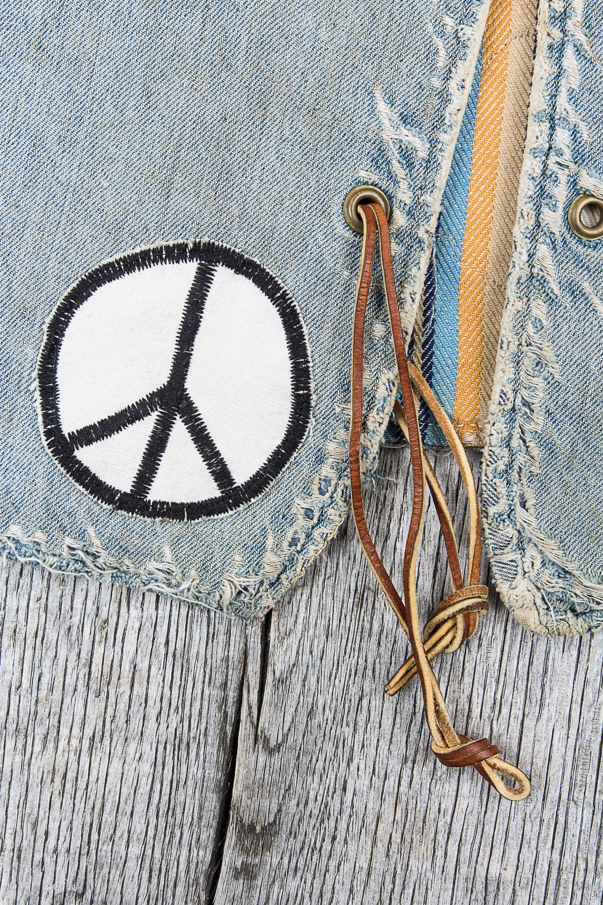 This vest has seen many of days of use and it's visible that it has been loved by the previous owner or owners. The denim is faded to perfection and has been patched on both shoulders. The vest has also been decorated with a riveted cross on the back, a hand made chain stitch thunderbird patch and a home made peace patch on the front. The vest will most likely need more maintenance if one continue to use it but it is the kind of garment that will only look better the more it is patched and loved.