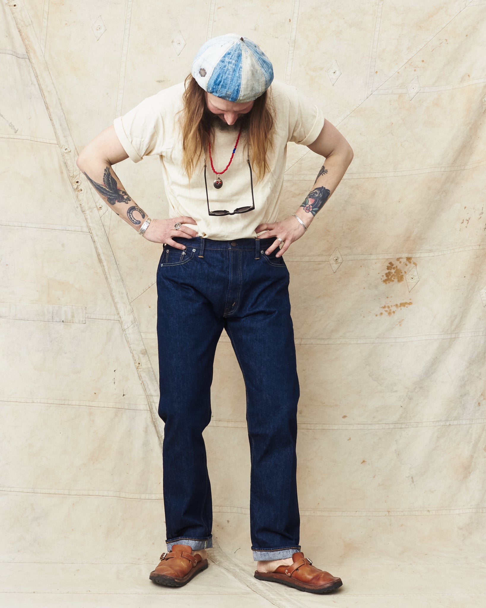 These jeans has been washed once which brings out a fine bright indigo color and also makes sure that the jeans won't shrink when washed. Due to the fact that the jeans are washed the legs will also bee slightly twisted, the so called leg-twist is a detail that is synonymous with vintage jeans and it's an effect that appears after the first wash if the jeans have been cut and sown using a denim fabric that isn't sanforized. The twisted leg is part of authentic denim inspired by the past.