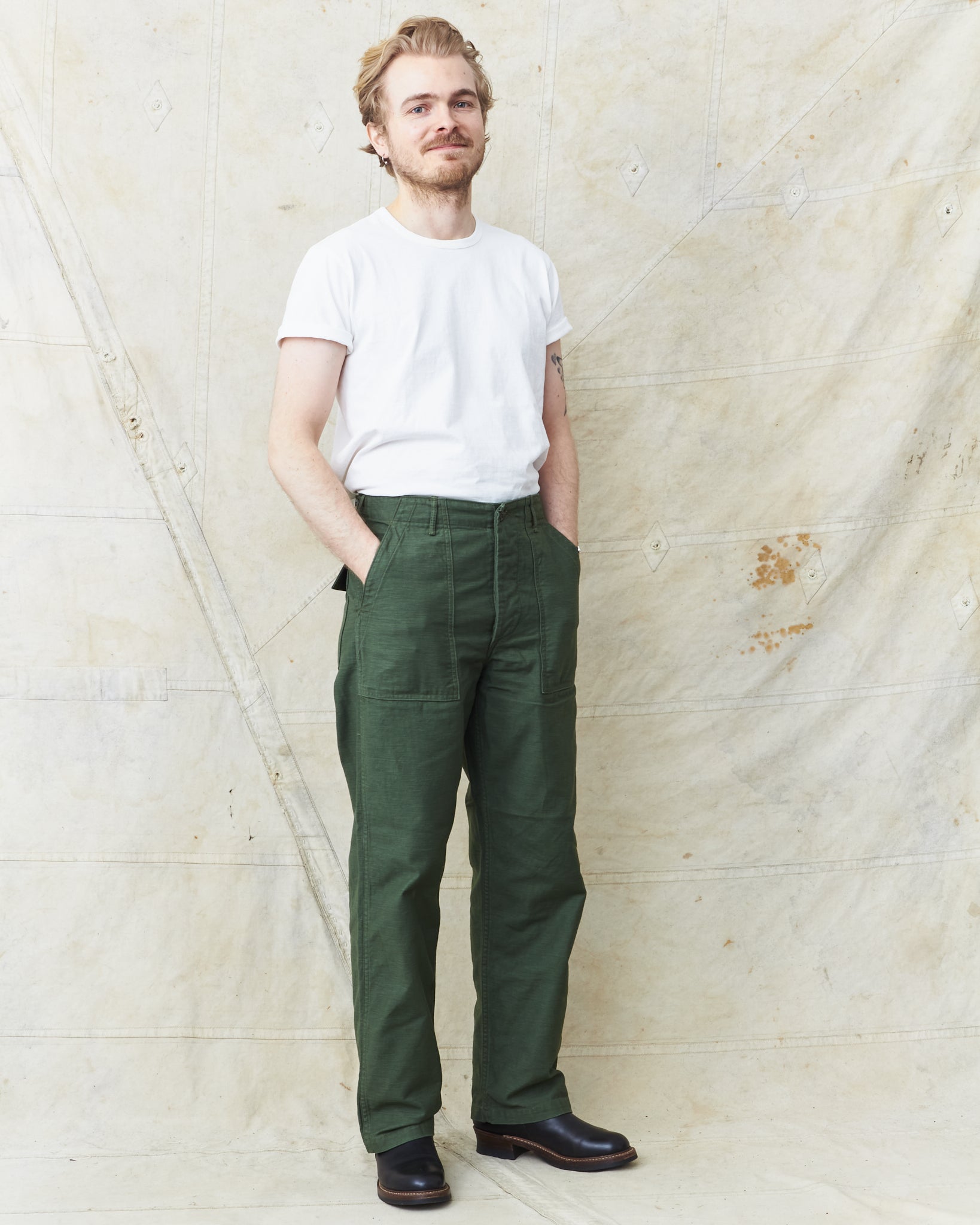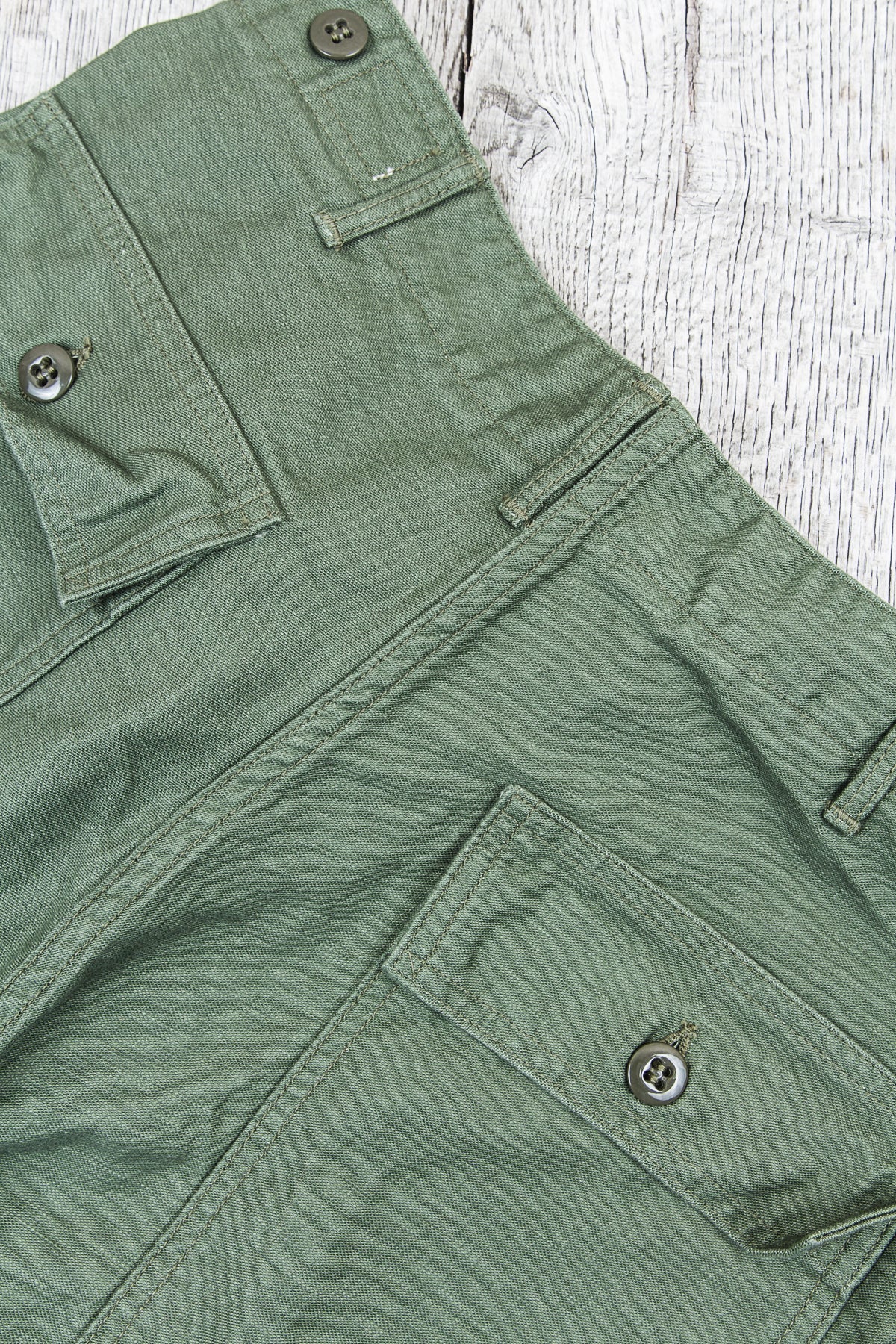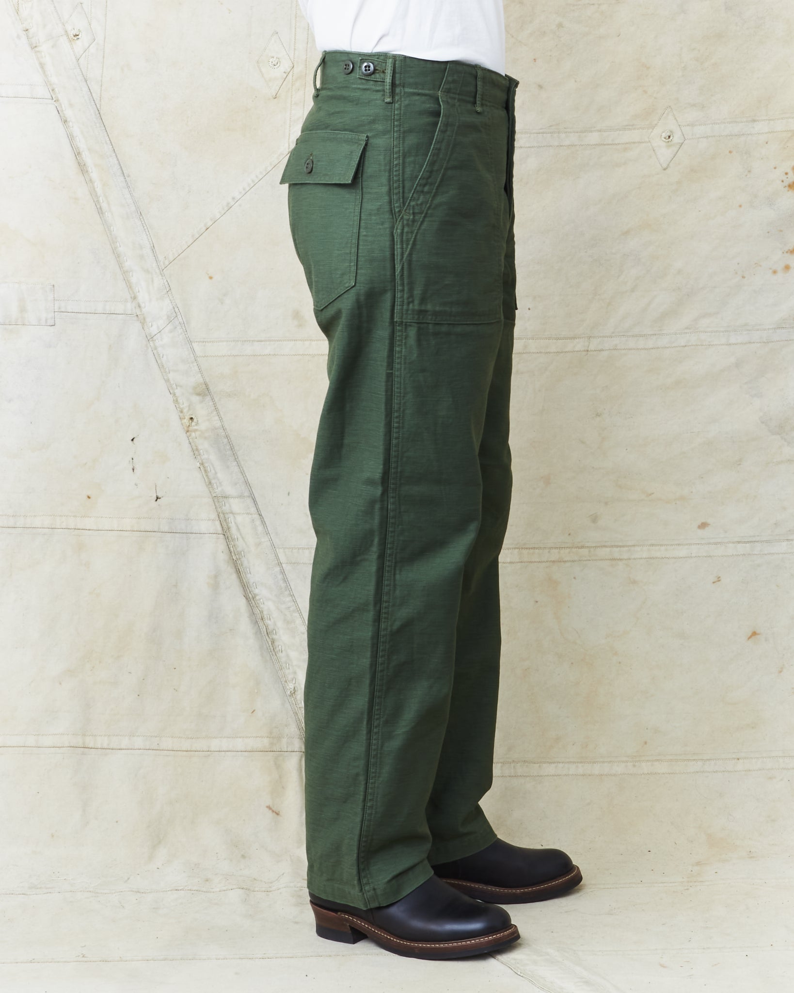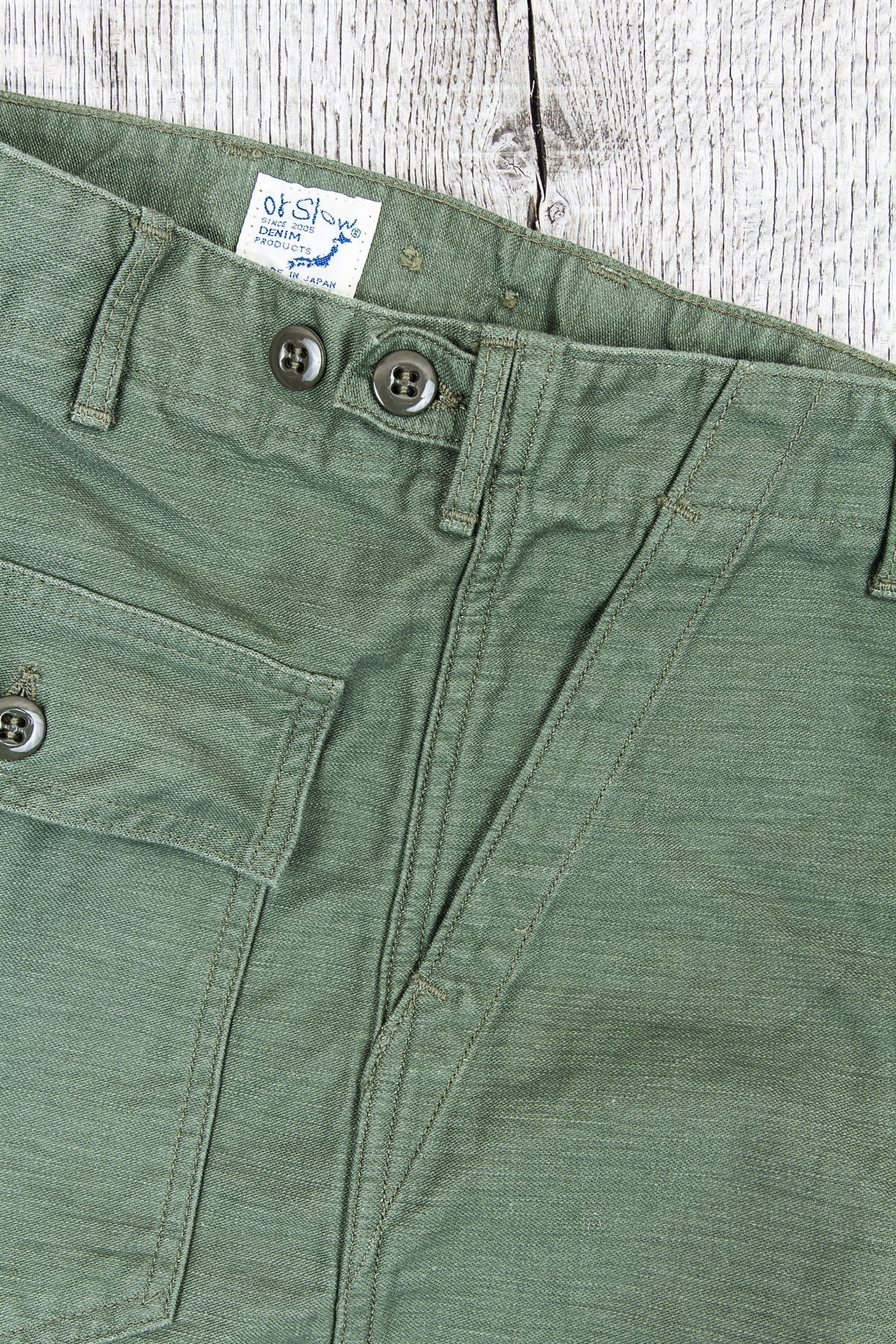 This is OrSlow's version of a classic fatigue pant, inspired by the cotton sateen pants used by the US Army in the middle of the last century. Fatigue pants are synonymous with patch pockets on the front and the square shaped pocket flaps covering the back pockets. These pants also have belt loops and adjusters on the side of the hips.