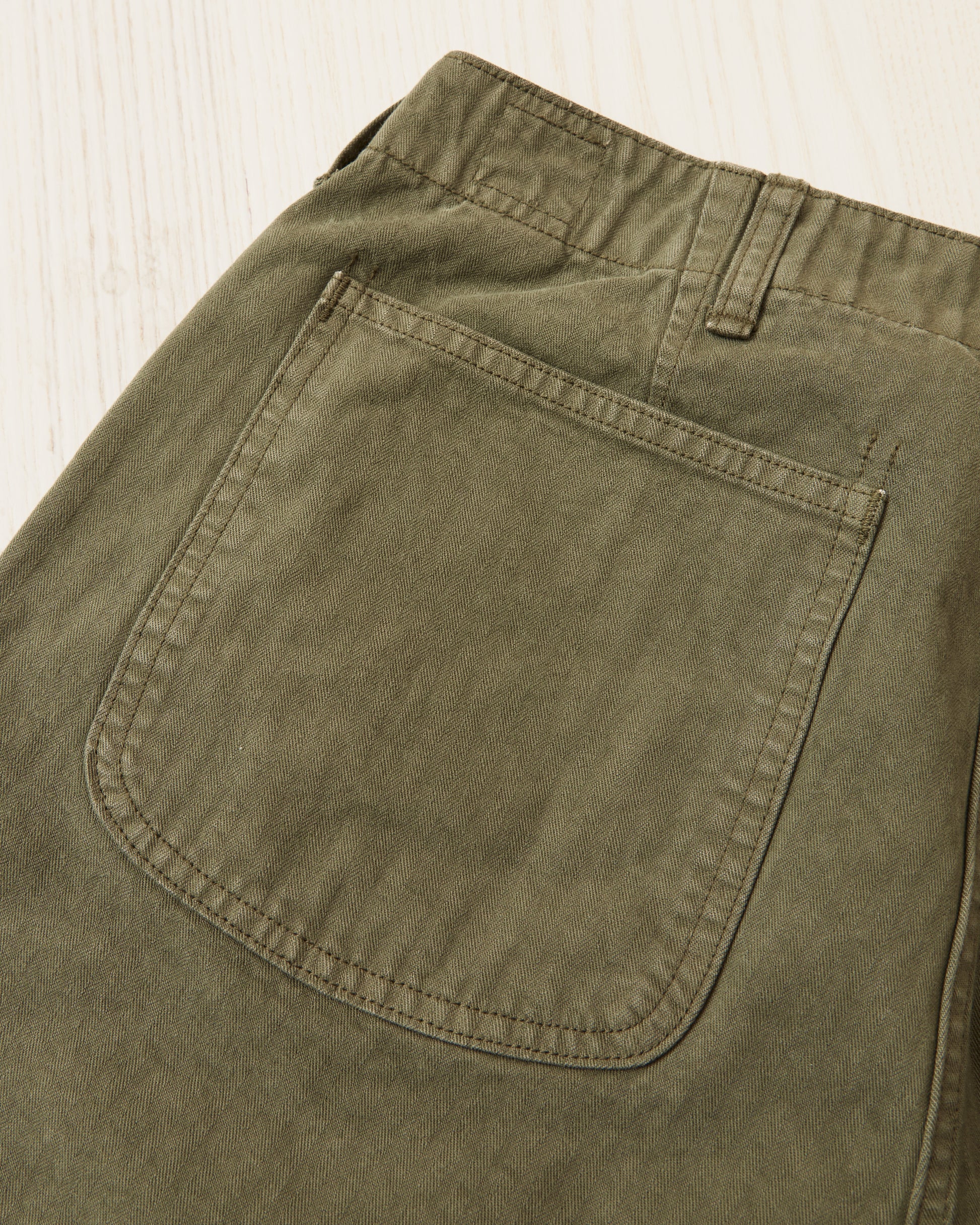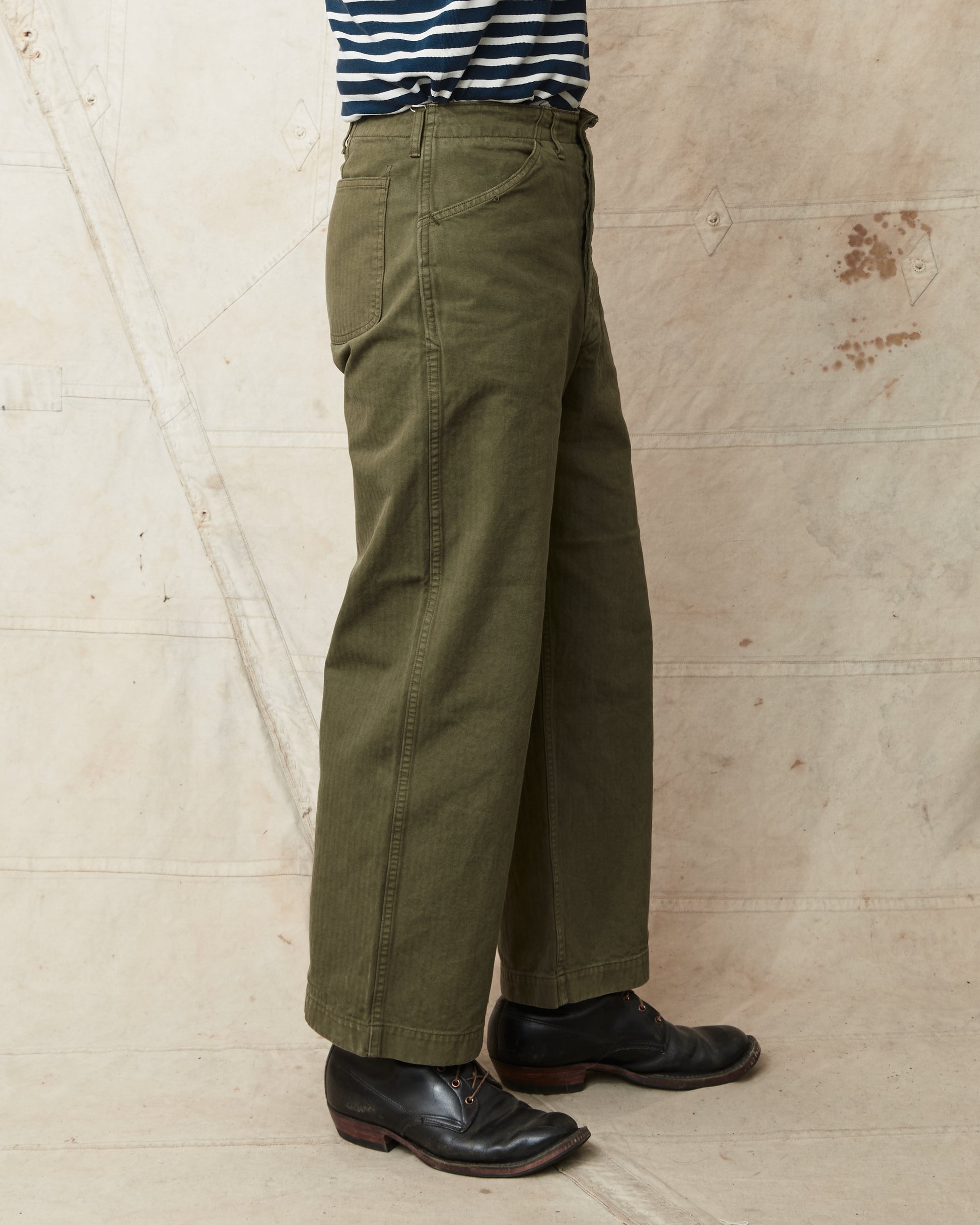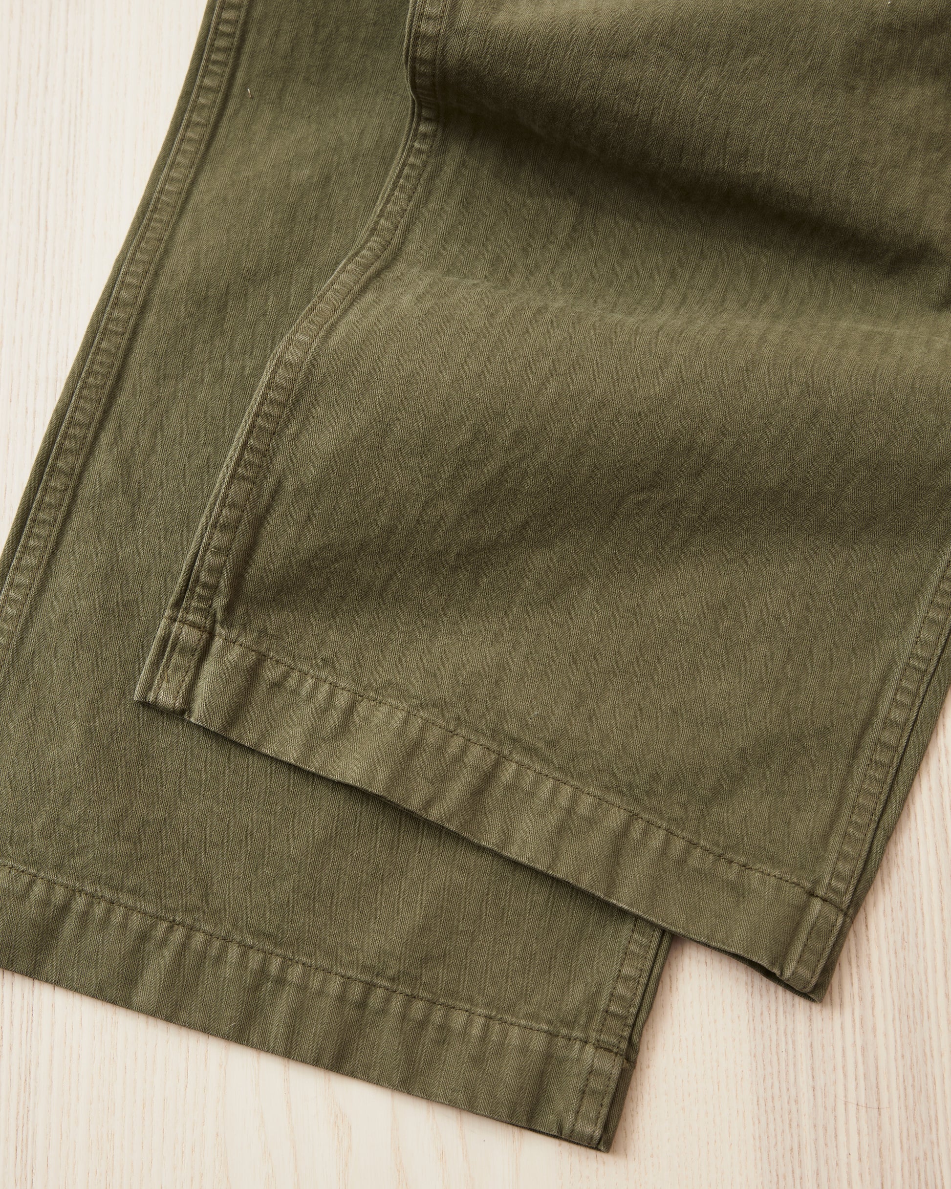 The fabric is a nice and sturdy cotton herringbone twill, a fabric that got it's name because the texture resembles the skeleton of a herring. This weaving technique is most commonly used in wool textiles and for more dressed up suits, but during the 40 and 50s it was also used for military and workwear garments. The cotton herringbone fabric was referred to as the "HBT twill" and the olive color in these will age beautifully when worn and washed, and look like a pair of authentic vintage pants from the 40's.