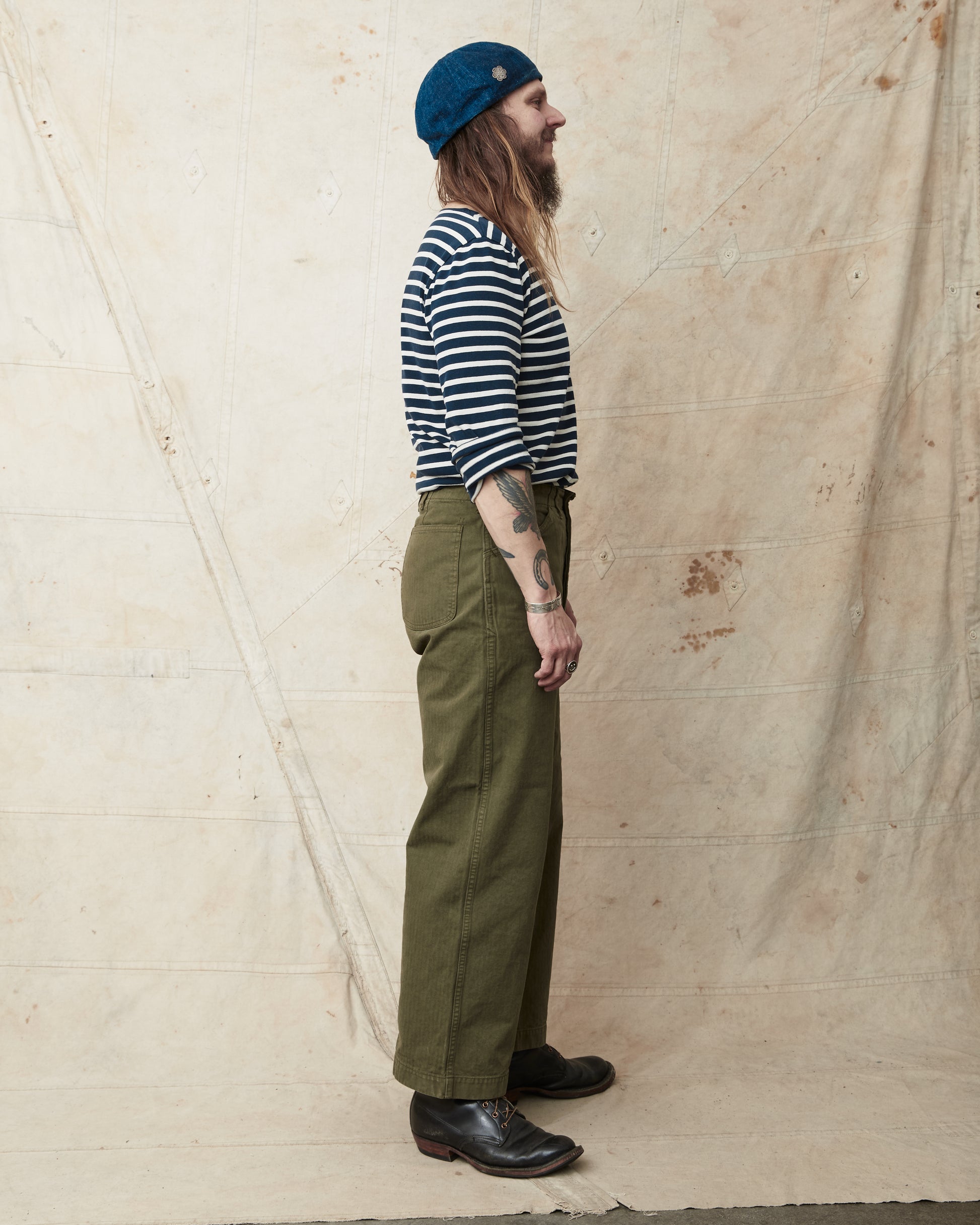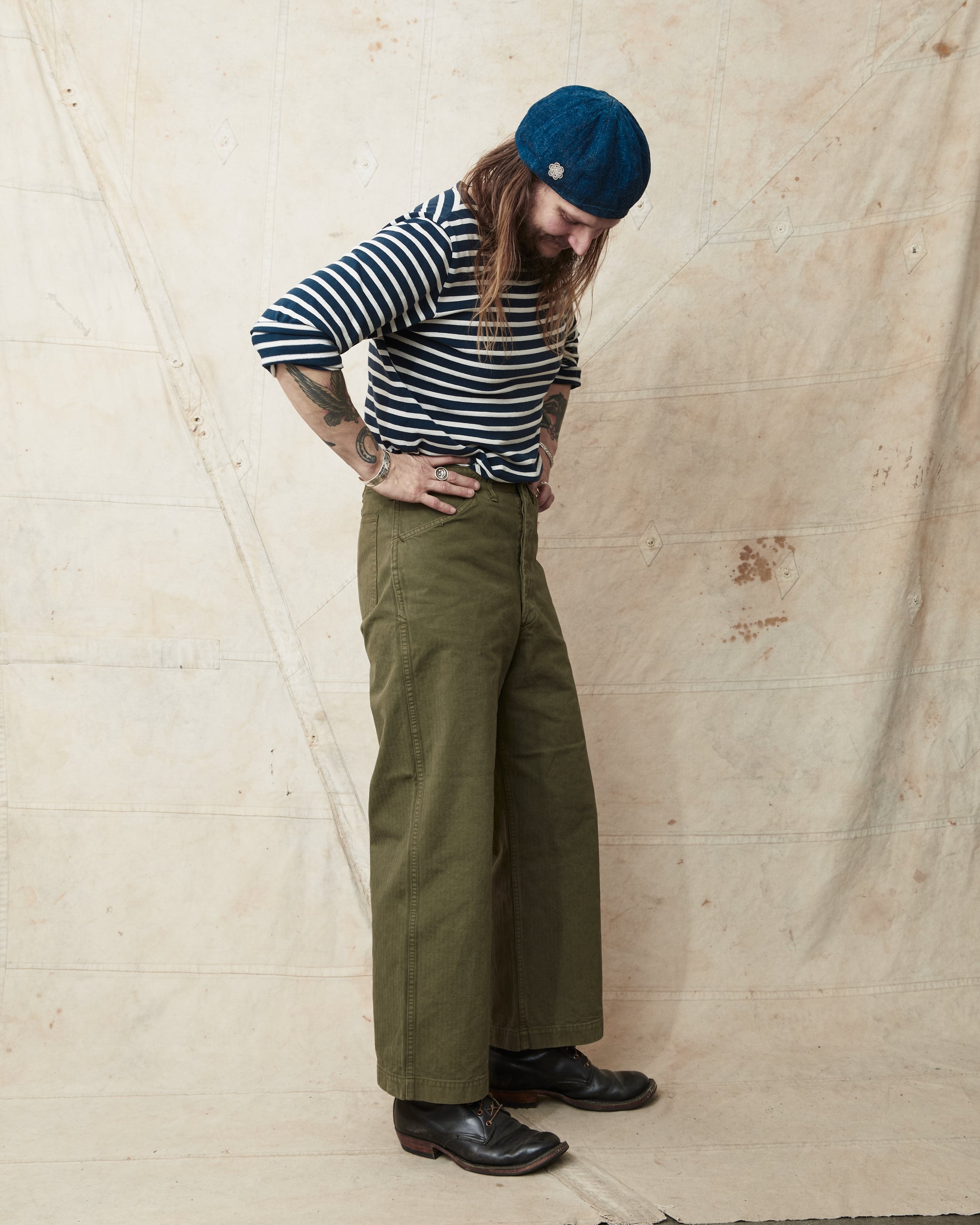 This is OrSlow version of a pair of classic pants created for USMC back in the 40's and these are a favorite of ours when it comes to vintage trousers. With few but well-chosen details, a high waist and wide leg, it is a great example of timeless design that looks as good today as it does in pictures of sailors wearing these while working on deck in the middle of the last century. The best thing about these pants in our opinion is that the fit looks just as good on men and women. We're always looking for clothes that can be worn by everyone and all genders and these pants are the best we've found so far.