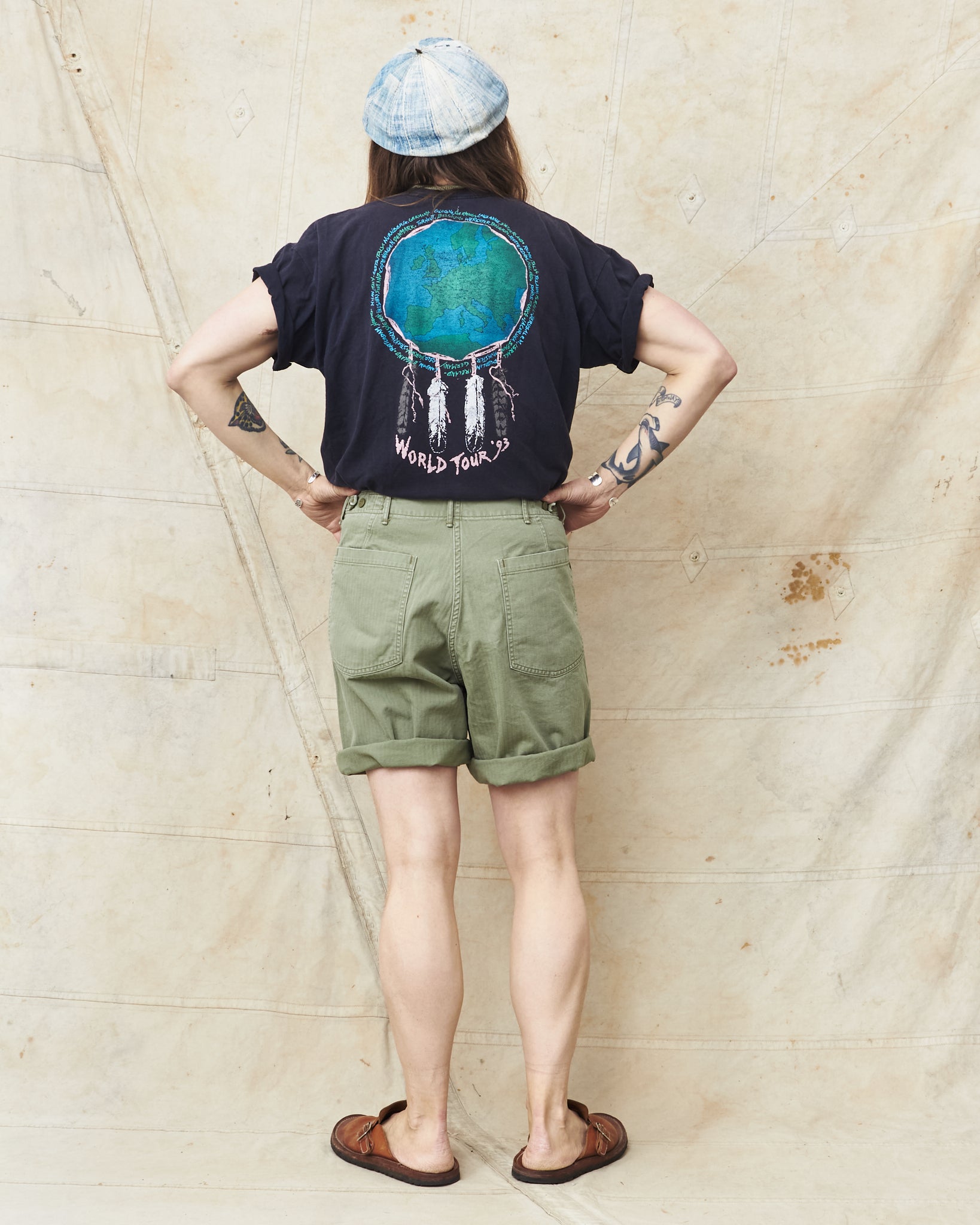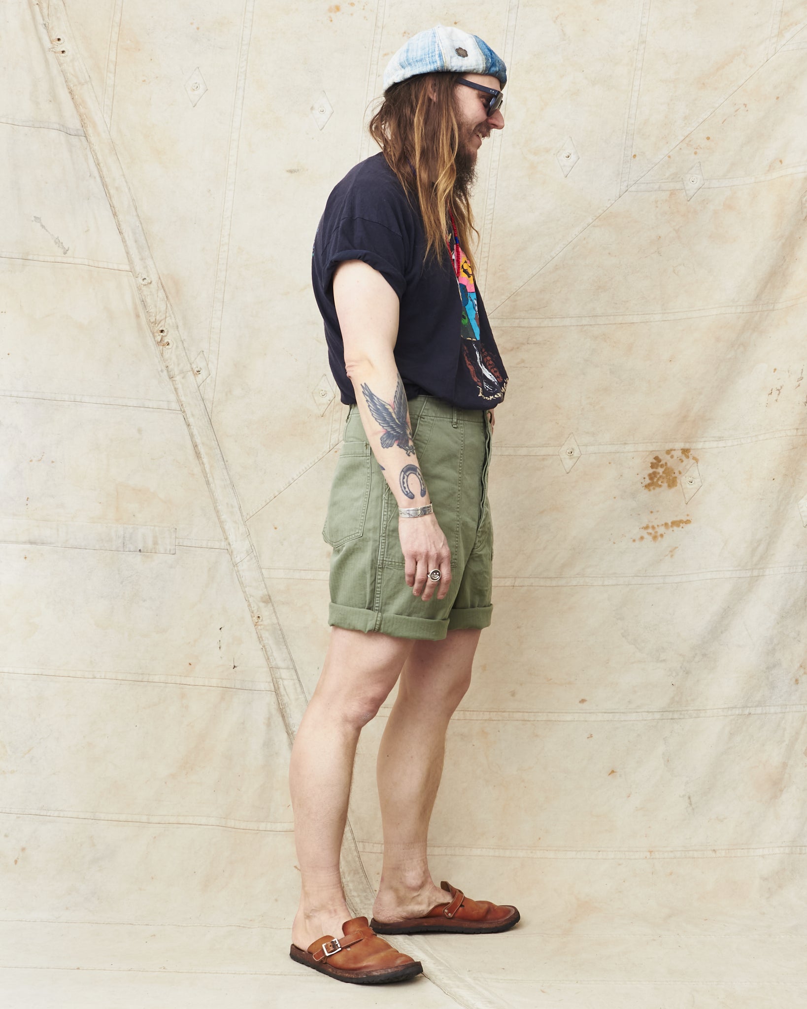 This is OrSlow's version of a classic fatigue shorts. It's the same cut as the fatigue pant but made as shorts. Fatigue pants/shorts are synonymous with patch pockets on the front and the square shaped pocket flaps covering the back pockets with details such as belt loops and adjusters on the side of the hips. They are made in a cotton sateen fabric, produced today in the same way as it were back in the middle of the last century.