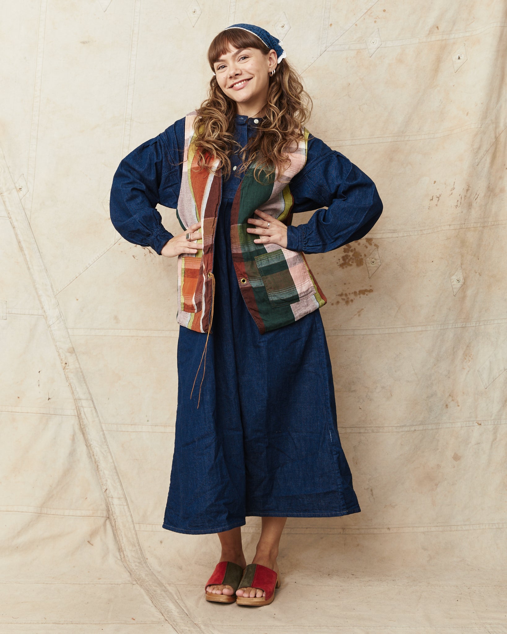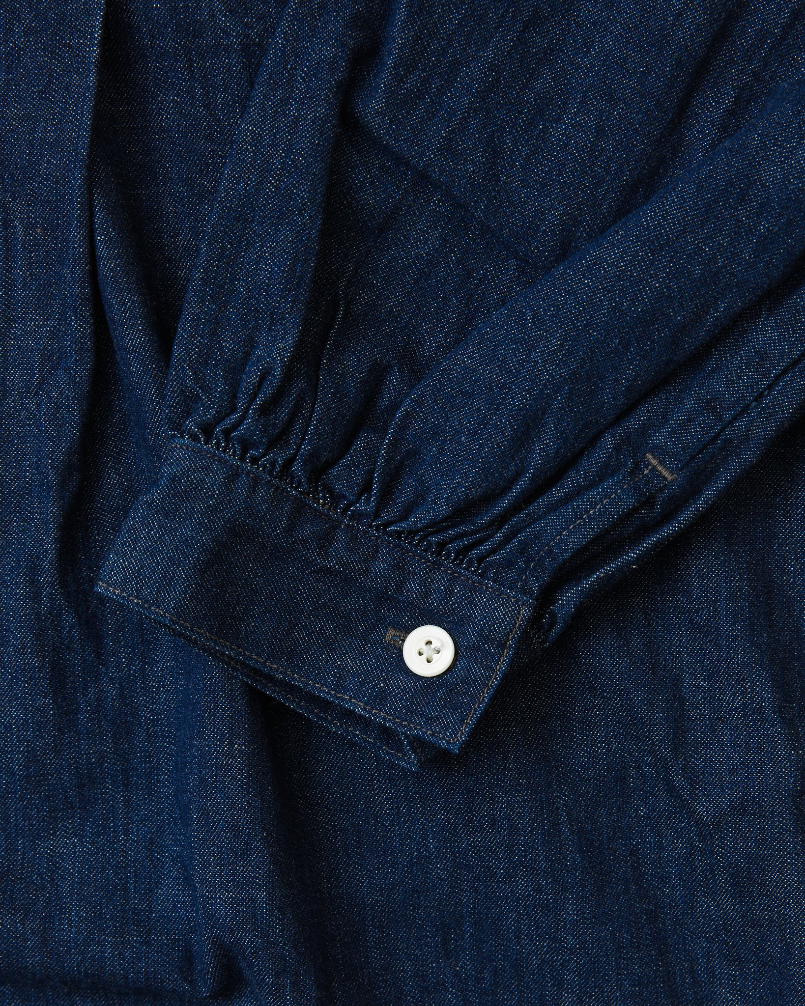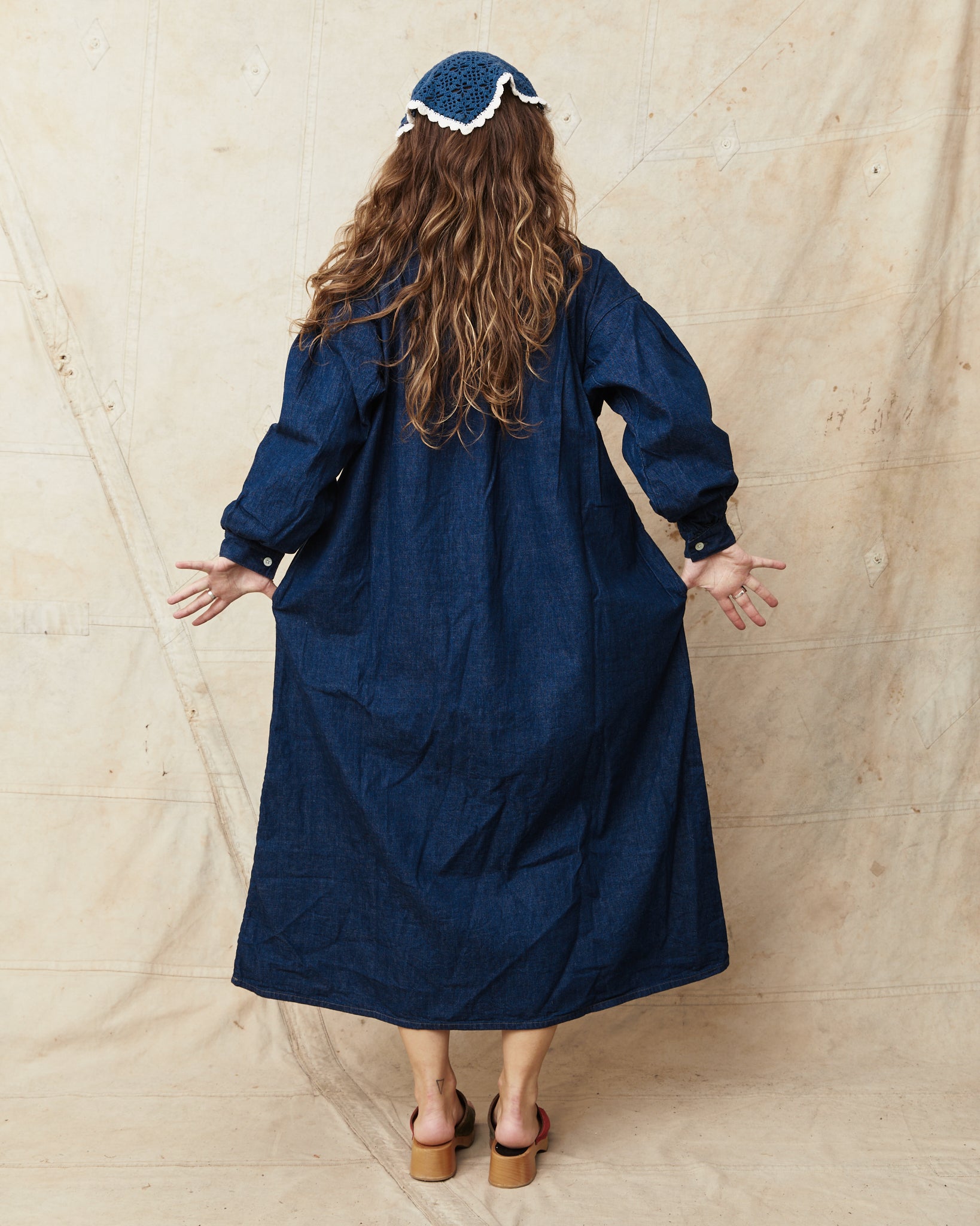Made of a thin denim fabric that has been washed once which gives the dress a great drape and a beautiful shine of blue indigo color.