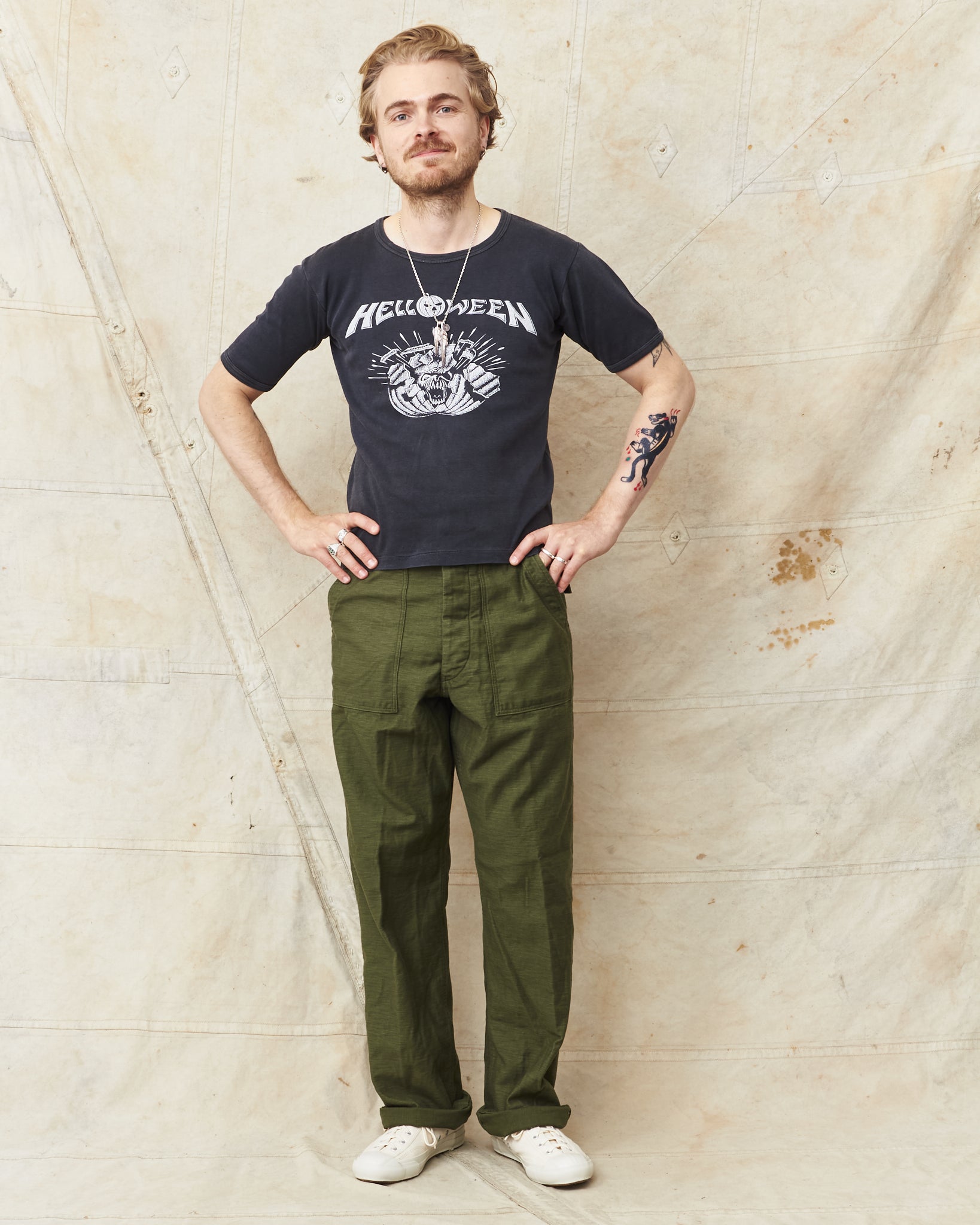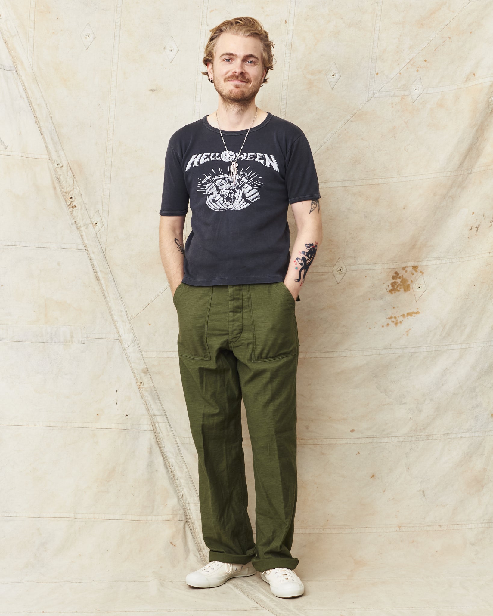 They are made of cotton fabric, produced today in the same way as they were made in the middle of the last century. They look just perfect combined with a faded denim jacket or a thick wool sweater during winter.
