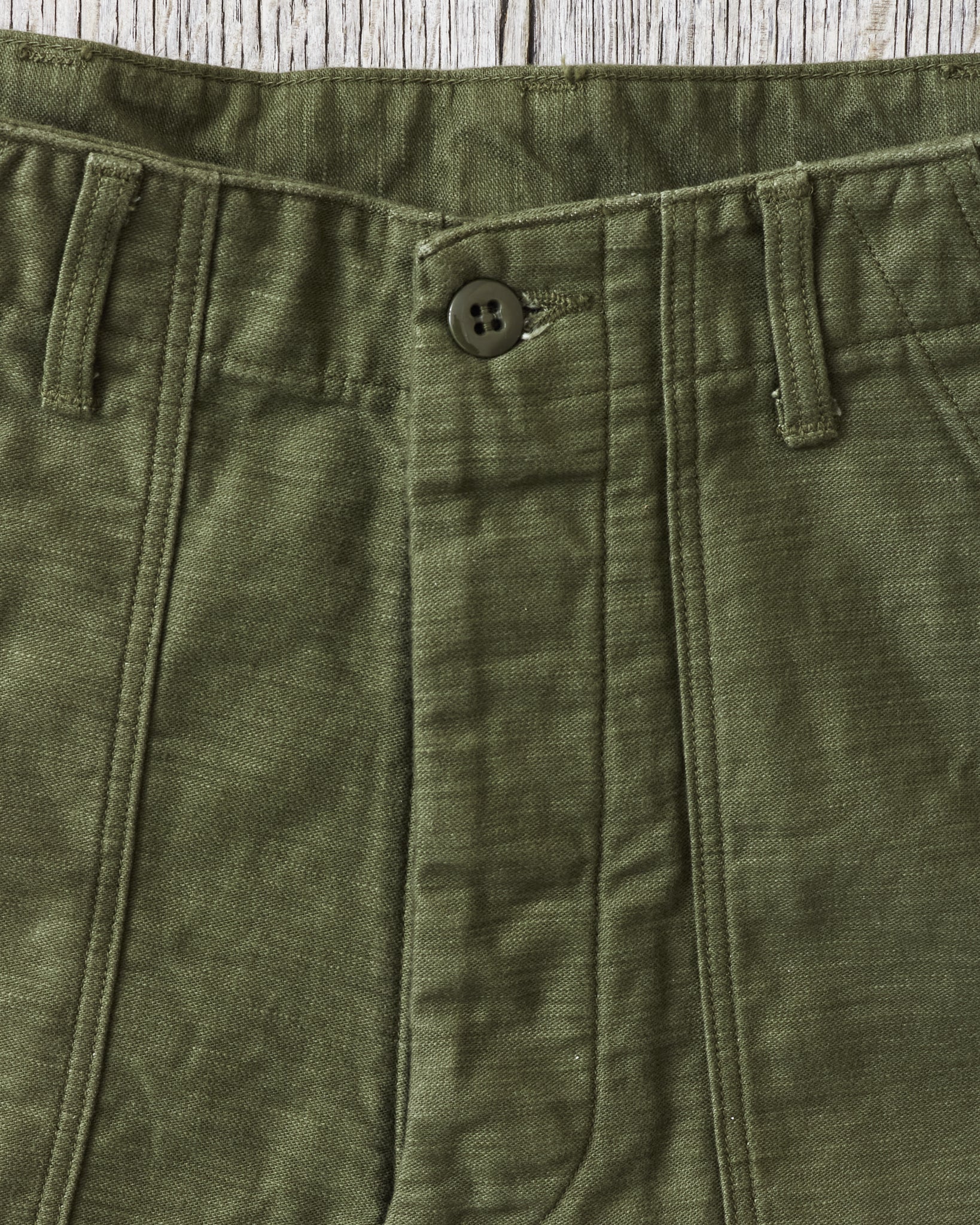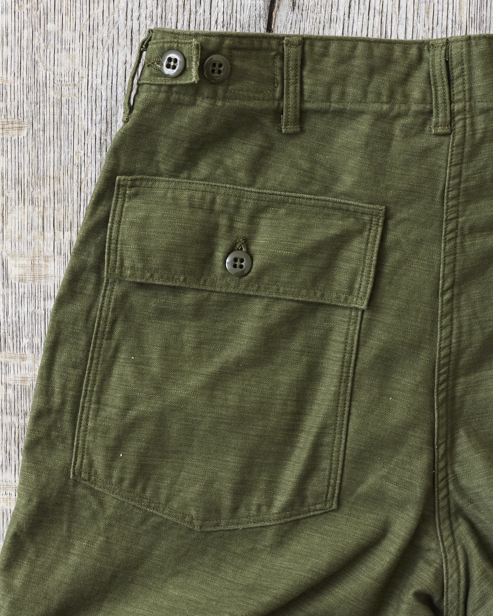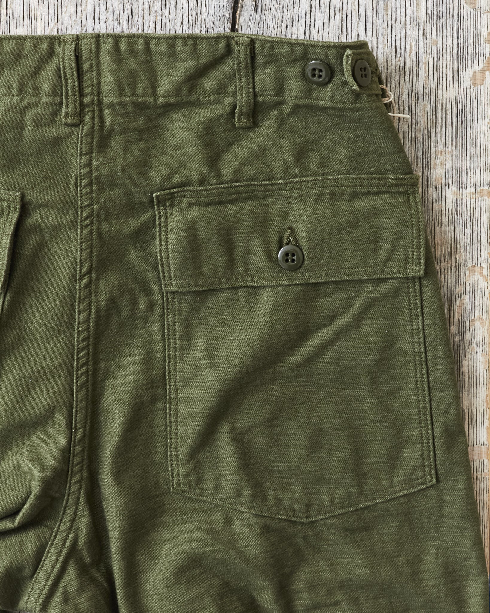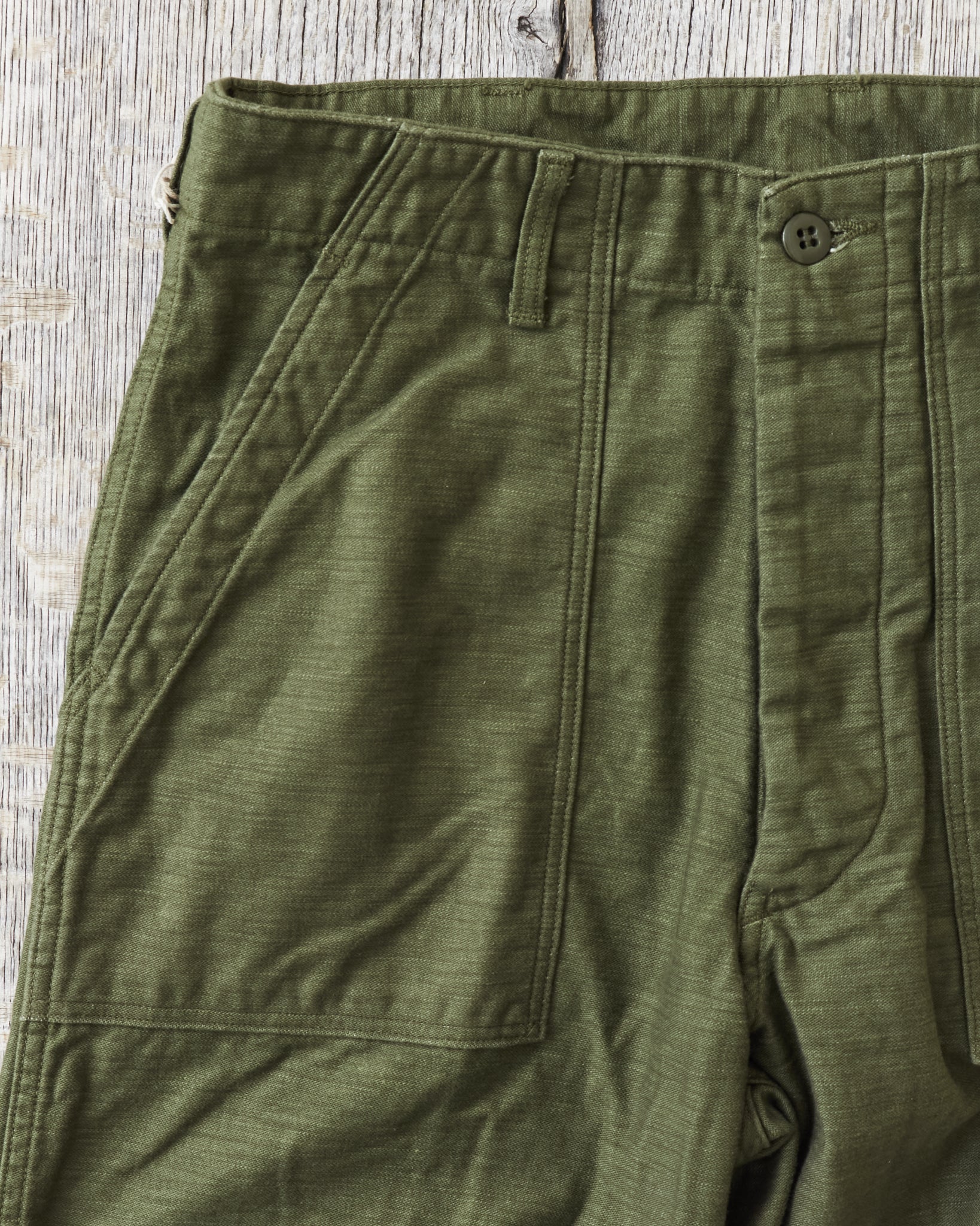 This is OrSlow's reproduction of a classic fatigue pant, the cotton sateen pants used by the US Army in the middle of the last century. Fatigue pants are synonymous with patch pockets on the front and the square shaped pocket flaps covering the back pockets. These pants also have belt loops and adjusters on the side of the hips. Compared to the 5002, these are wider in the legs, higher in the waist and got a deeper green color in the fabric.