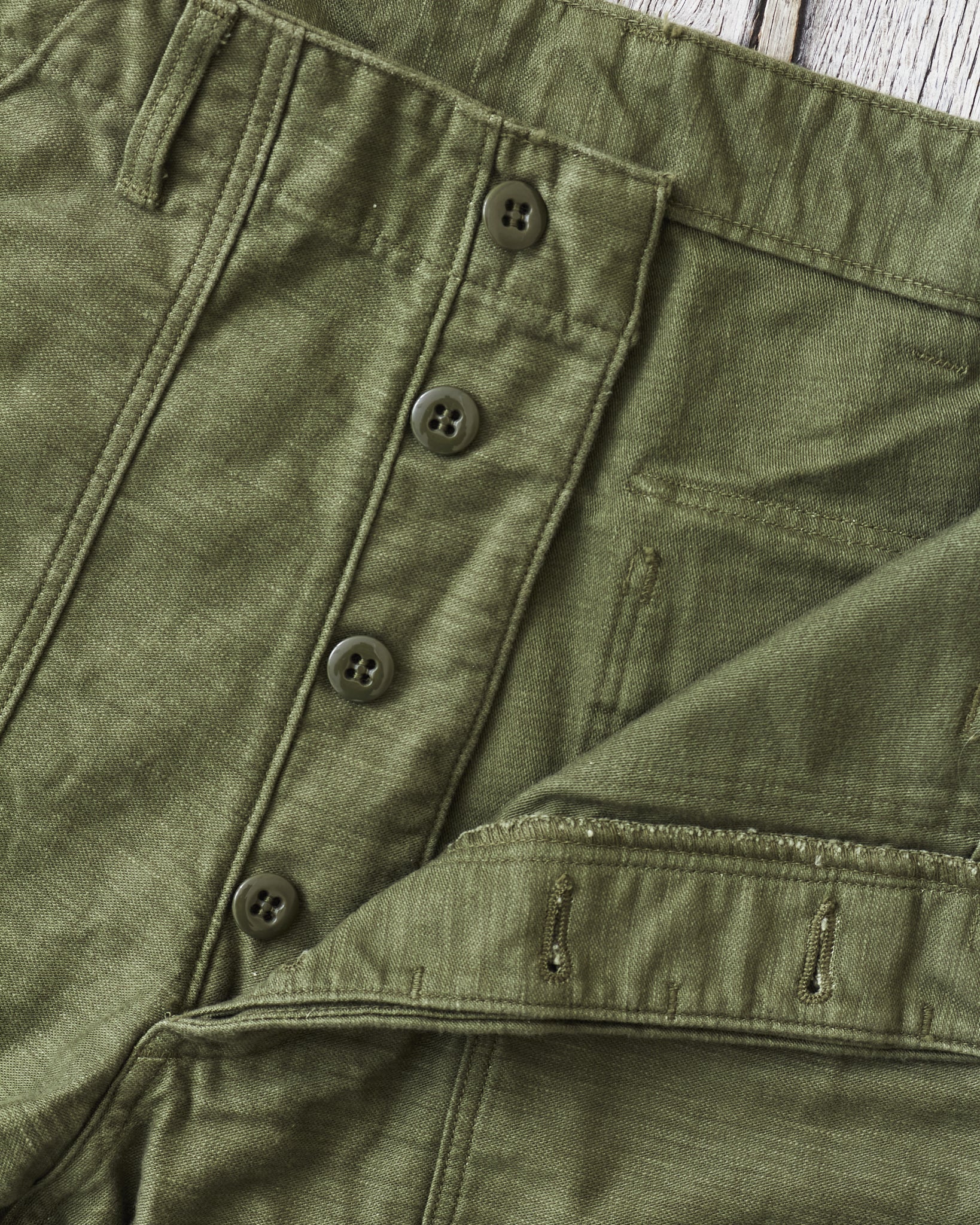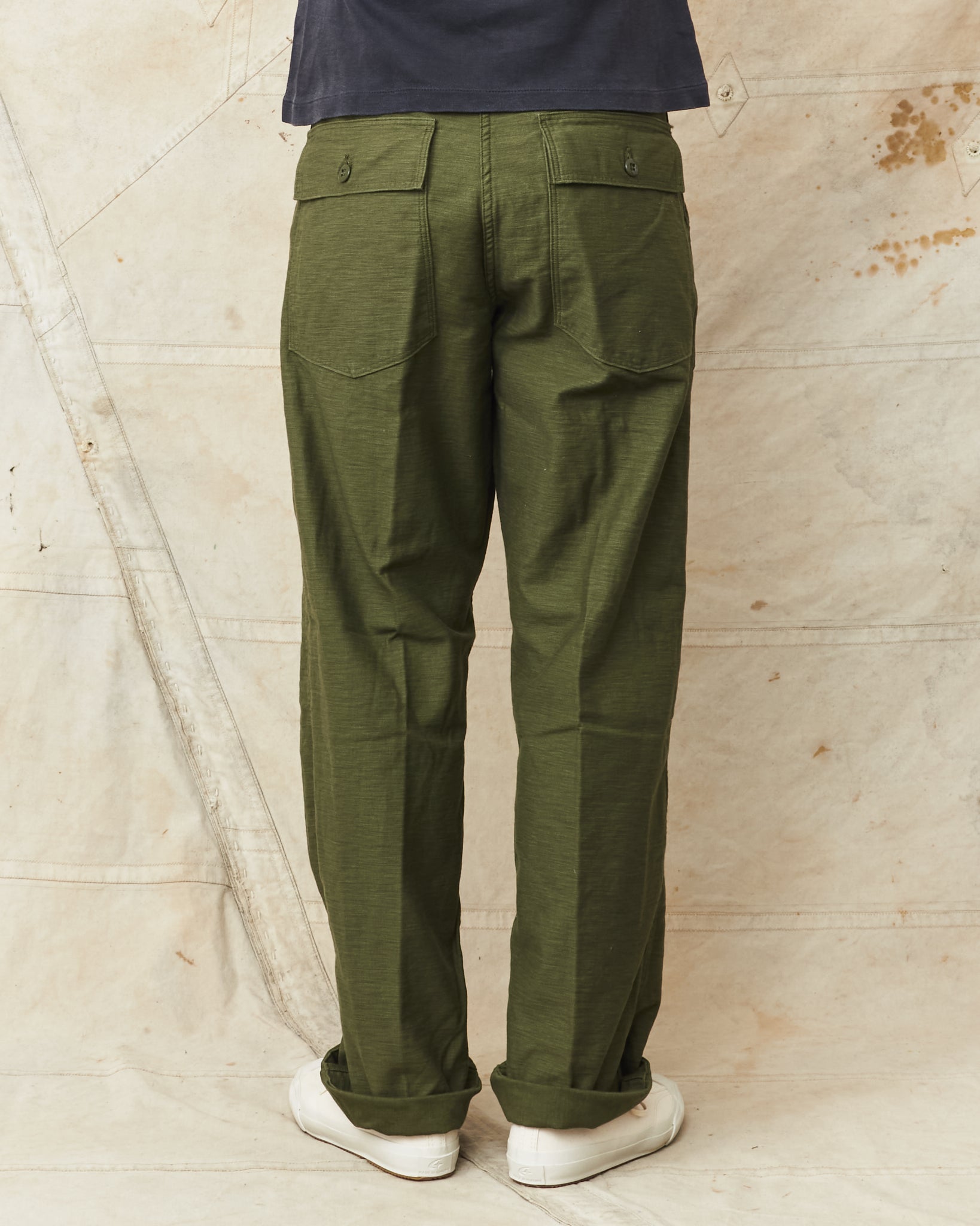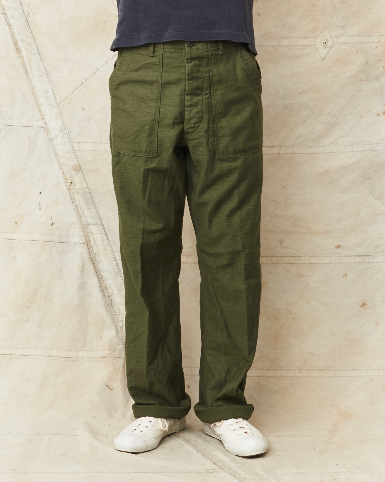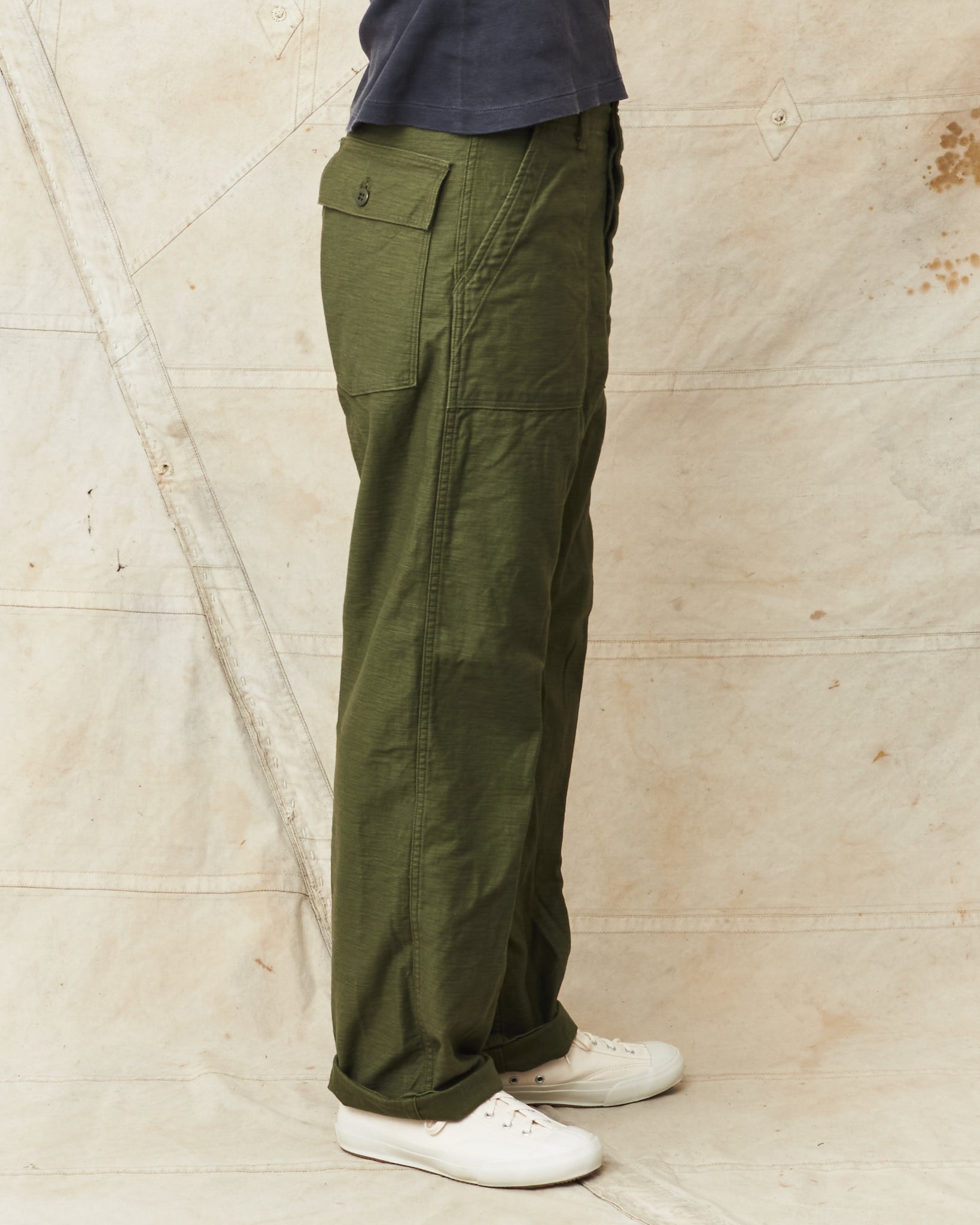 This is OrSlow's reproduction of a classic fatigue pant, the cotton sateen pants used by the US Army in the middle of the last century. Fatigue pants are synonymous with patch pockets on the front and the square shaped pocket flaps covering the back pockets. These pants also have belt loops and adjusters on the side of the hips. Compared to the 5002, these are wider in the legs, higher in the waist and got a deeper green color in the fabric.