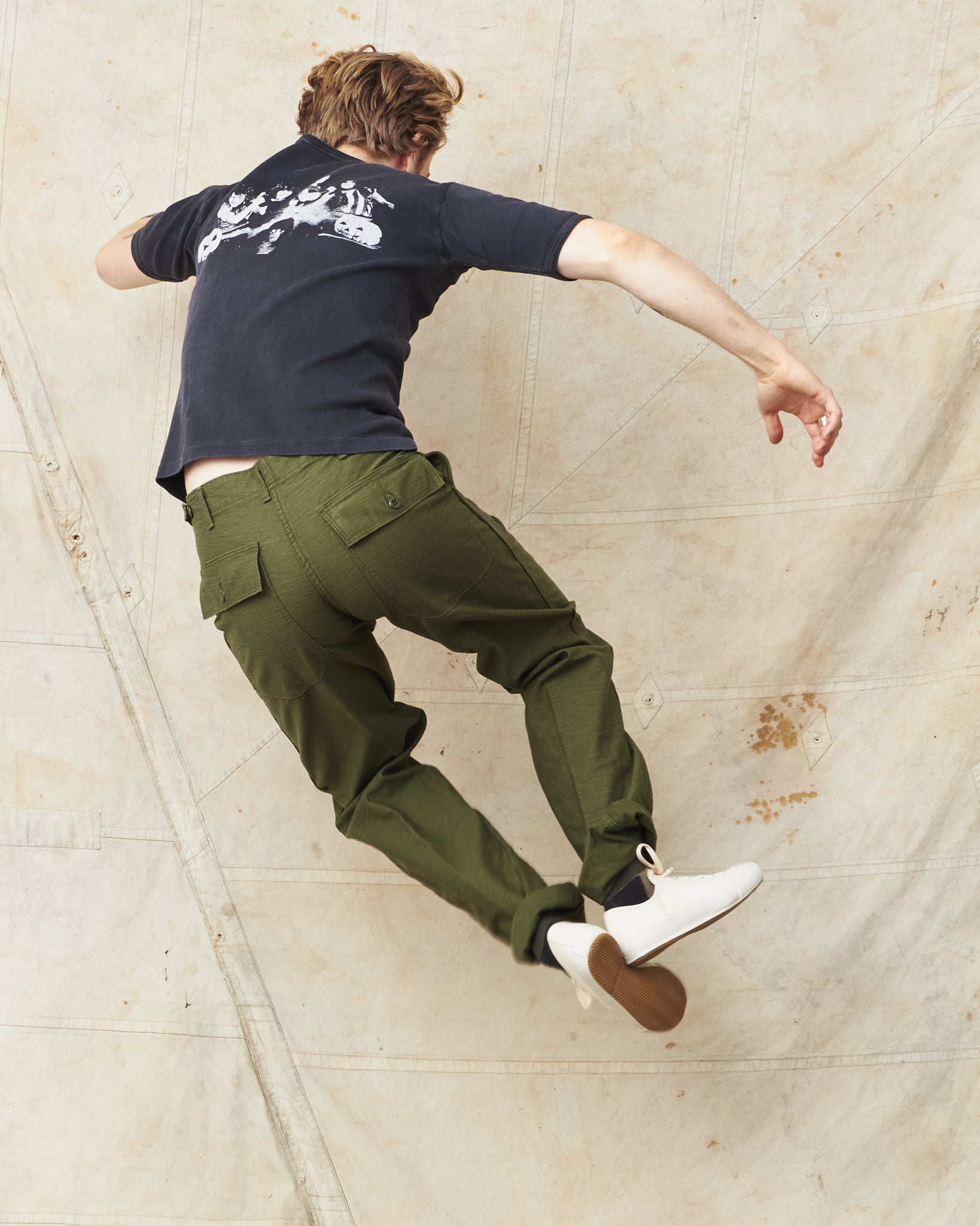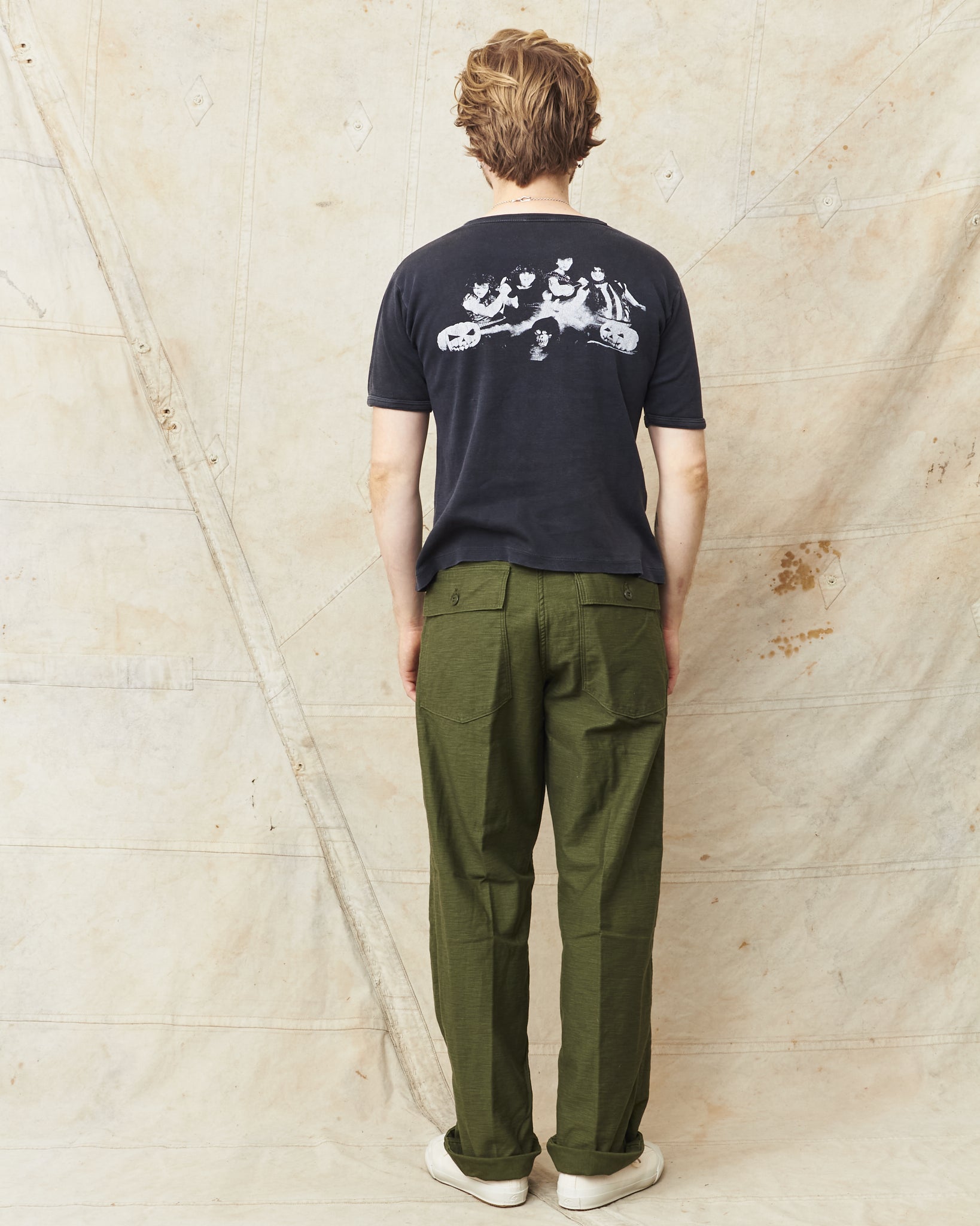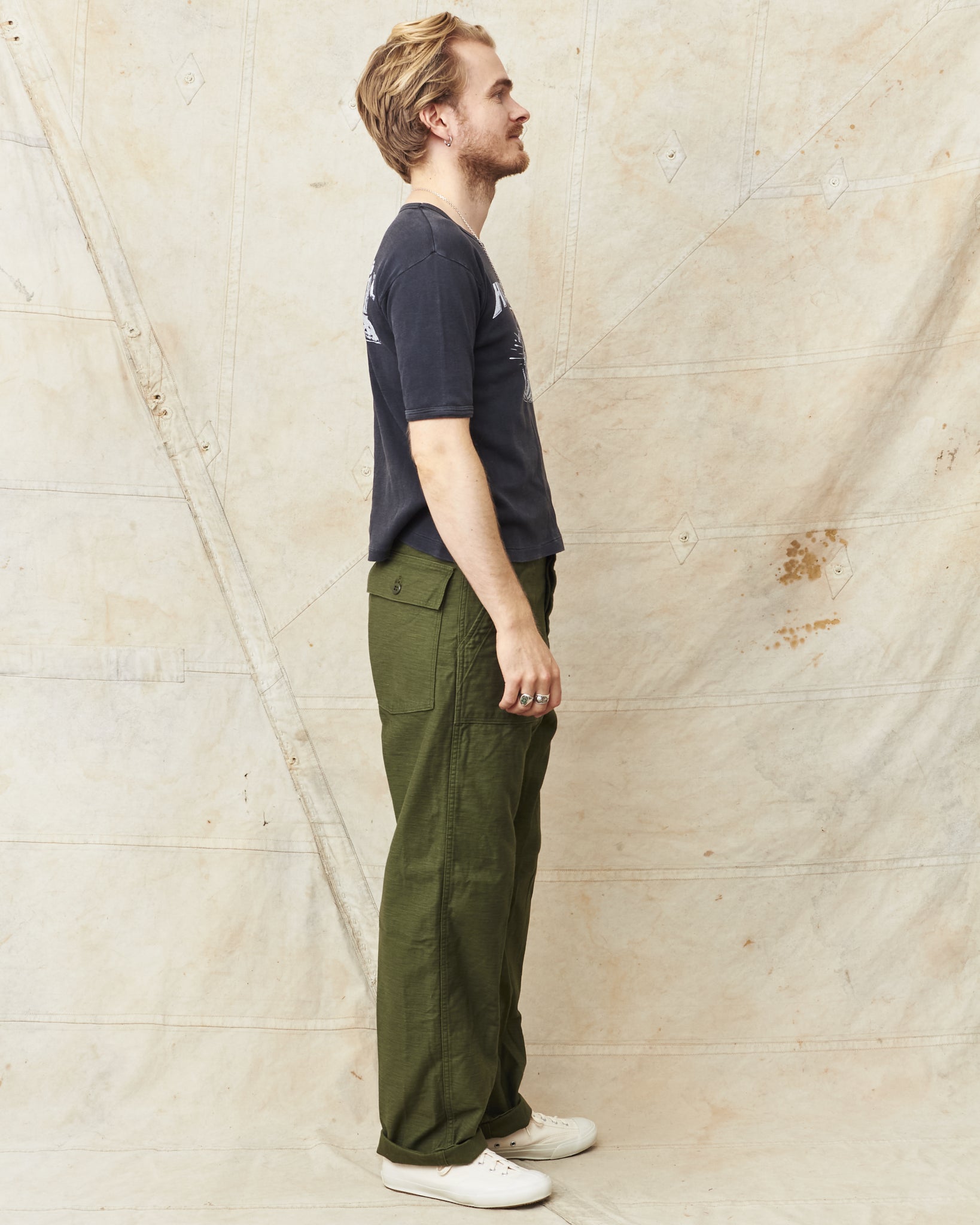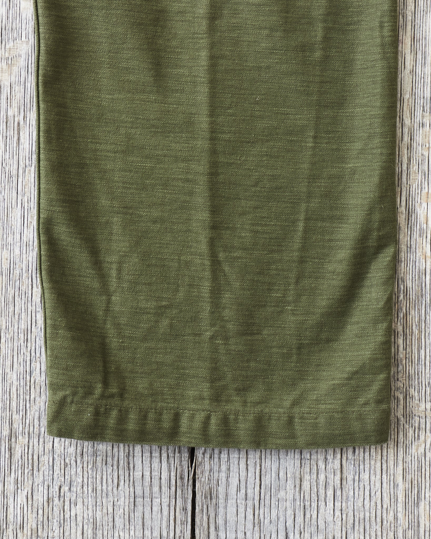 This is OrSlow's reproduction of a classic fatigue pant, the cotton sateen pants used by the US Army in the middle of the last century. Fatigue pants are synonymous with patch pockets on the front and the square shaped pocket flaps covering the back pockets. These pants also have belt loops and adjusters on the side of the hips. Compared to the 5002, these are wider in the legs, higher in the waist and got a deeper green color in the fabric.