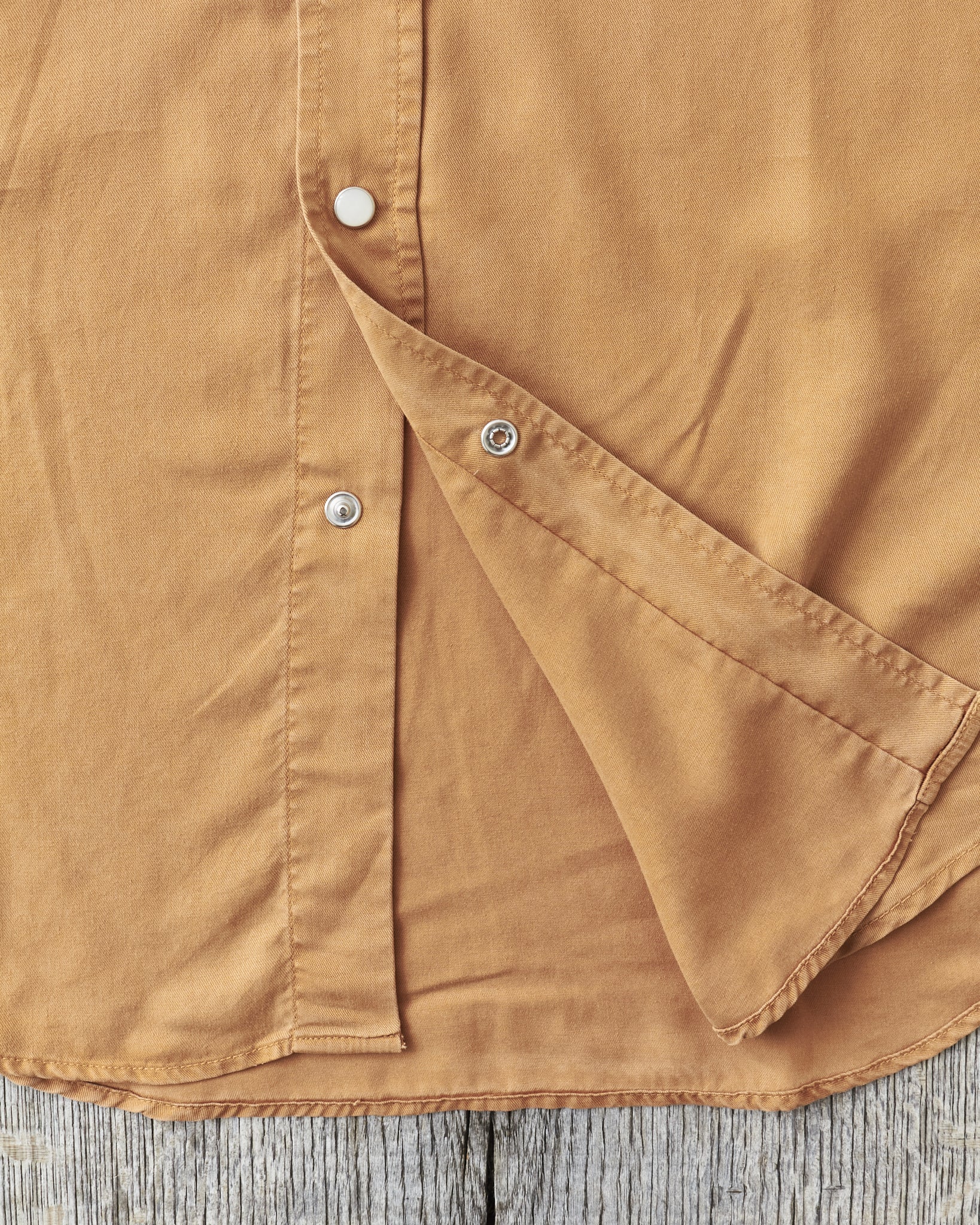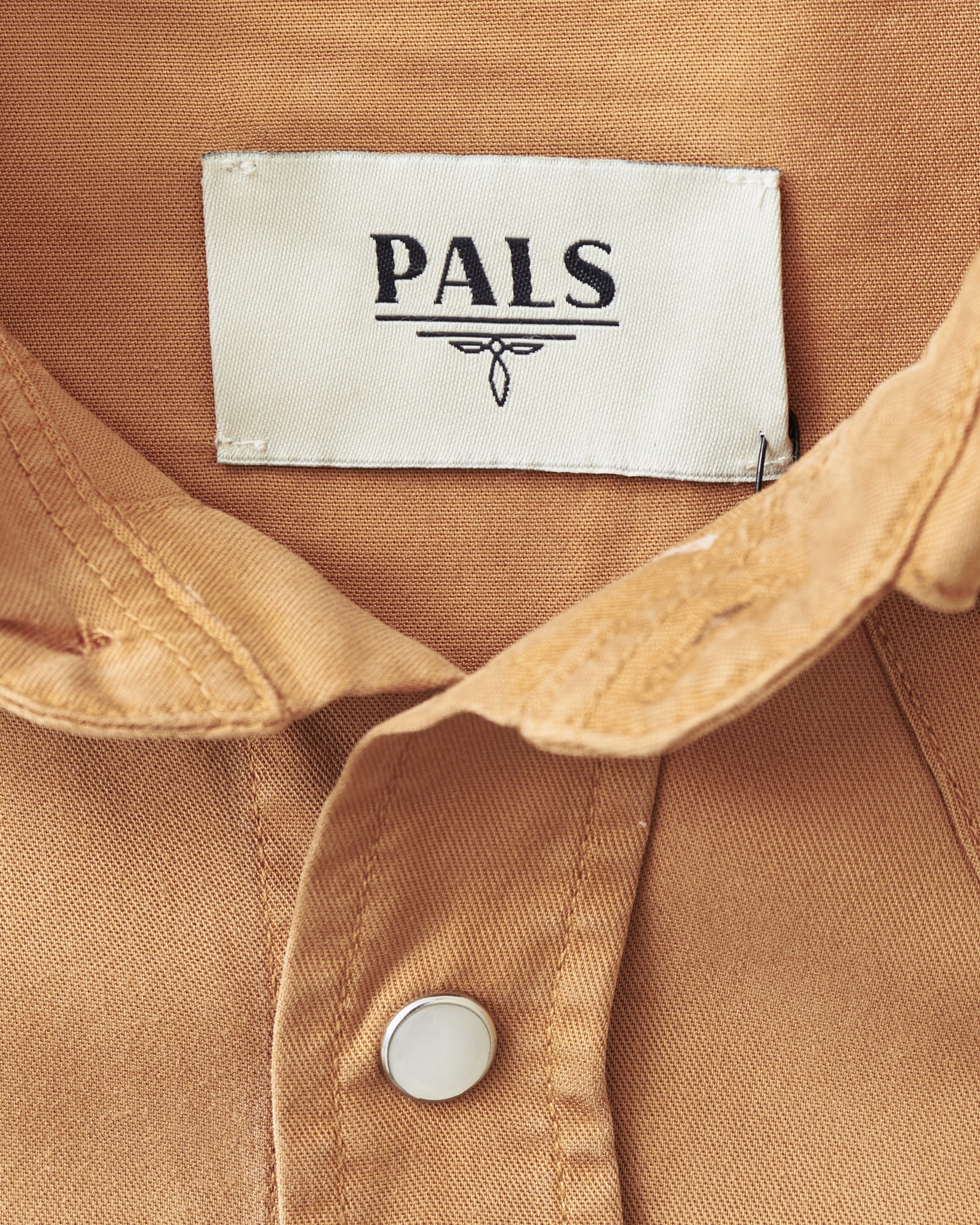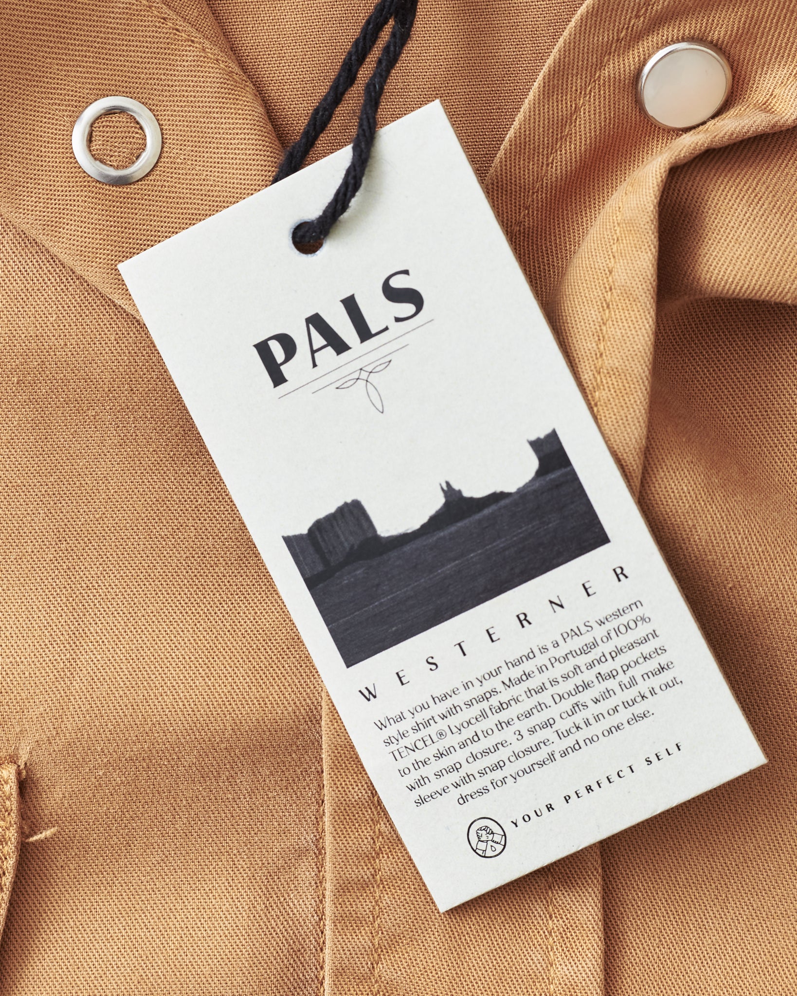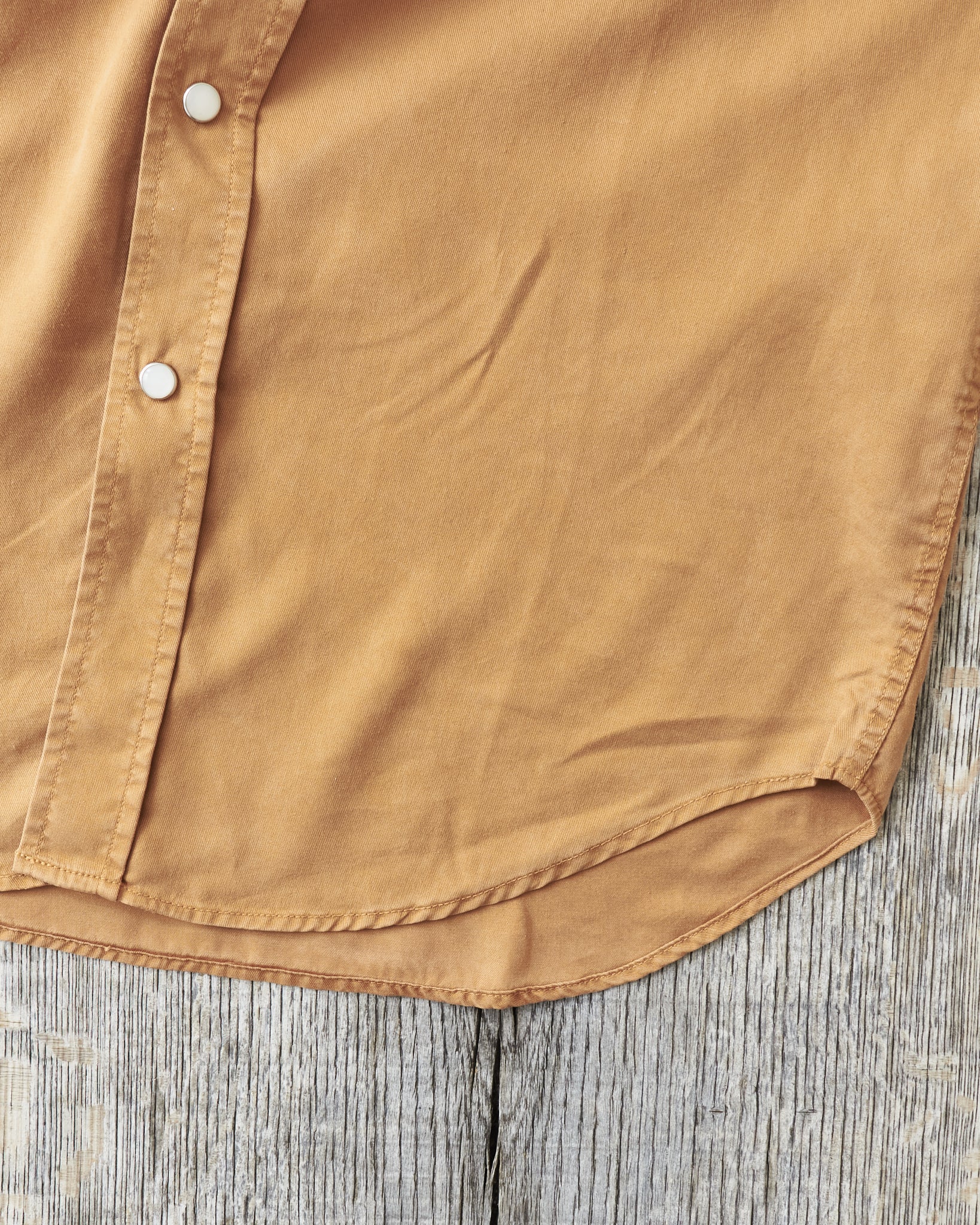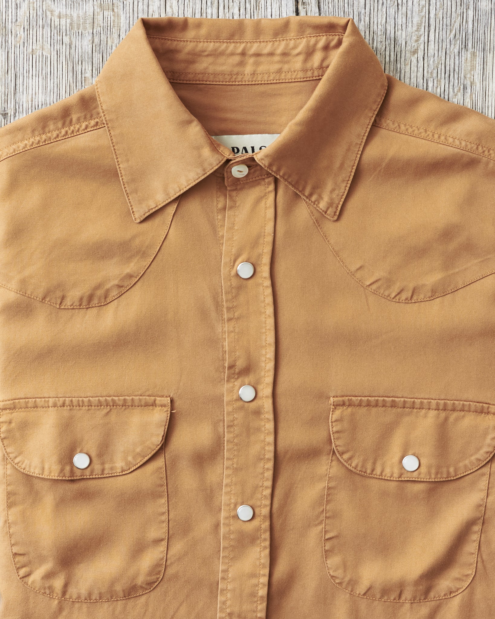 Pals Westerner shirt is made out of Tencel Lyocell fabric. The shirt is garment dyed. It has two chest pockets with flaps, rounded western yokes and of course, Western buttons. The fabric is considered very sustainable and it also has a silky feel that drapes nicely. Since being garment dyed, the shirt has a slightly faded color, reminiscent of days spent under the southwestern sun.