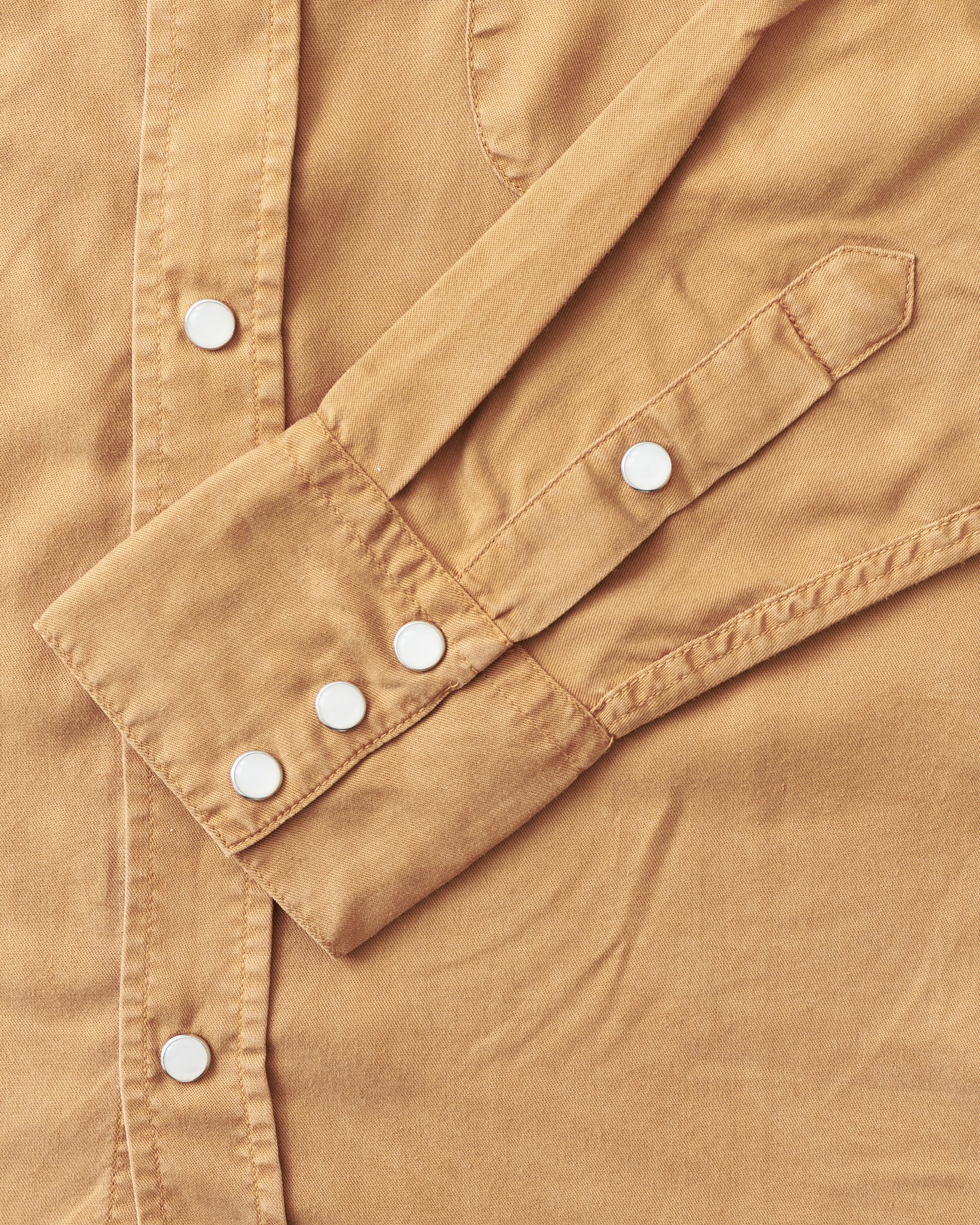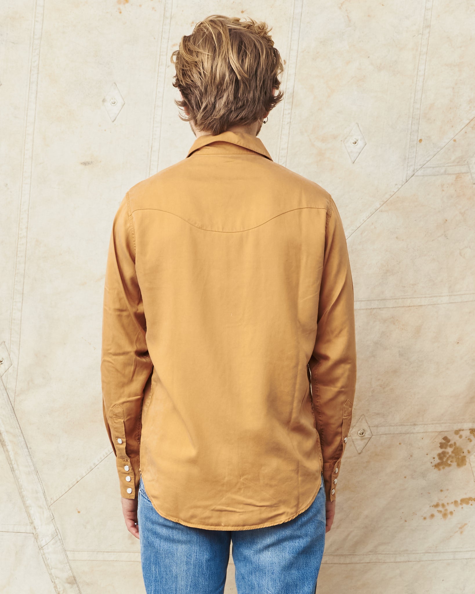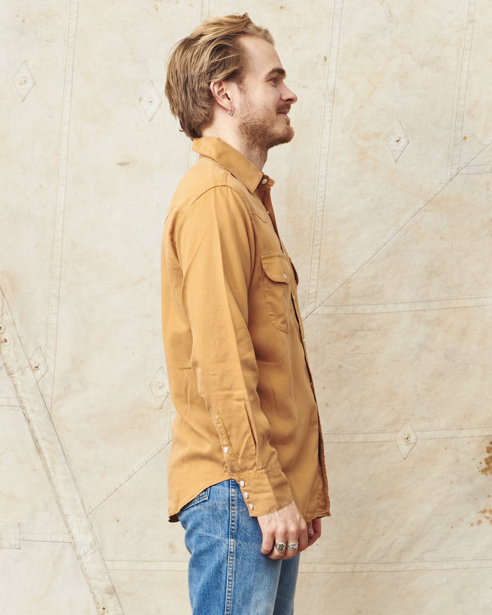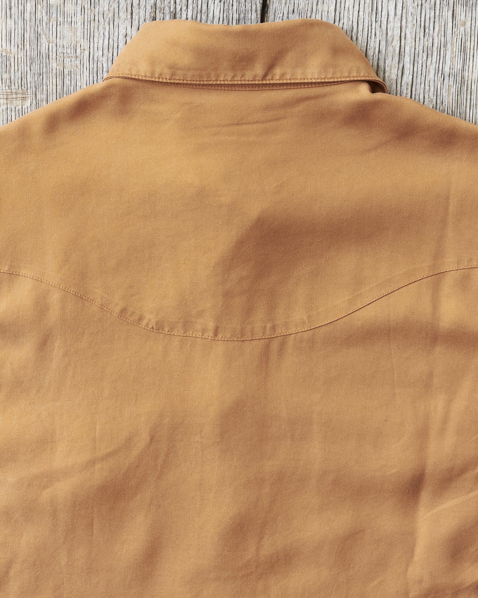 Pals Westerner shirt is made out of Tencel Lyocell fabric. The shirt is garment dyed. It has two chest pockets with flaps, rounded western yokes and of course, Western buttons. The fabric is considered very sustainable and it also has a silky feel that drapes nicely. Since being garment dyed, the shirt has a slightly faded color, reminiscent of days spent under the southwestern sun.