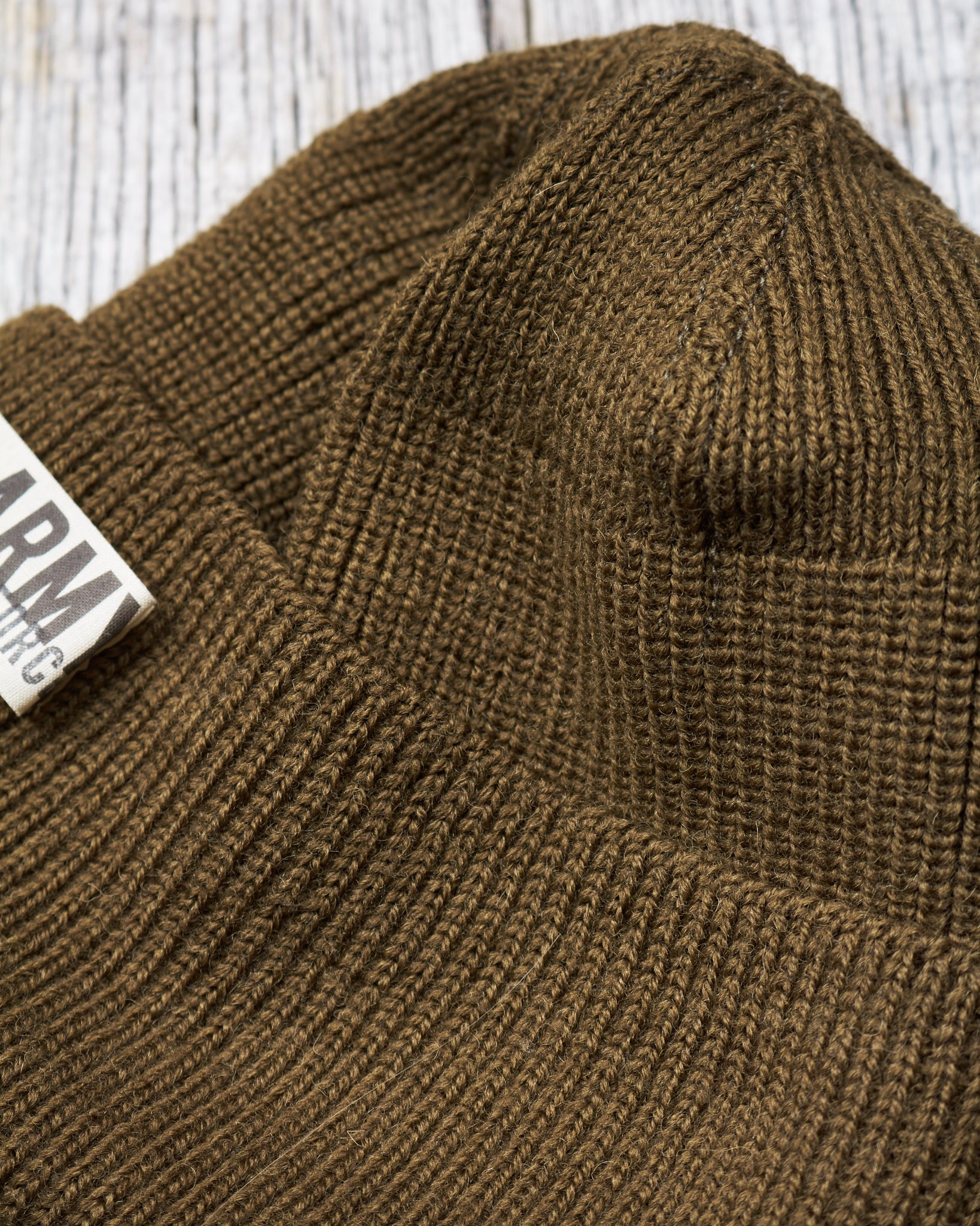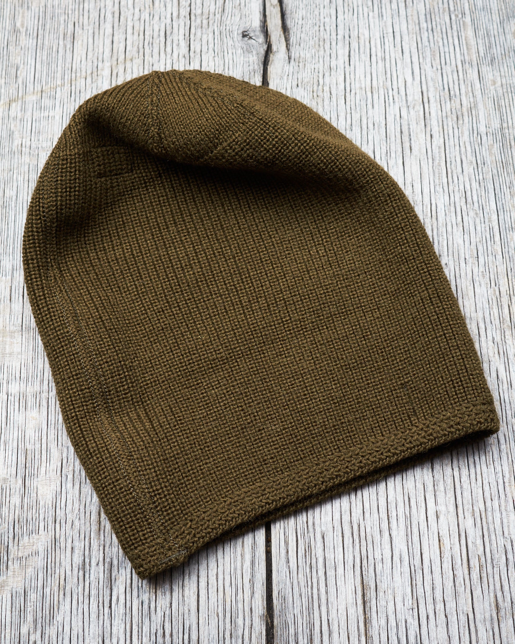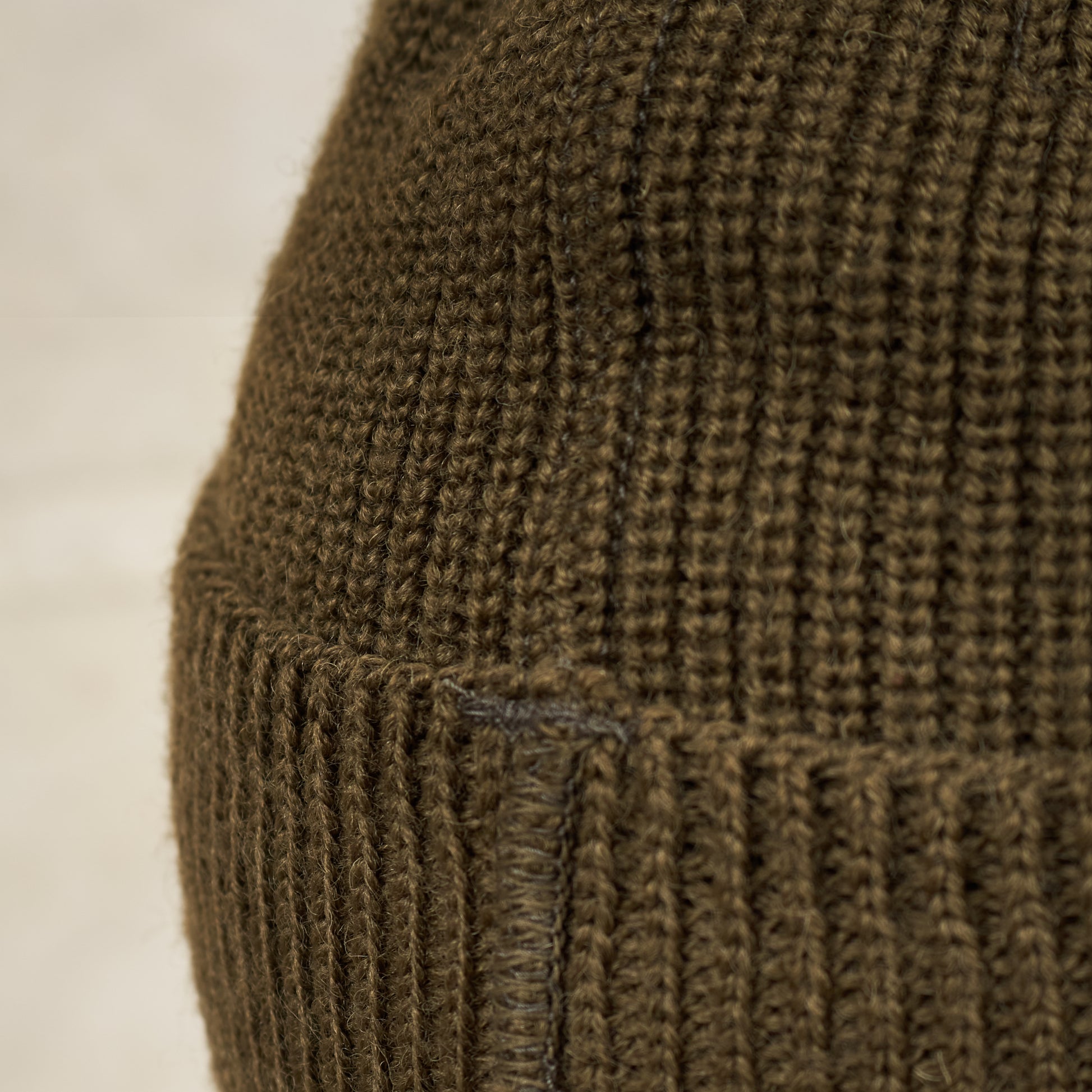This is a Papa Nui reproduction of the classic USN General Issue Watch Cap in a Amphibious Forces Khaki edition. Its a beautiful rendention of the classic WWII Naval knit, fully machined knitted in Japan in pure wool and featuring a Amphibious Forces U. S. Army contract tag. The reason for the US Navy to wear wool is that wool has the natural capacity of keeping the heat even when soaking wet. If one would find oneself in an extreem situation where ones wool clothes are soaked and the weather is cold you should never undress the wool garments because it's ability to keep you warm could actually be a mater of life and death. That's also the reason why wool is our favorite fiber.