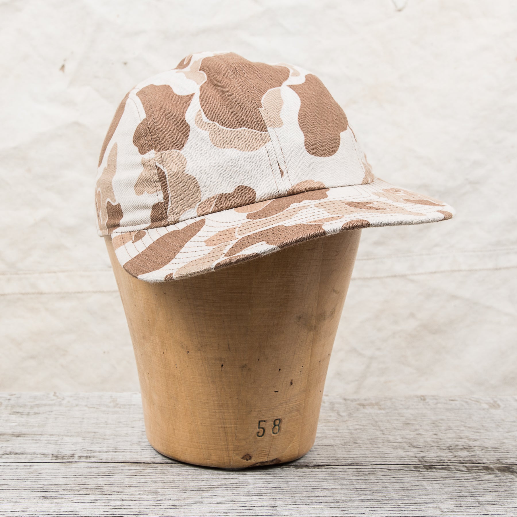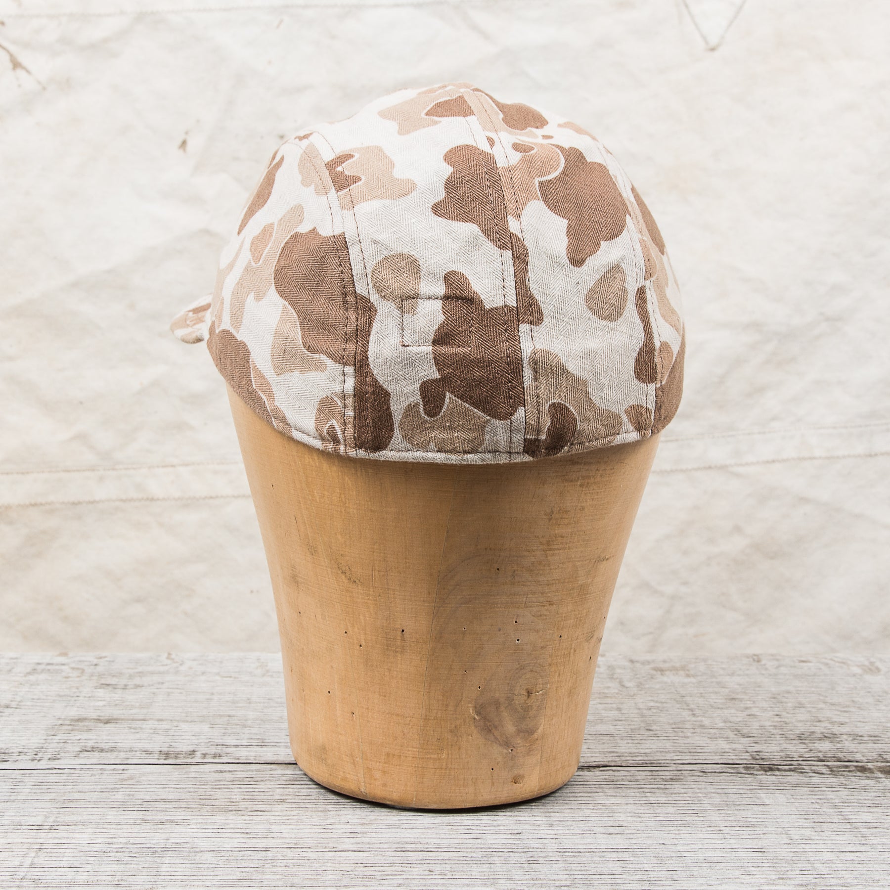 The Okinawa cap is made of a herringbone twill cotton fabric with the classic so called "Frogskin" camo pattern that was used by the US Marine Corp during WWII, this unique camo pattern was developed for a jungle environment and is printed with two different patterns on each side of the fabric so garments made with it could be reversed inside out to meet the demands of troops in the field. The side used on the outside of this cap is known as the "Beach" side that is a sandy hue and the inside features a "Jungle" color scheme. While it's utility as camouflage in the urban jungle is questionable perhaps, it makes you stand out from the crowd as well as paying homage to the history of the fabric!