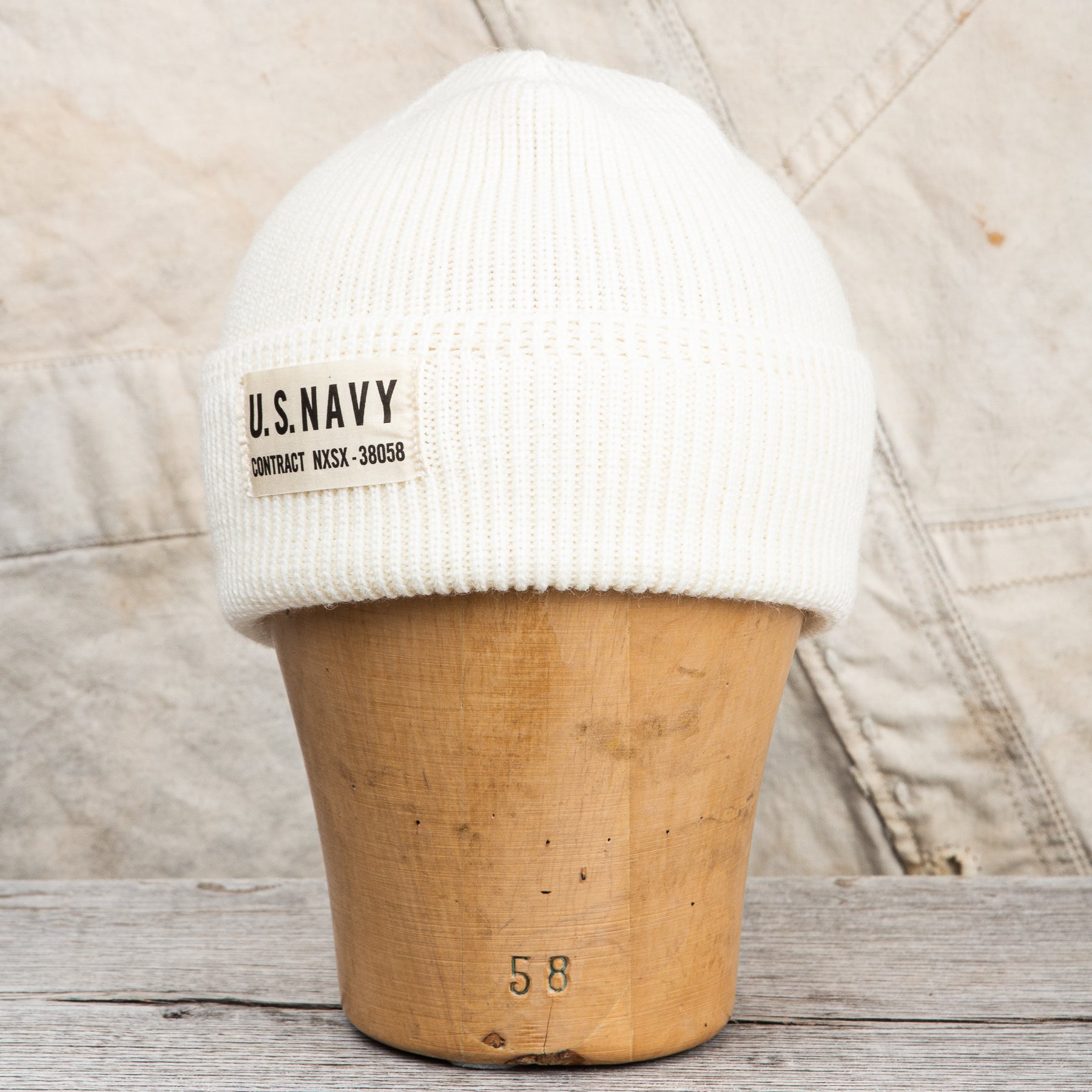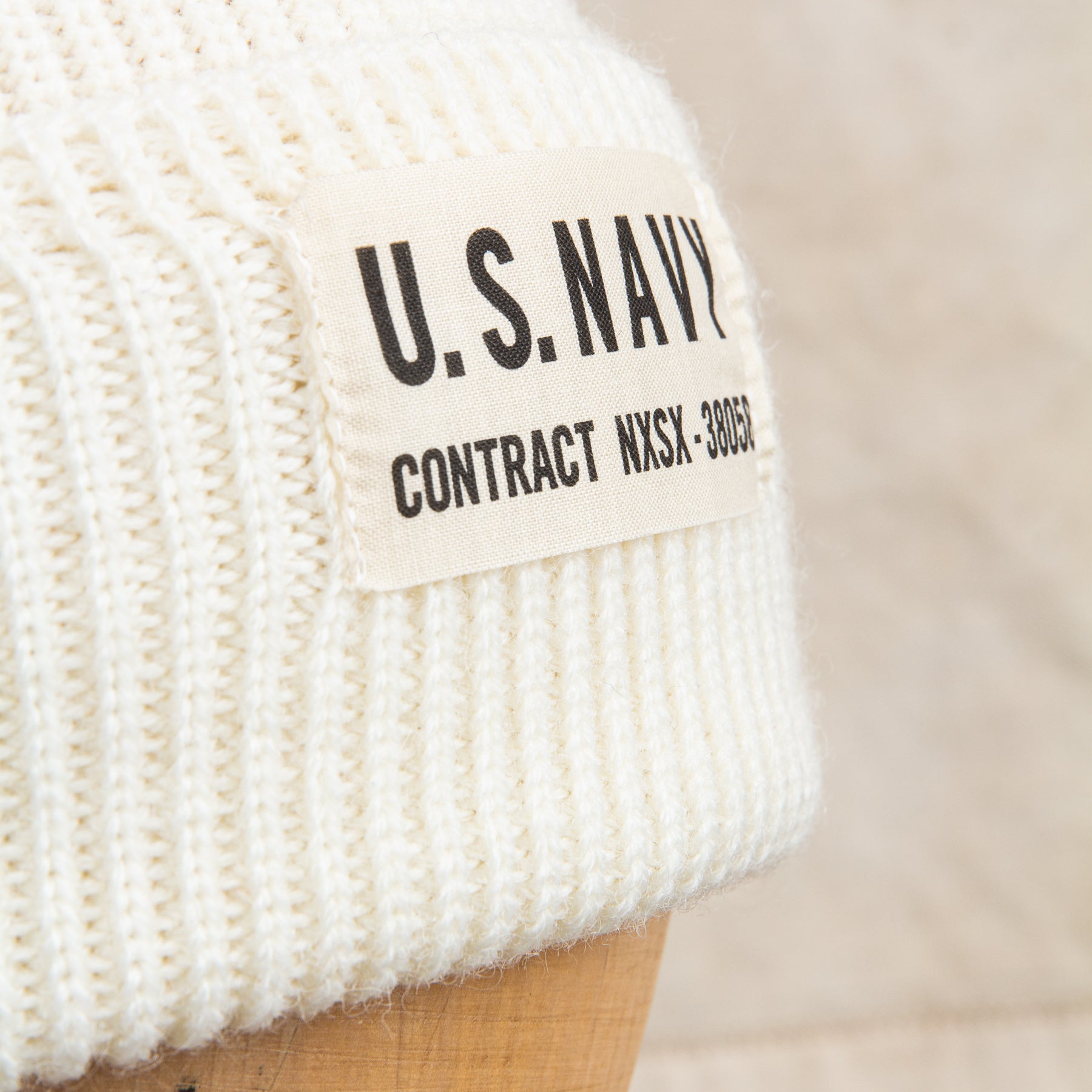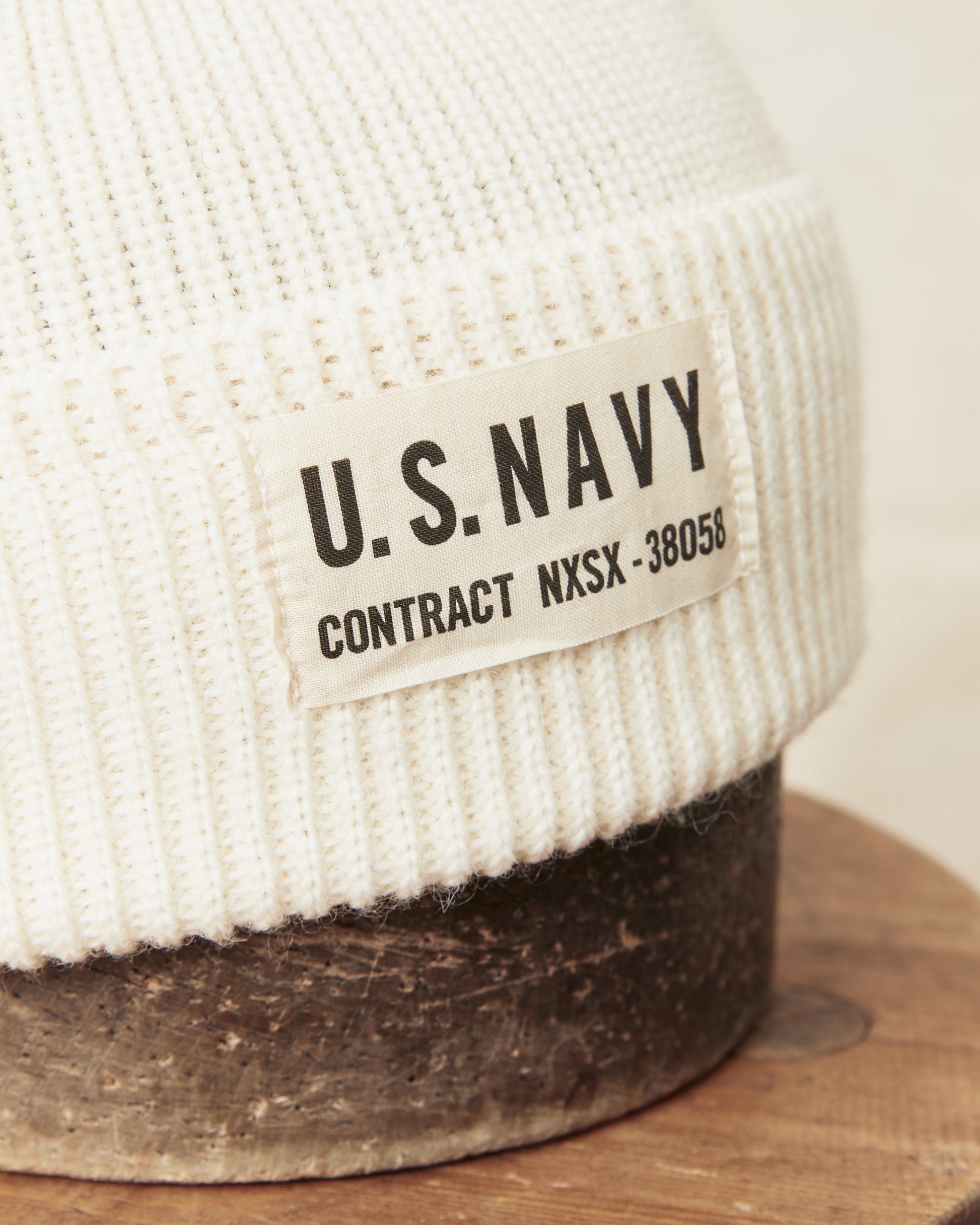 This is a Papa Nui reproduction of the classic USN General Issue Watch Cap. Its a beautiful rendention of the classic WWII Naval knit, fully machined knitted in Japan in pure wool and featuring a USN contract tag. The reason for the US Navy to wear wool is that wool has the natural capacity of keeping the heat even when soaking wet. If one would find oneself in an extreem situation where ones wool clothes are soaked and the weather is cold you should never undress the wool garments because it's ability to keep you warm could actually be a mater of life and death. That's also the reason why wool is our favorite fiber.