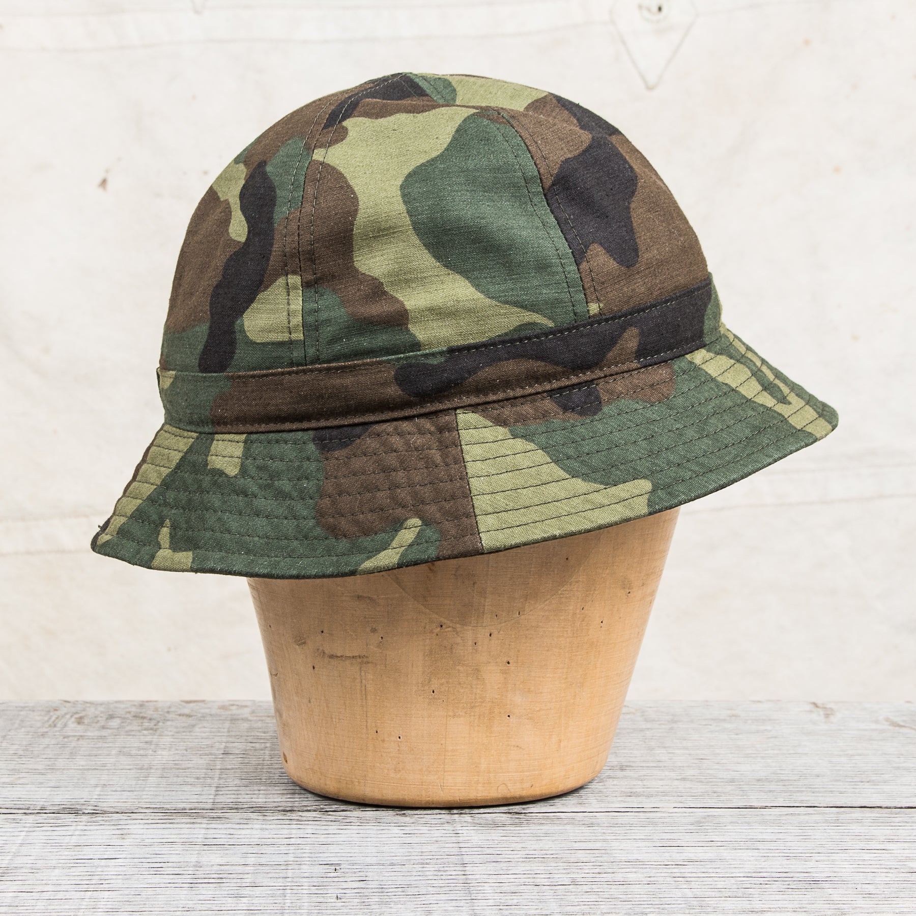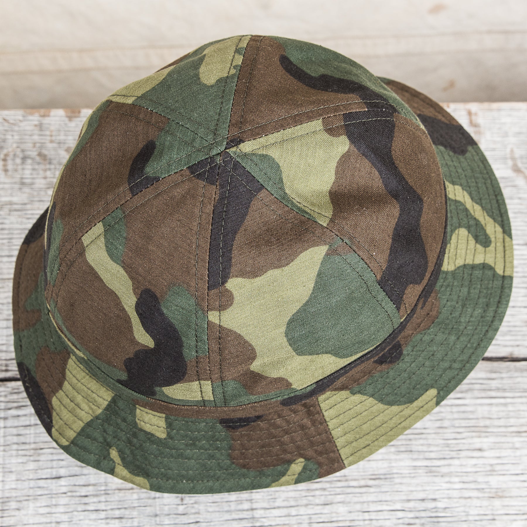 The Beach Master bucket hat is made of a cotton fabric and the name Woodland refers to the camouflage pattern that was used as the default camouflage pattern issued to the United States Armed Forces from 1981 to the mid 2000s.