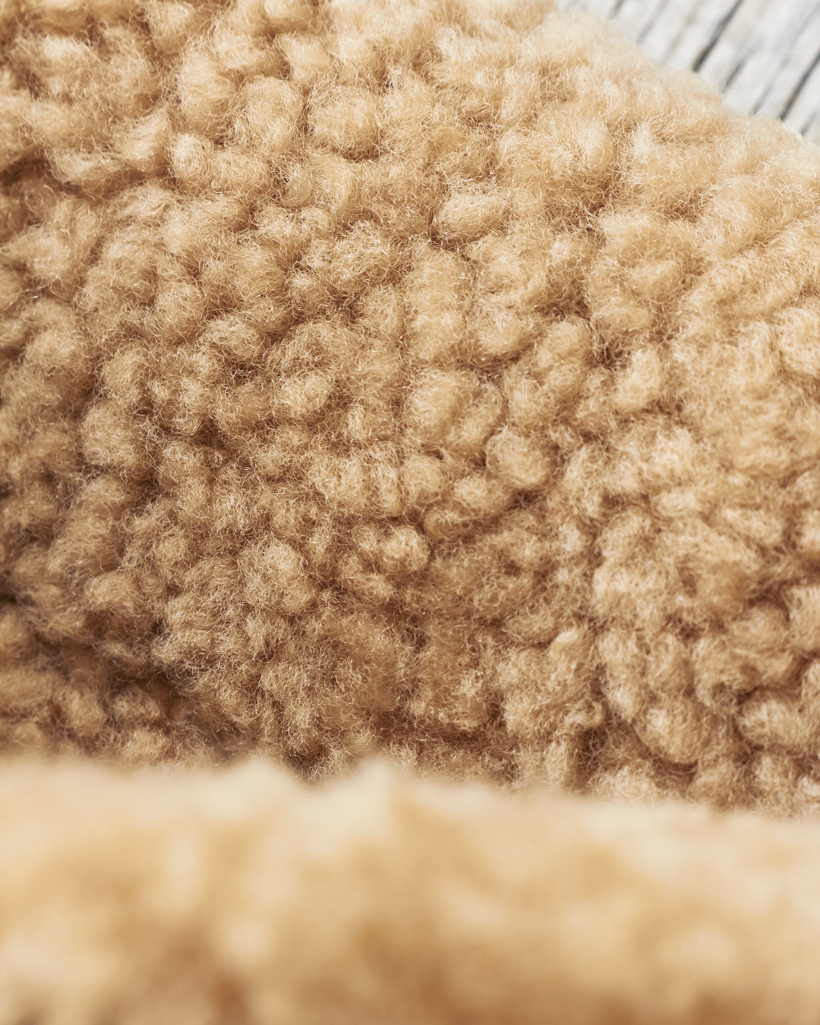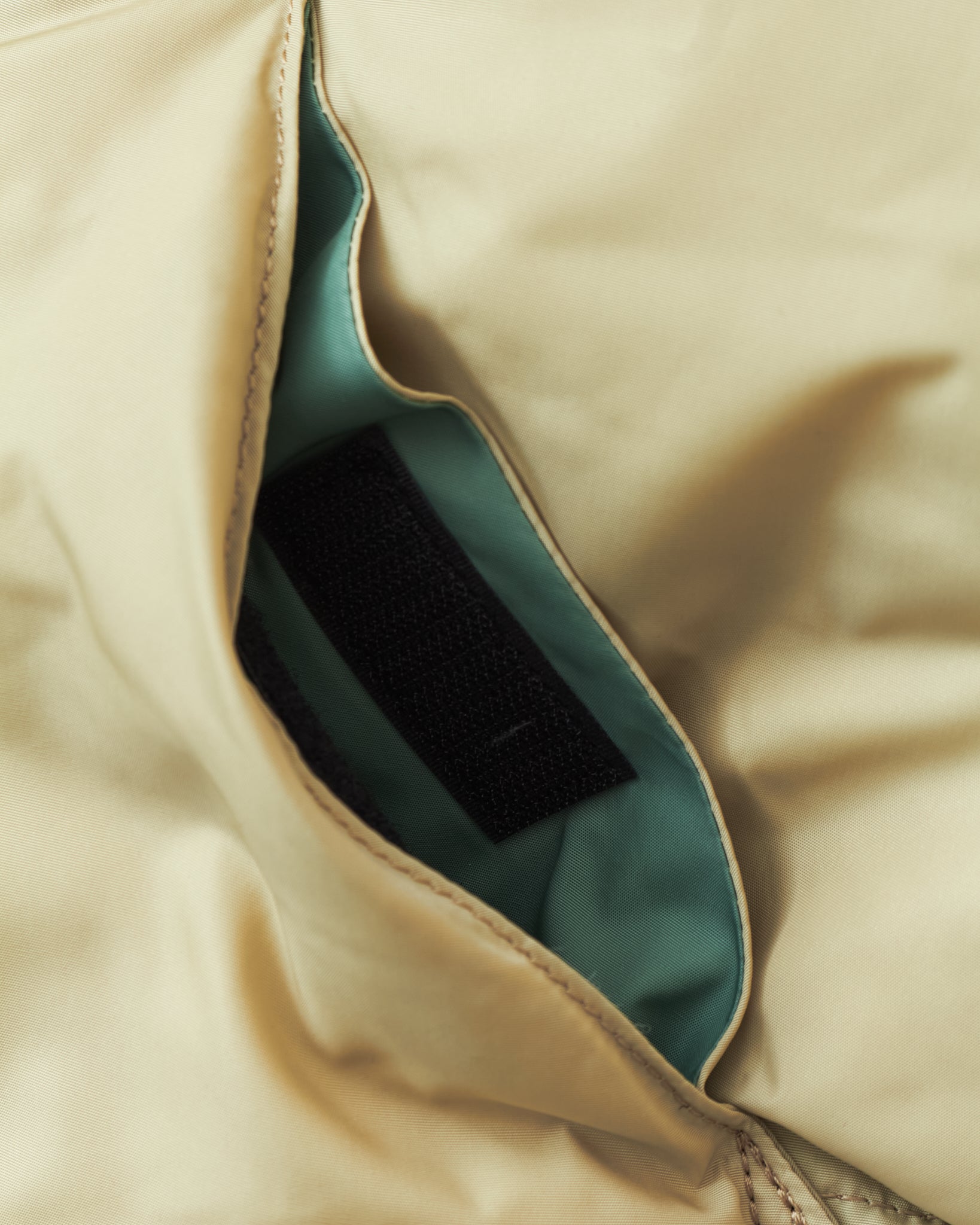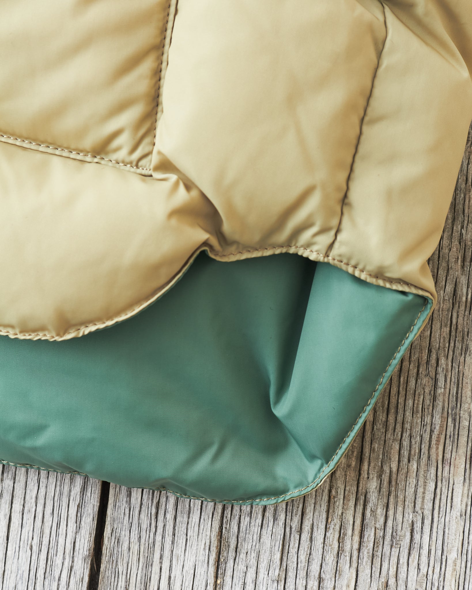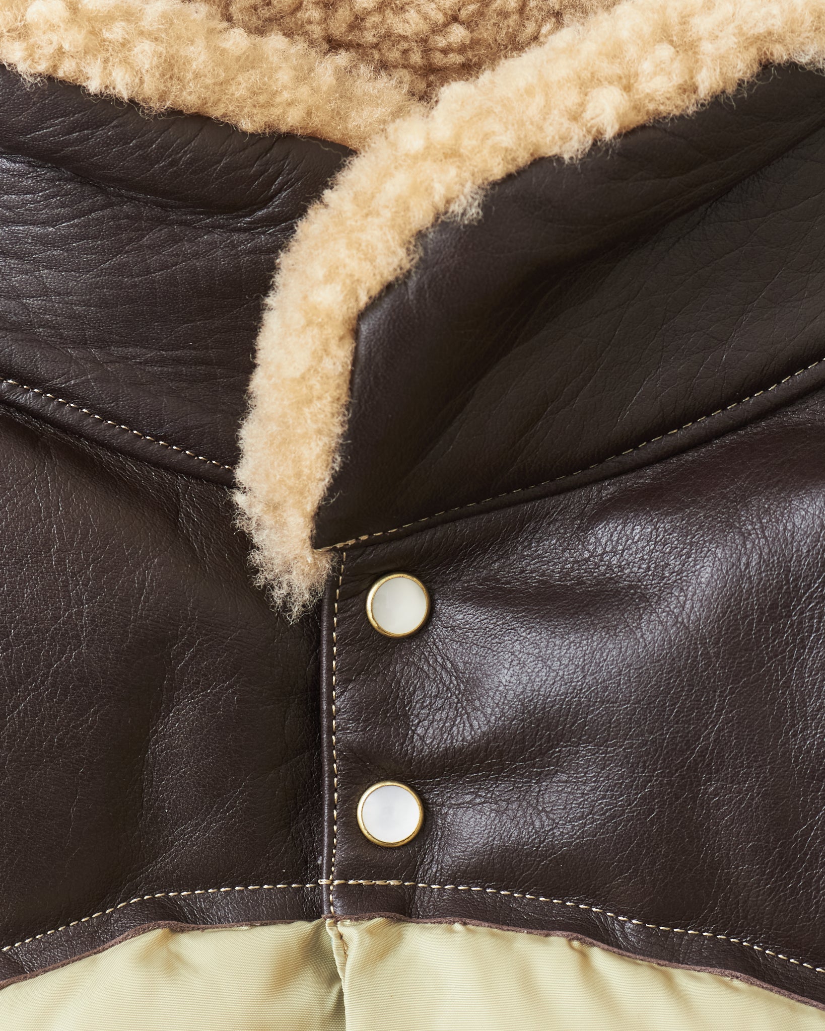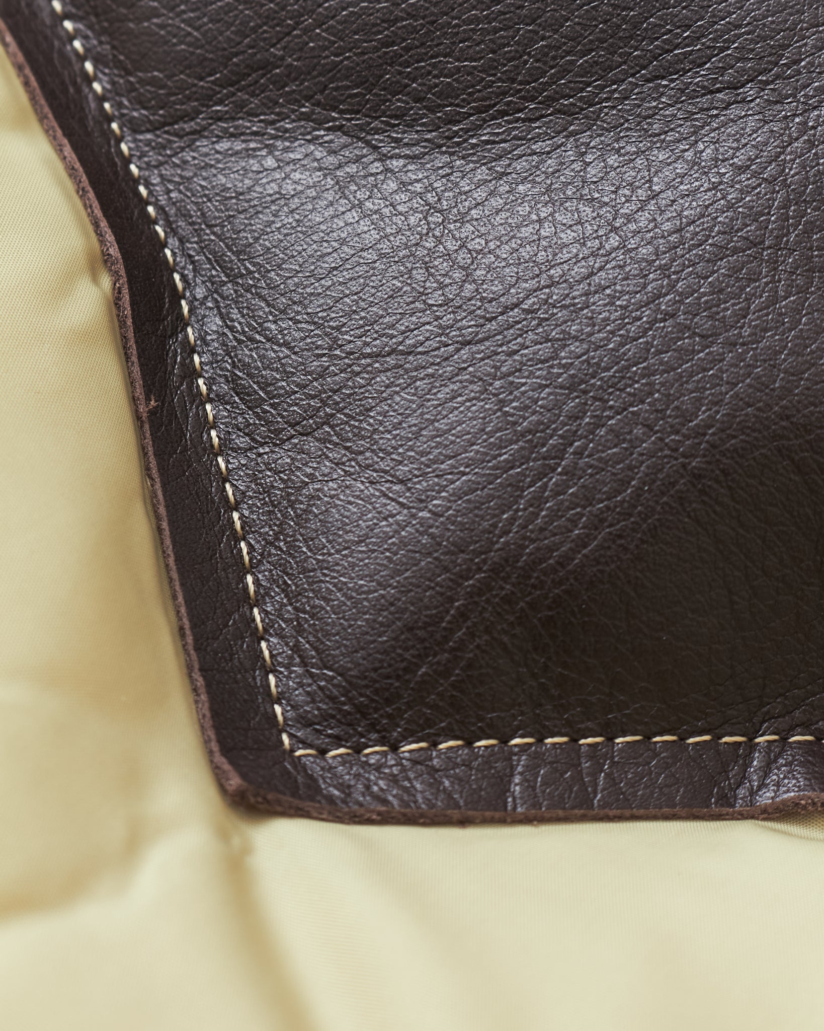 The body is made of nylon and and the filling is down, the hand warmer pockets are made with two compartments one of witch can be closed with velcro. The vest has one inner pocket that closes with a YKK zipper. The yoke is made of brown cattle leather and the collar on this particular vest is made of sheep skin to give some extra warmth around the neck and it sure feels cosy as well!