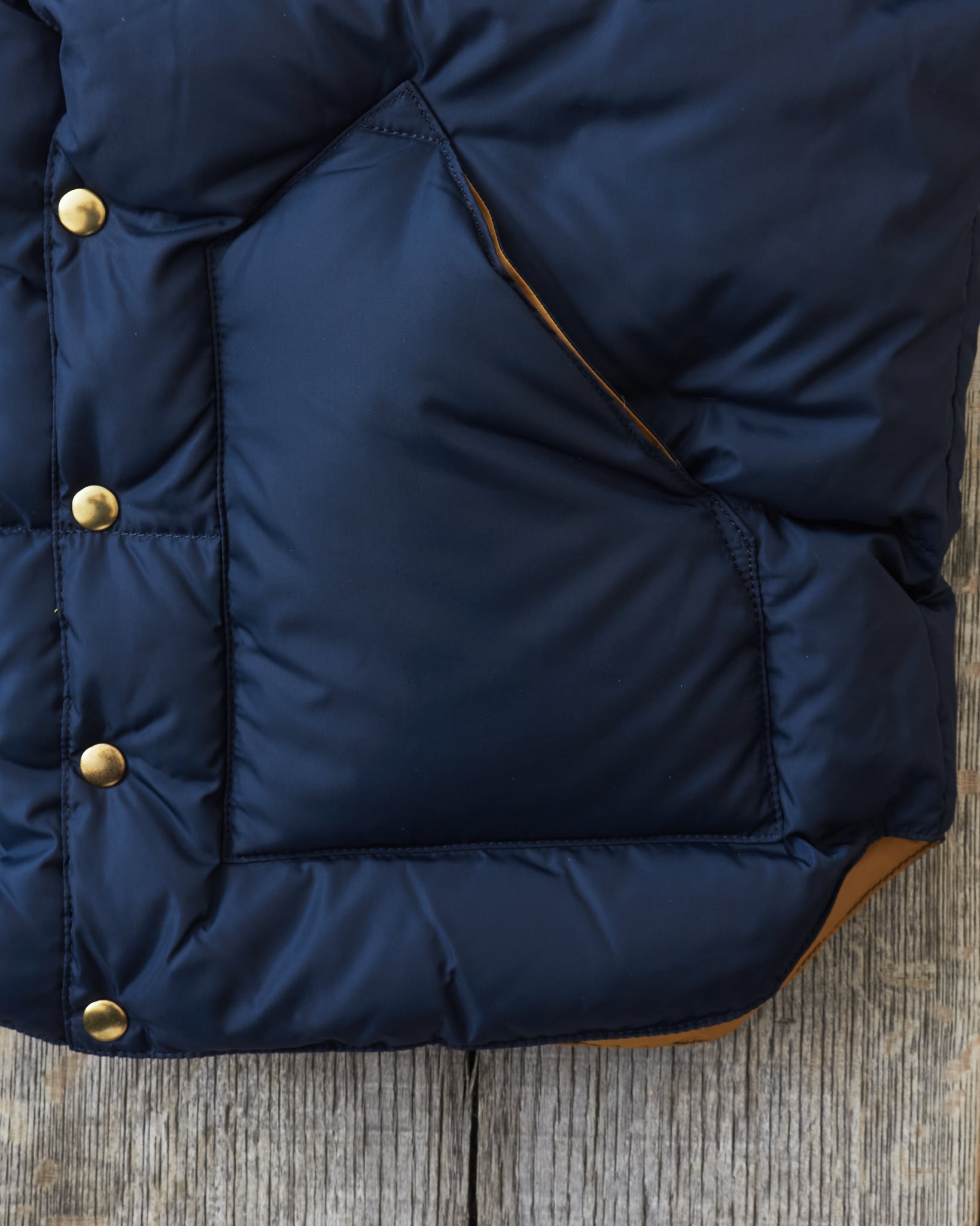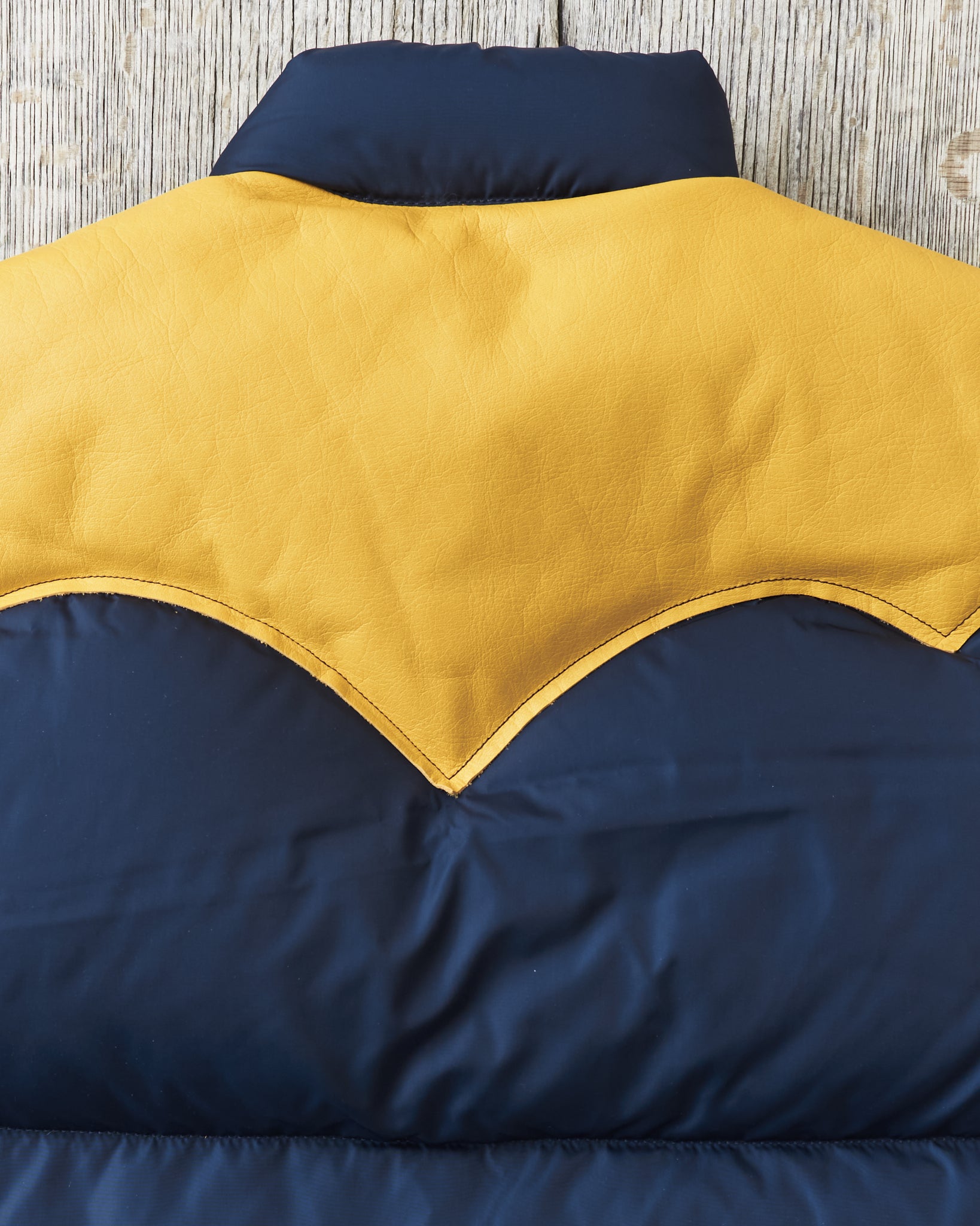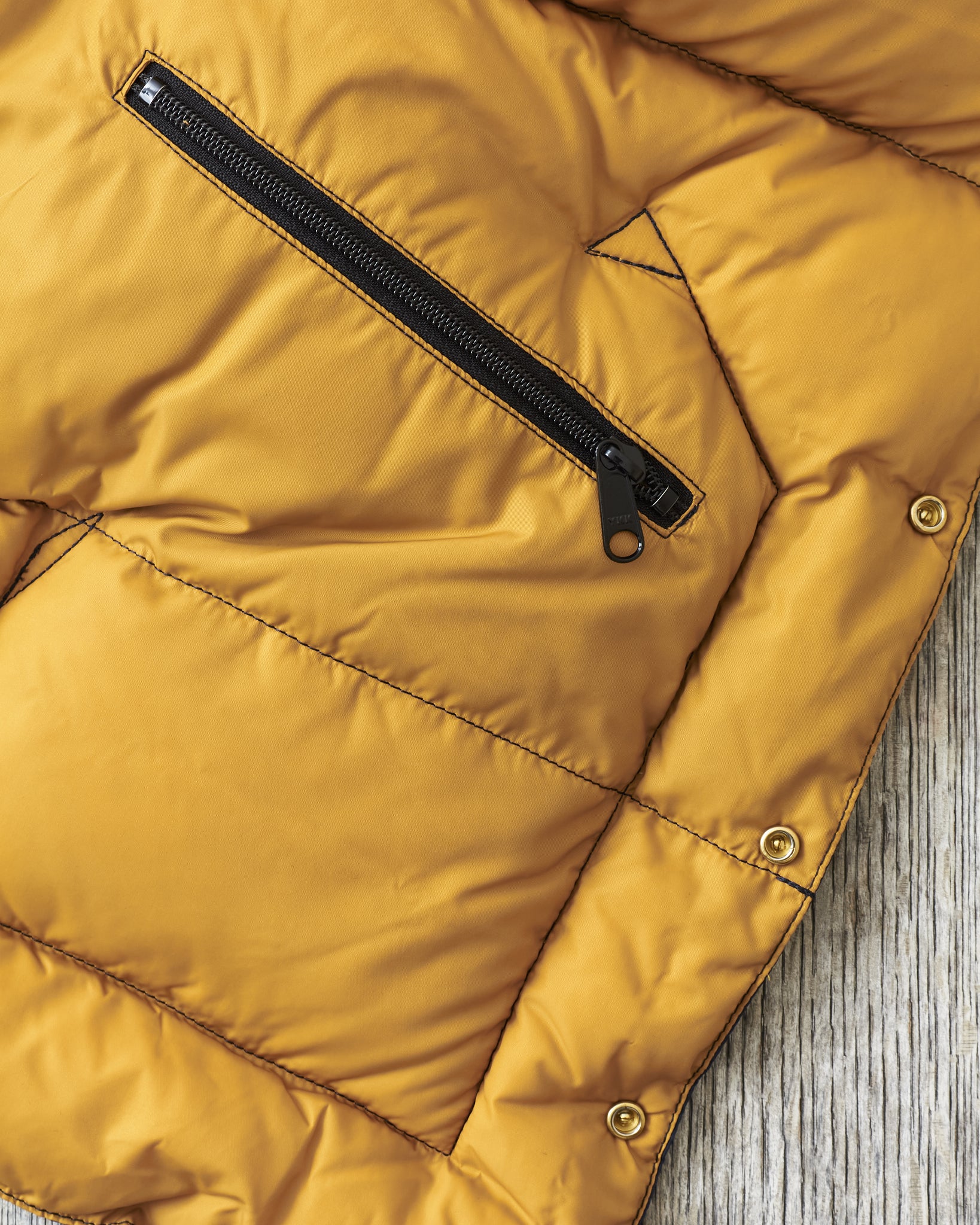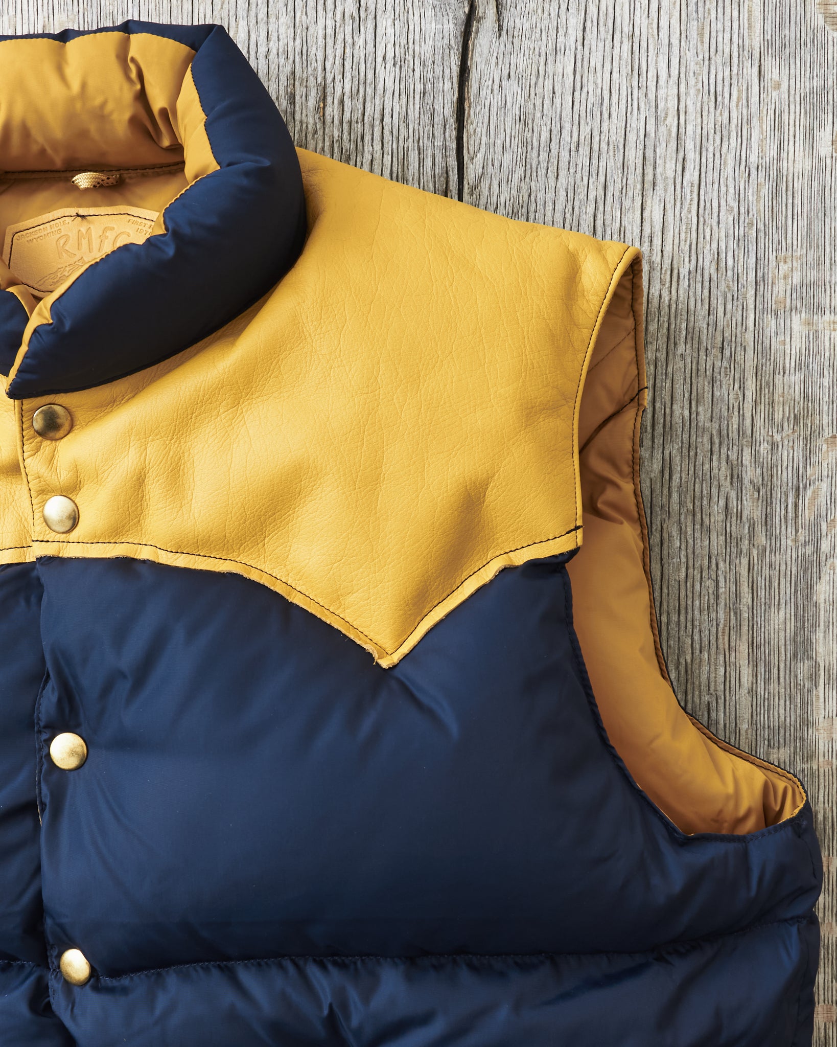 The body is made of nylon and and the filling is down, the hand warmer pockets are made with two compartments one of witch can be closed with velcro. The vest has one inner pocket that closes with a YKK zipper. The yoke is made of yellow cattle leather.