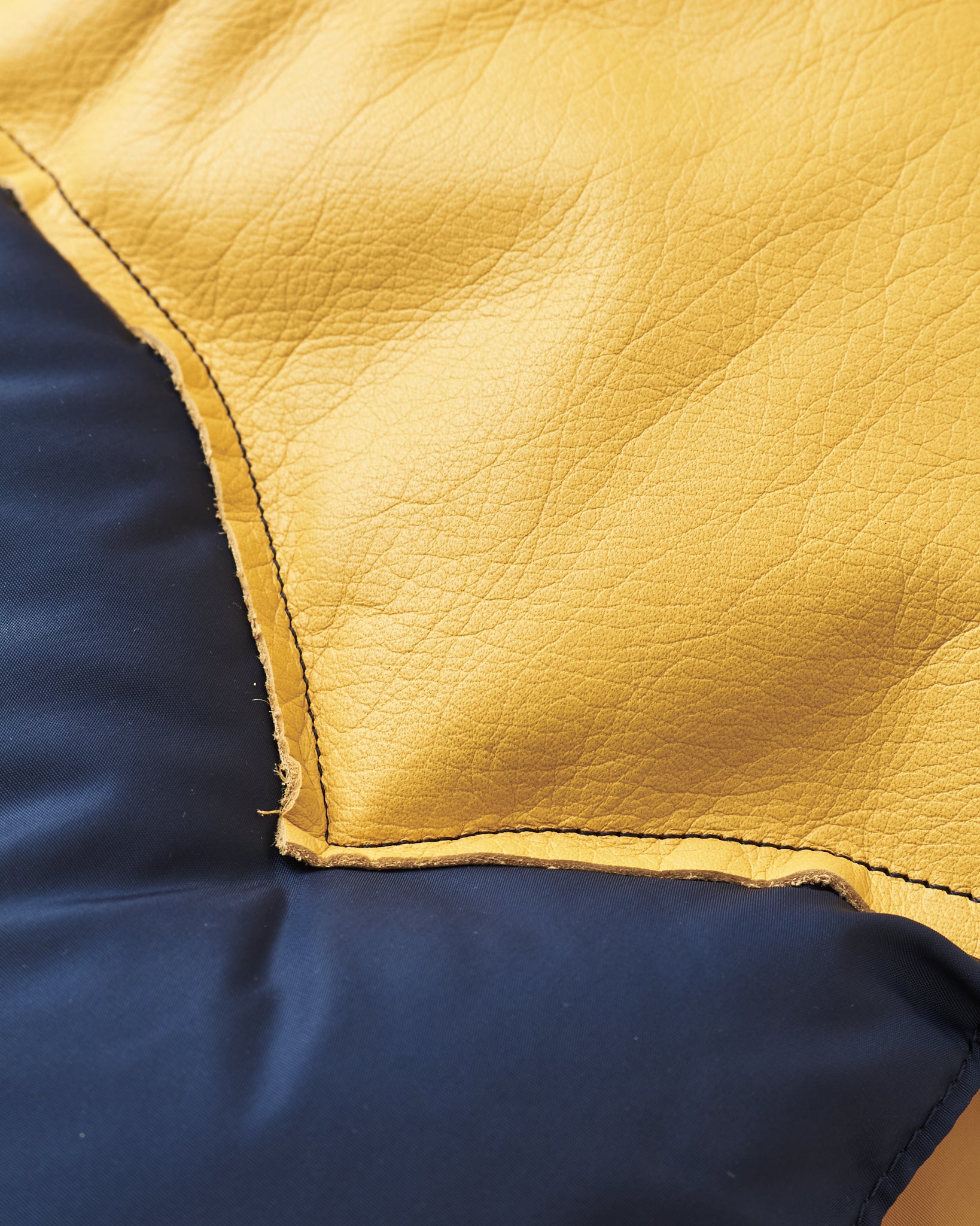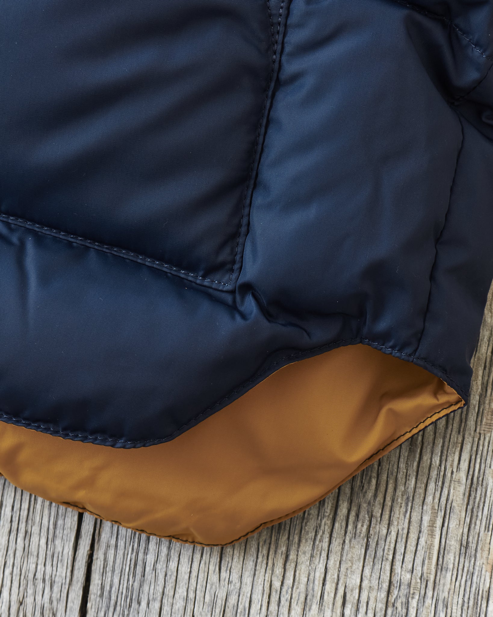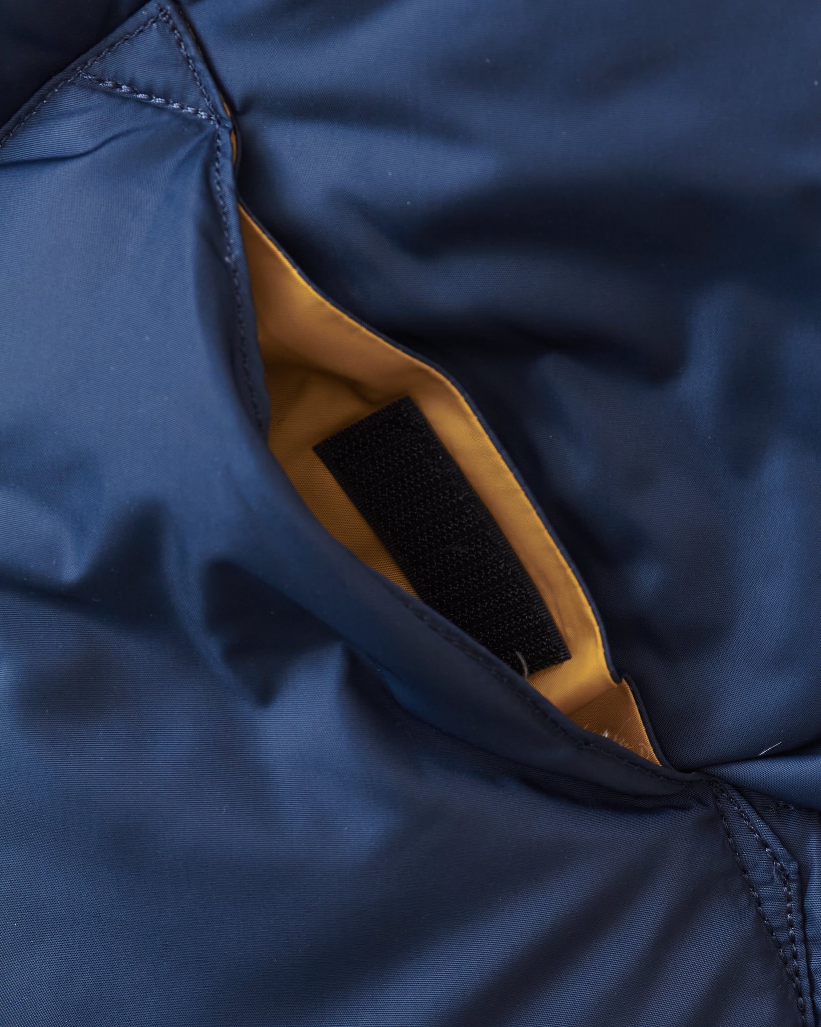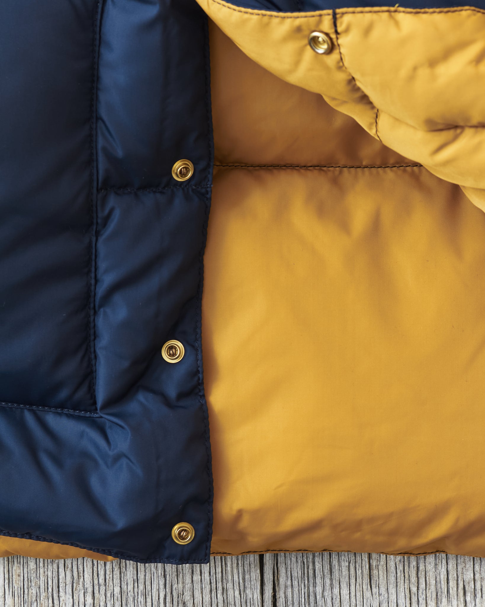 The body is made of nylon and and the filling is down, the hand warmer pockets are made with two compartments one of witch can be closed with velcro. The vest has one inner pocket that closes with a YKK zipper. The yoke is made of yellow cattle leather.