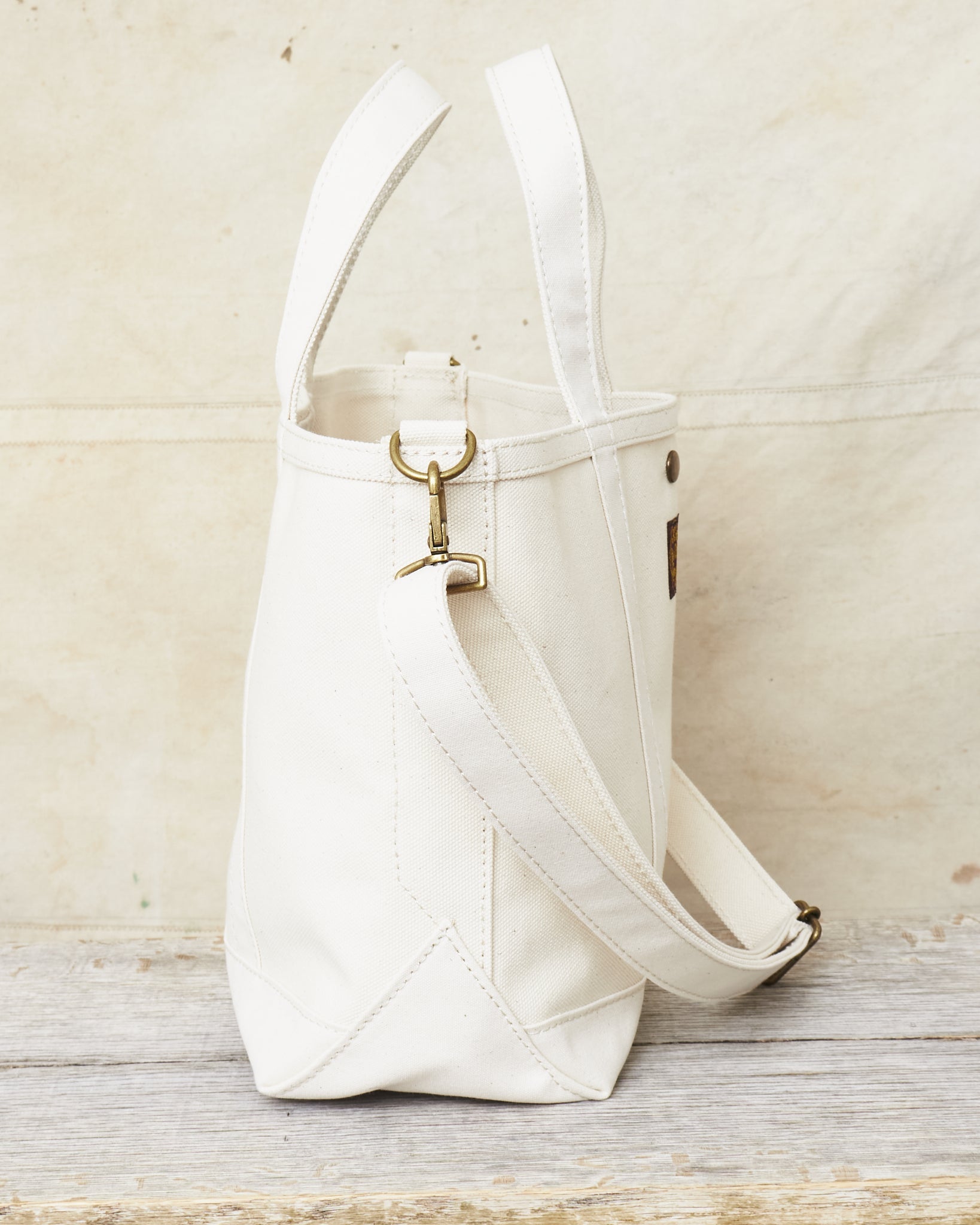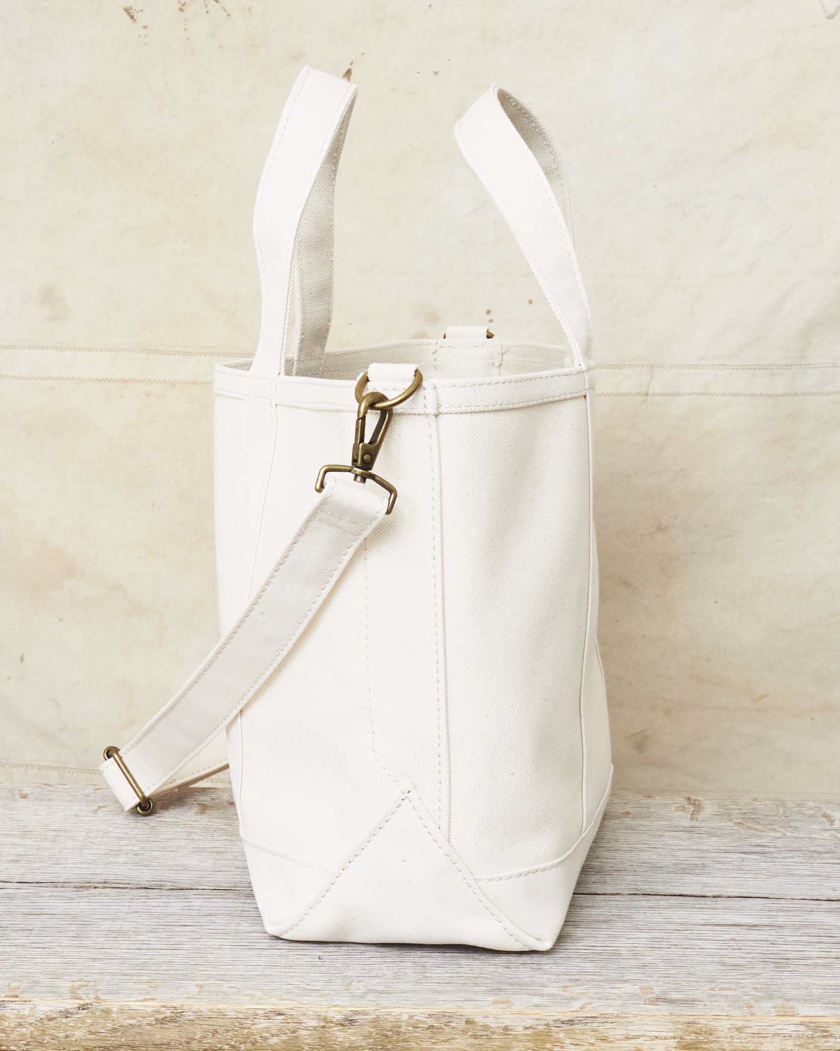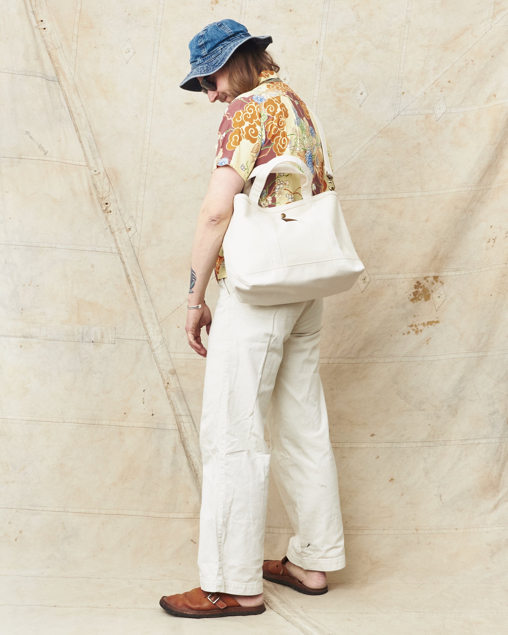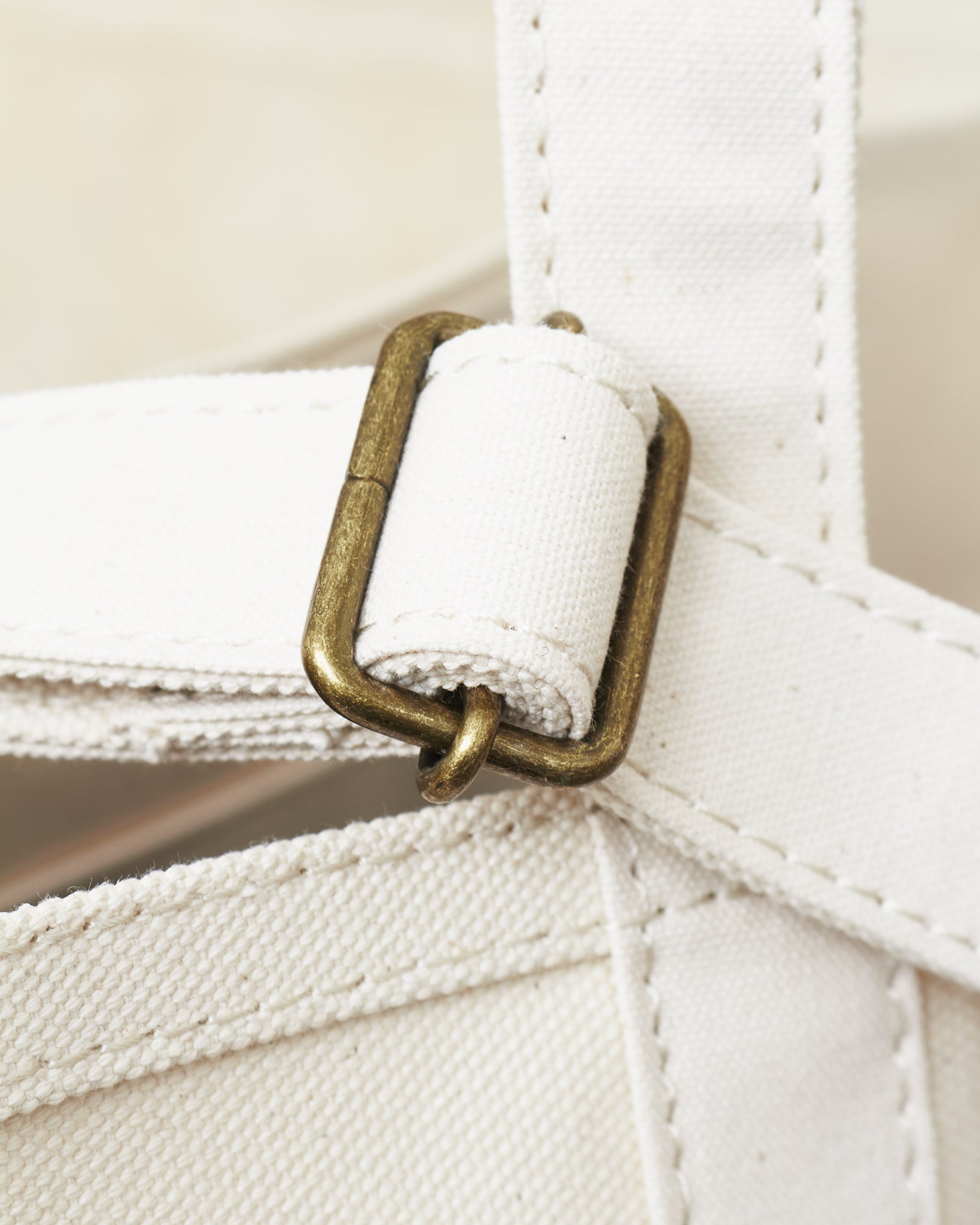 The body of this bag is made out of a 10 oz 100% white cotton duck fabric, the handles are made of heavy cotton fabric. Equipped with D-rings on each side of the bag and a sturdy shoulder strap.