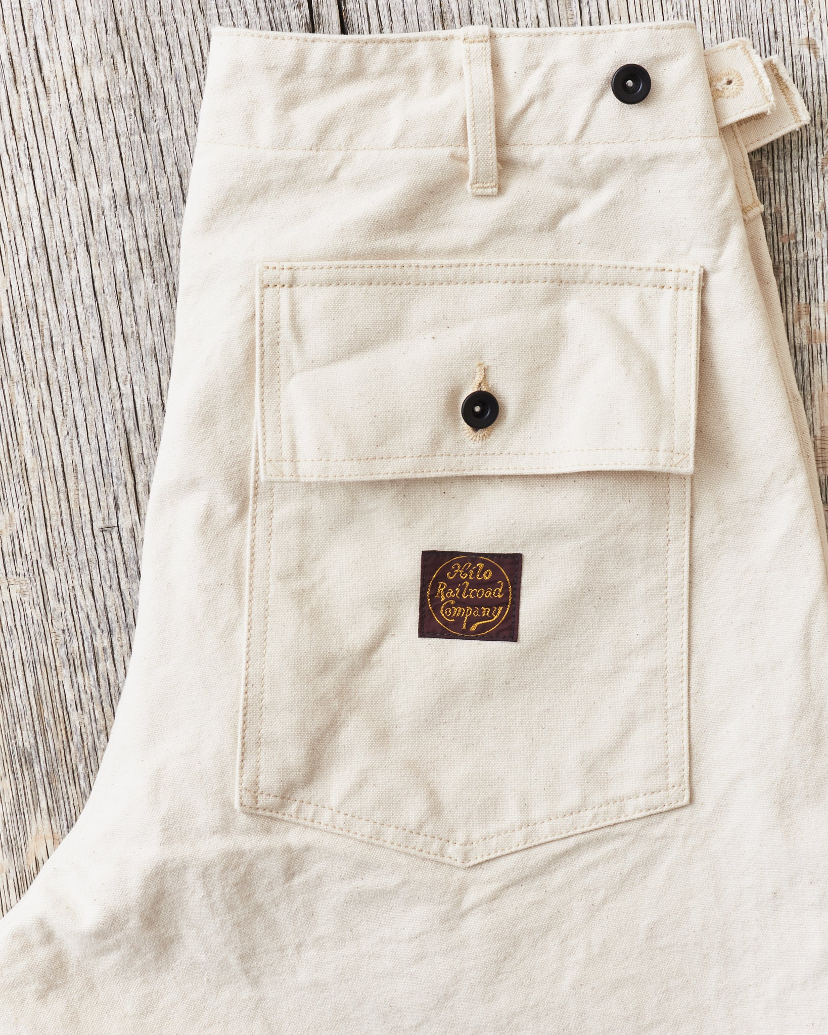 When the Japanese people first came to Hawaii, many of them started working for The Hilo Railroad company. During this time, many of the local workwear factories and tailors produced a lot of military clothes. They used this knowledge to produce garments for The Hilo Railroad company. These pants are inspired by those workwear pants, with a heritage in military clothes.