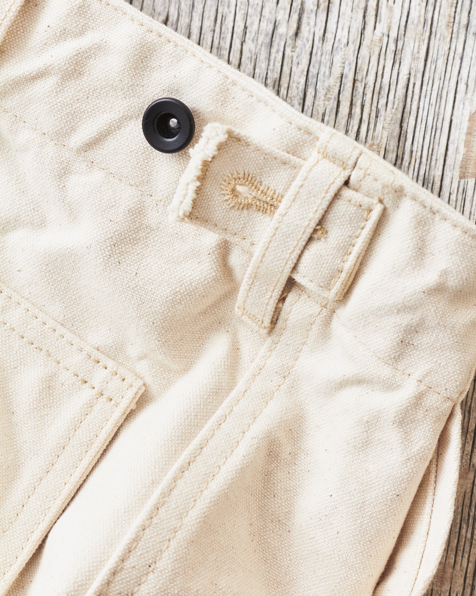 These pants are made out of a 10 oz 100% white cotton duck fabric, they are similar in design to the classic fatigue pants. Meaning two front pockets attached to the outside of the leg, similar rear pockets and side adjusters. However they come with beautiful metall buttons. The White color is natural white, meaning not crisp white like snow.
