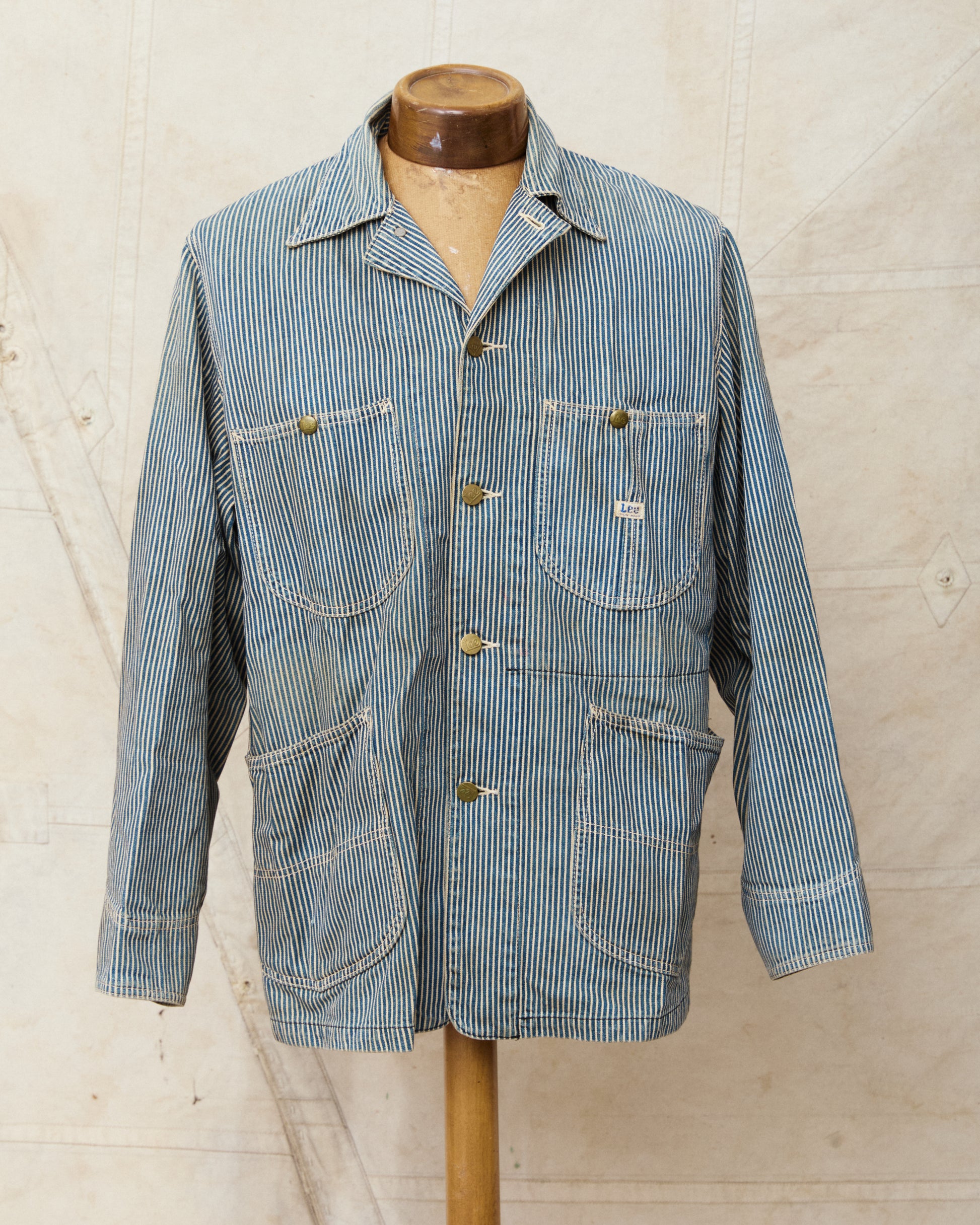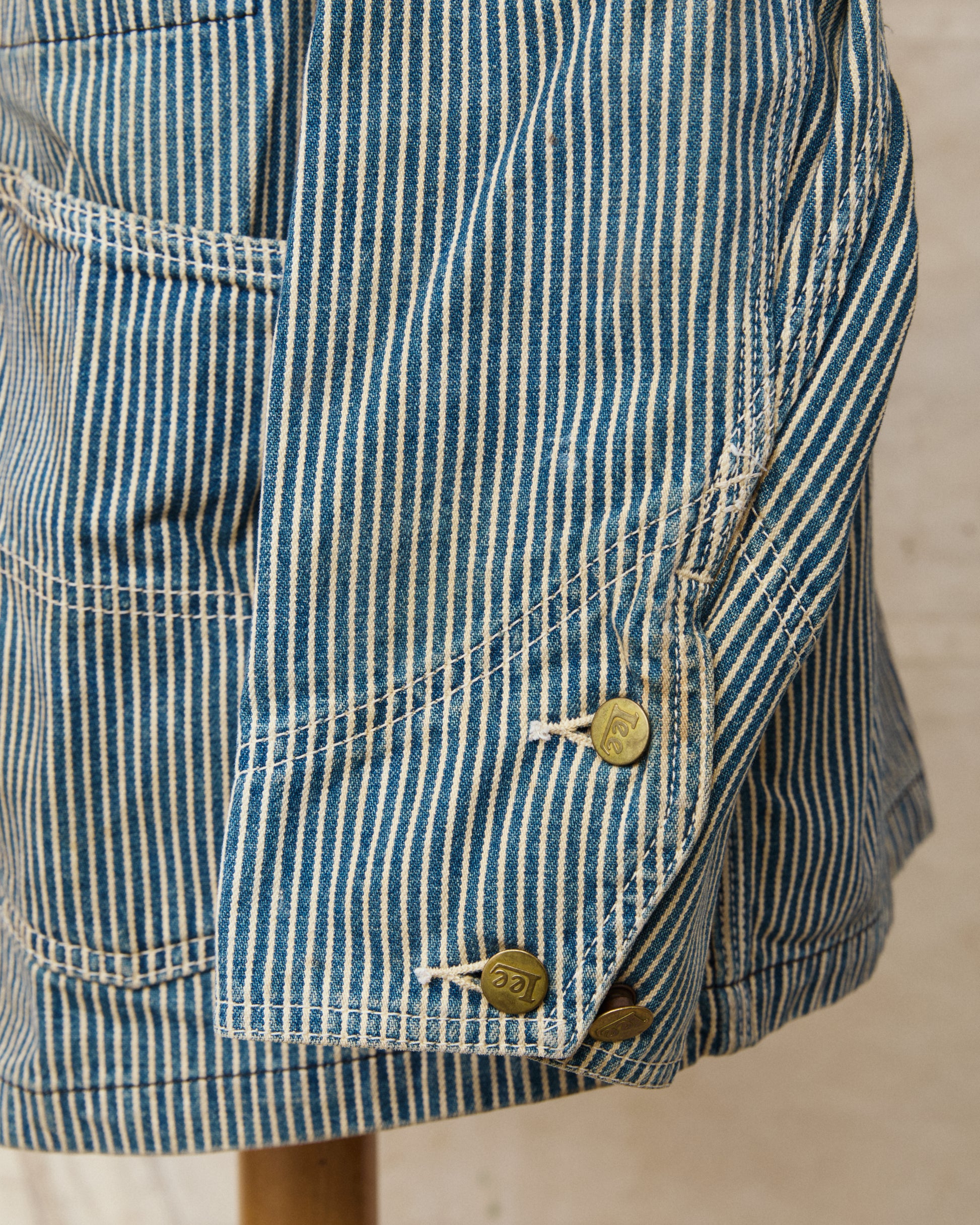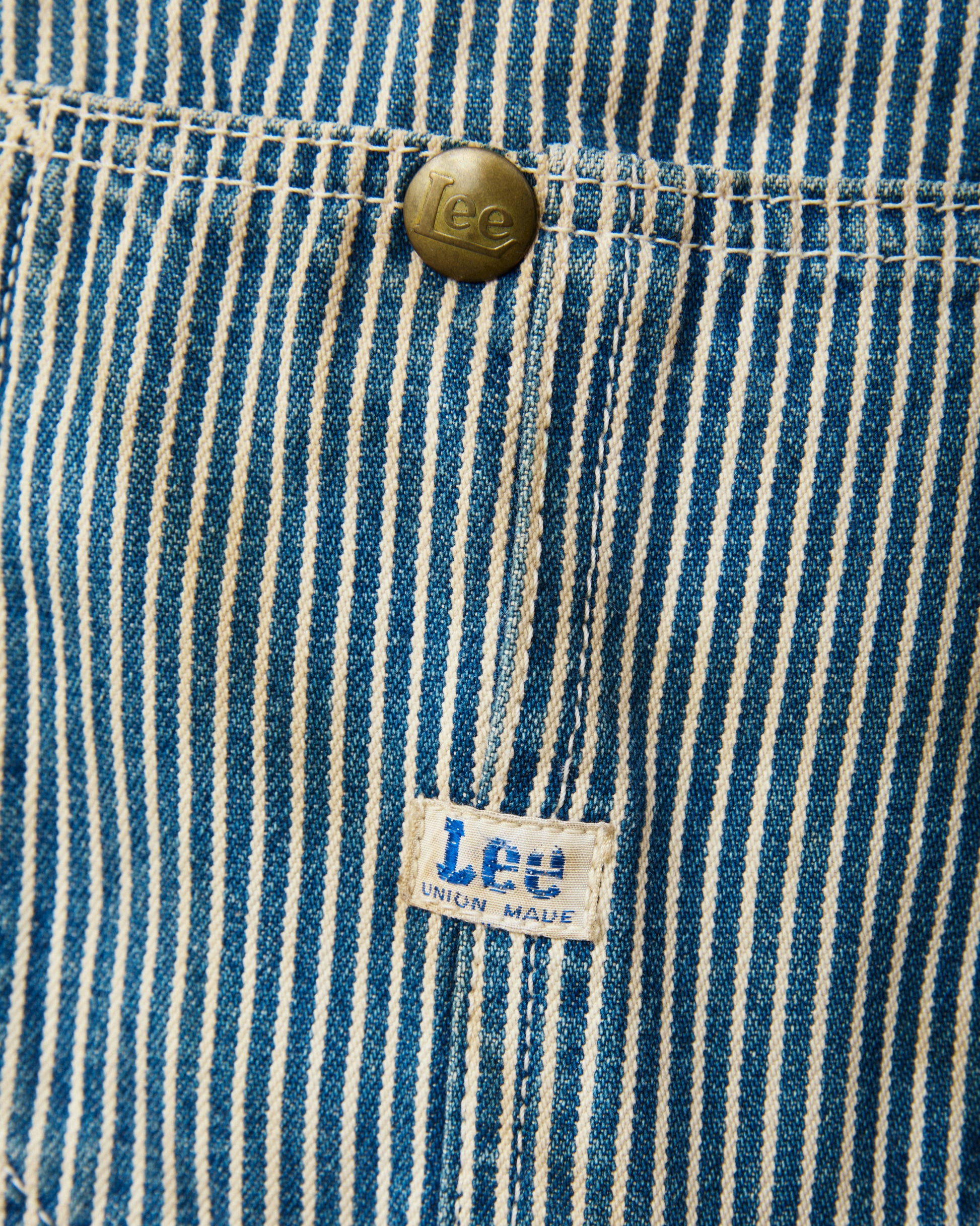 This is a second hand reproduction of the iconic Lee 91-J Loco Jacket in Hickory Striped fabric. A model that was first made back in 1921, intended to be a work jacket worn by rail road workers. The striped fabric known as Hickory Stripe was especially appreciated in railway work because it kept you visible, to avoid injuries at work.