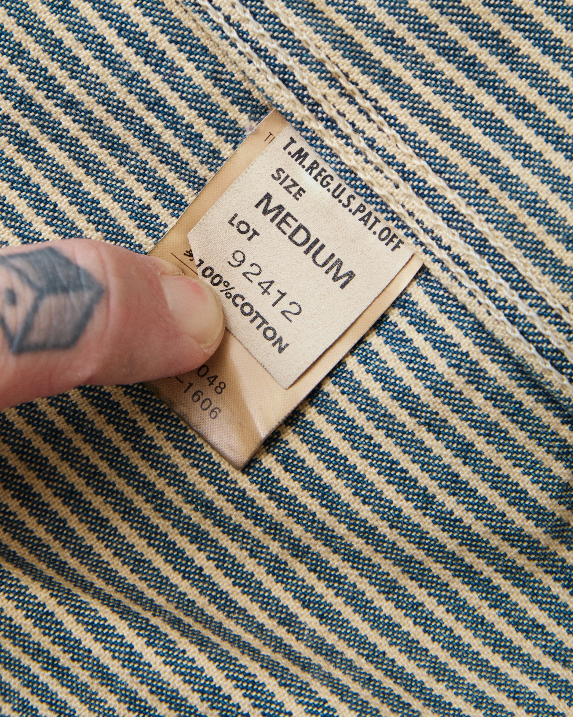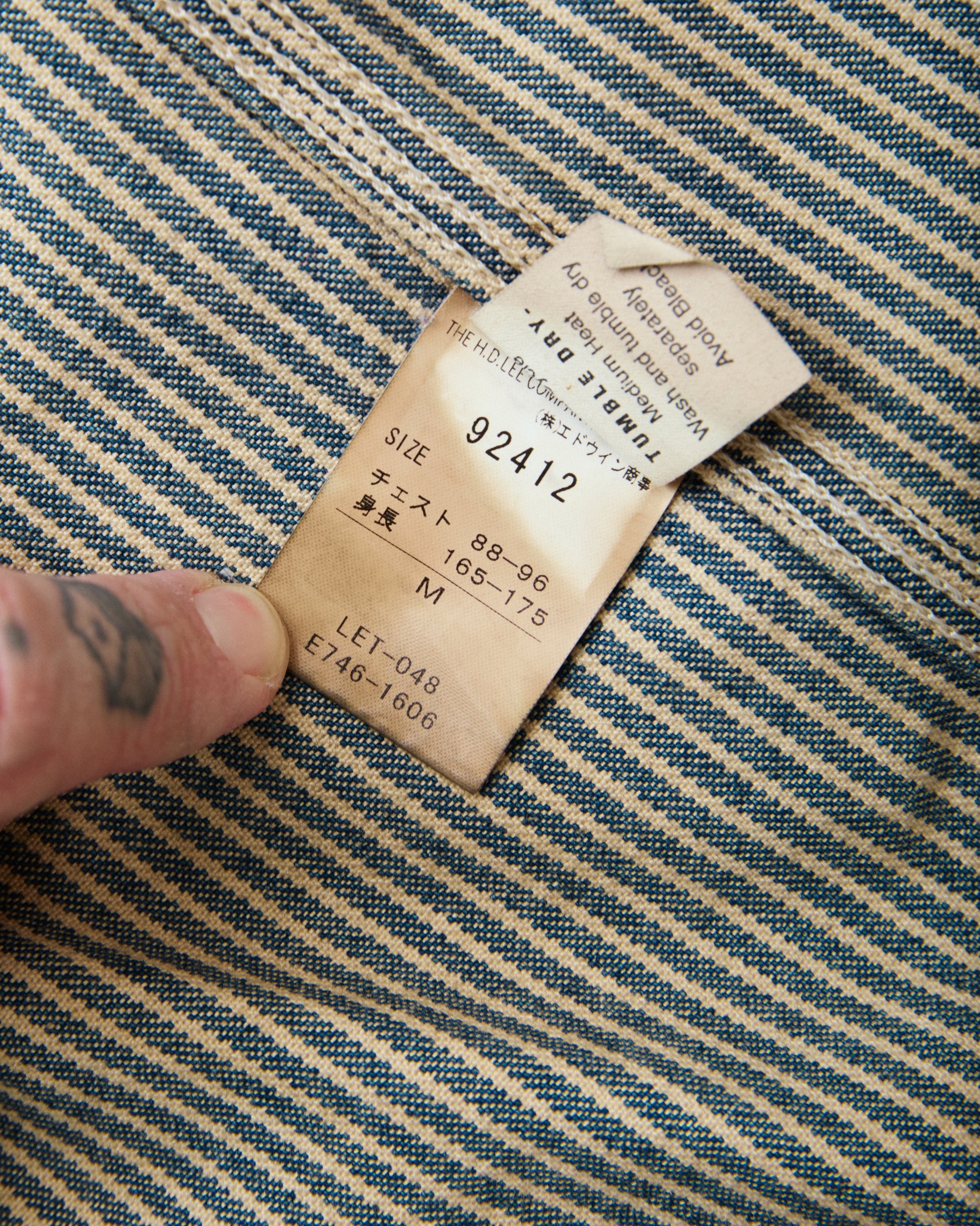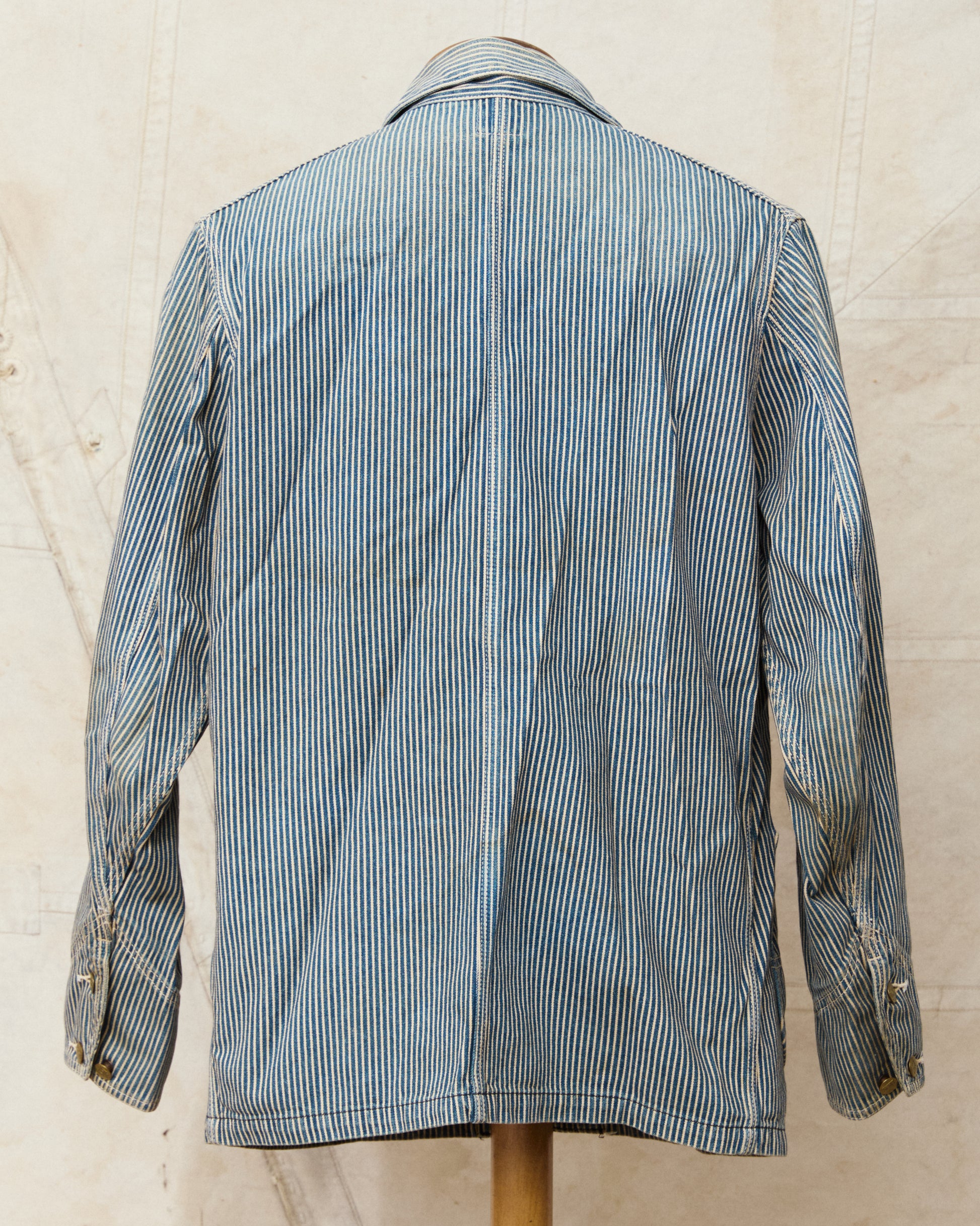 This is a second hand reproduction of the iconic Lee 91-J Loco Jacket in Hickory Striped fabric. A model that was first made back in 1921, intended to be a work jacket worn by rail road workers. The striped fabric known as Hickory Stripe was especially appreciated in railway work because it kept you visible, to avoid injuries at work.