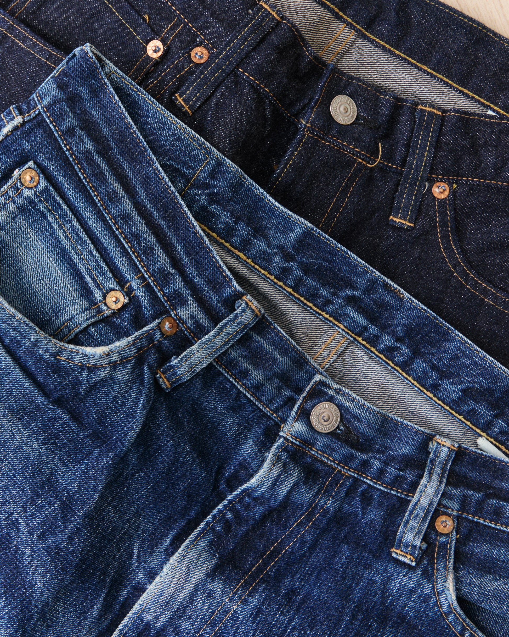 The last two images shows the Sugar Cane jeans together with a pair of used ones. This is only to give an idea on how everyday use and washing will develop the denim and also to inspire.
