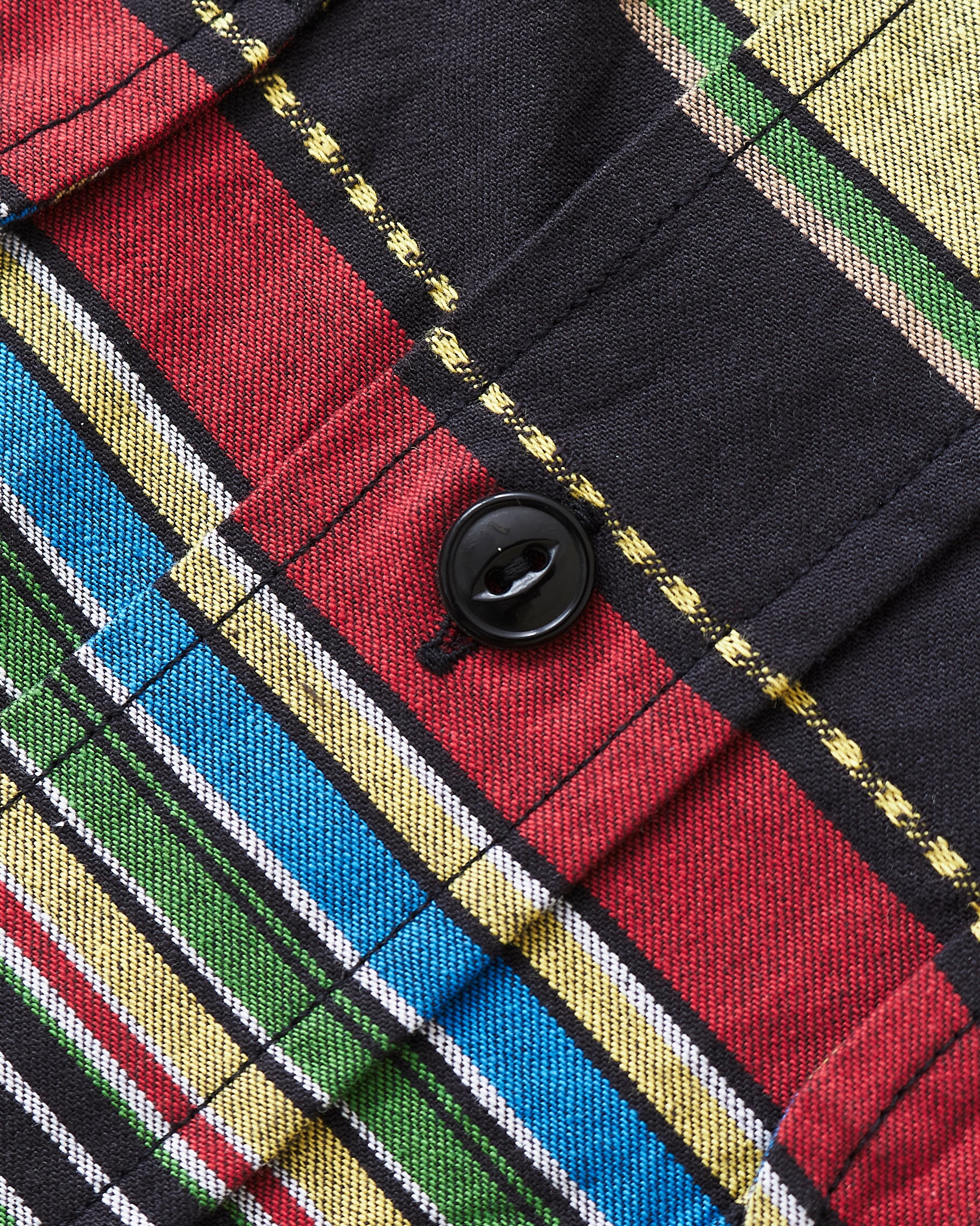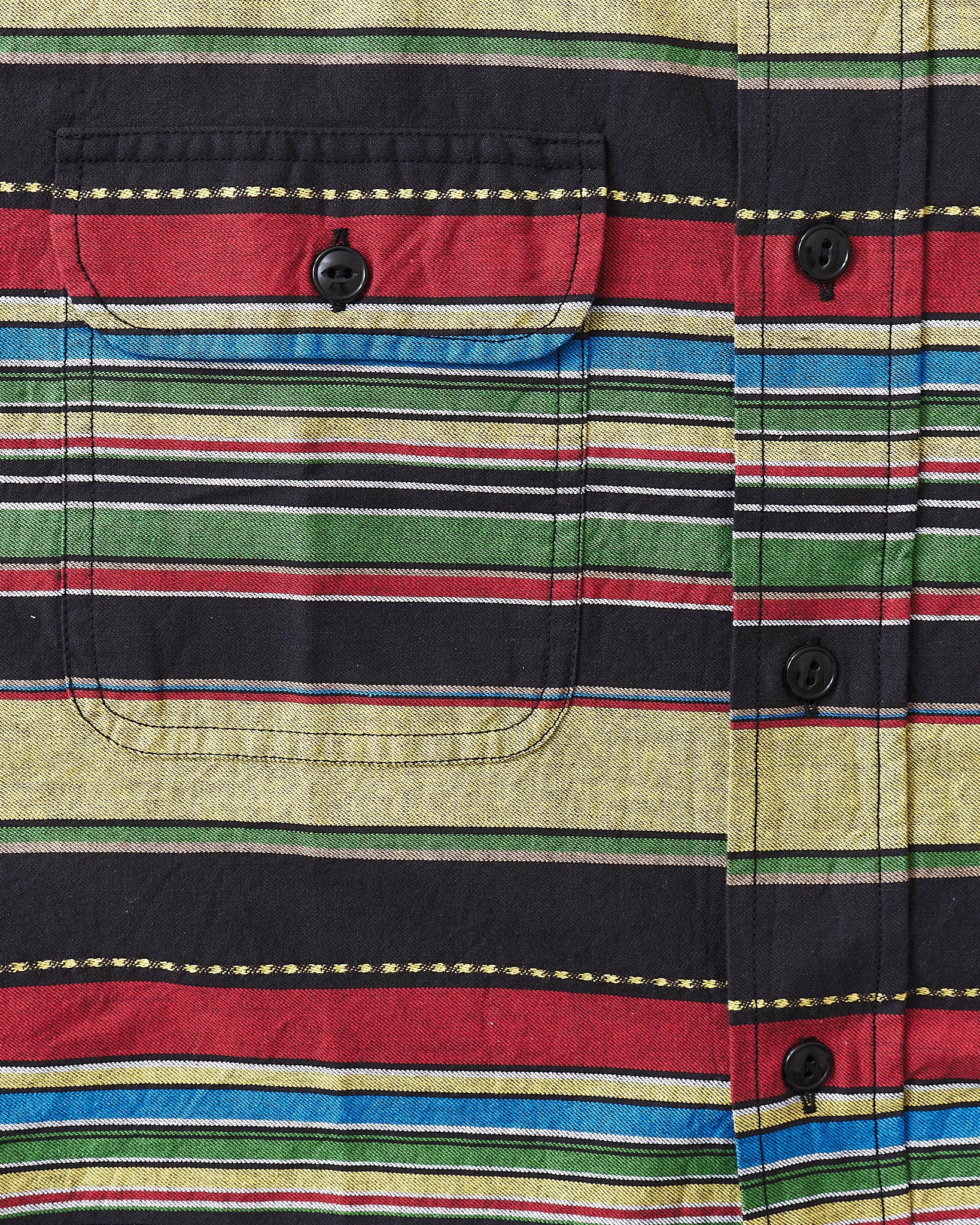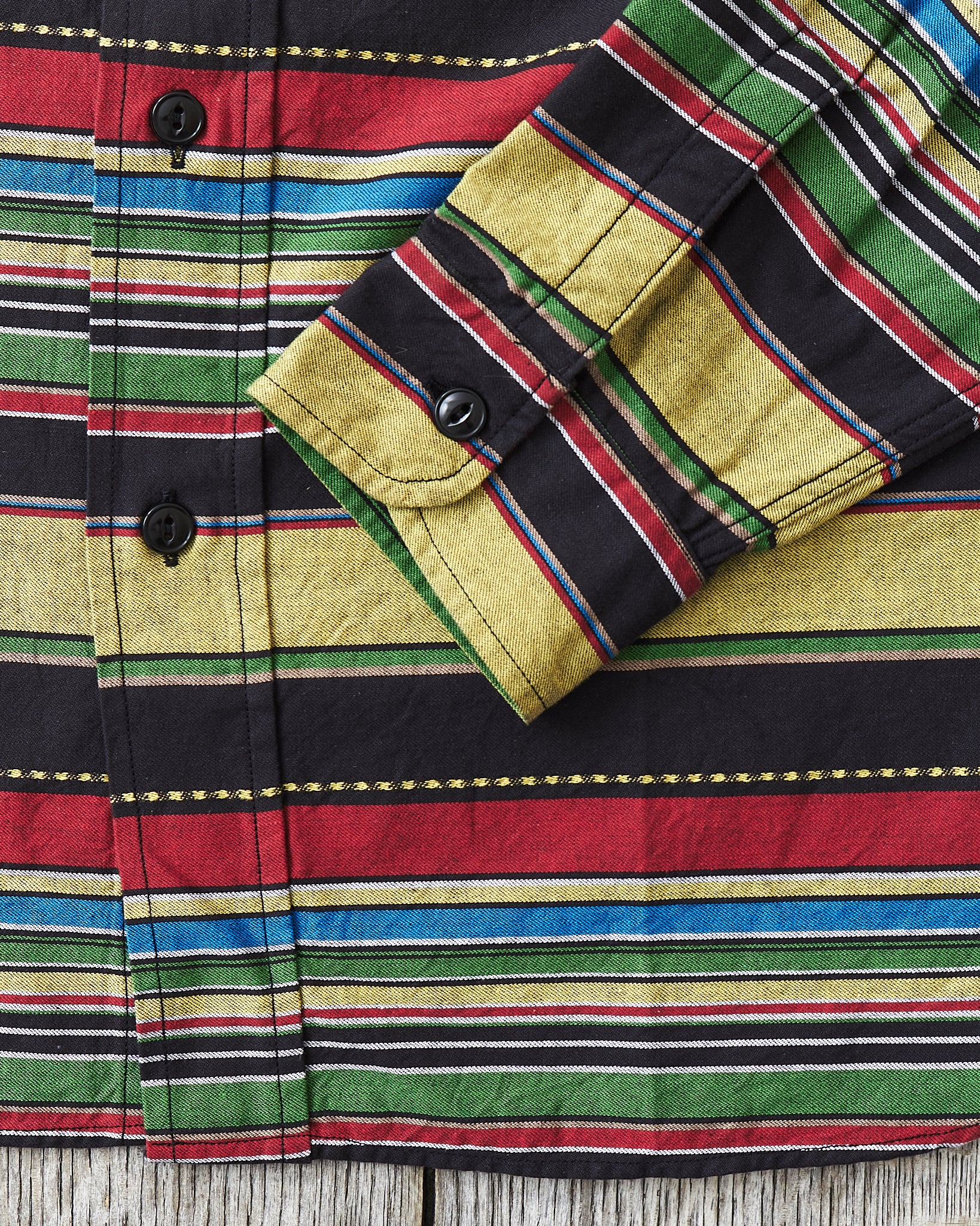 This is Sugar Cane's version of a classic work shirt, made from jacquard-woven cotton twill making it perfect both as a shirt or a lighter jacket. Inspired by Native American wool blankets, this design features a border pattern in black, yellow, green, blue and red. Buttons used are cat eye buttons, giving the shirt further vintage vibes.