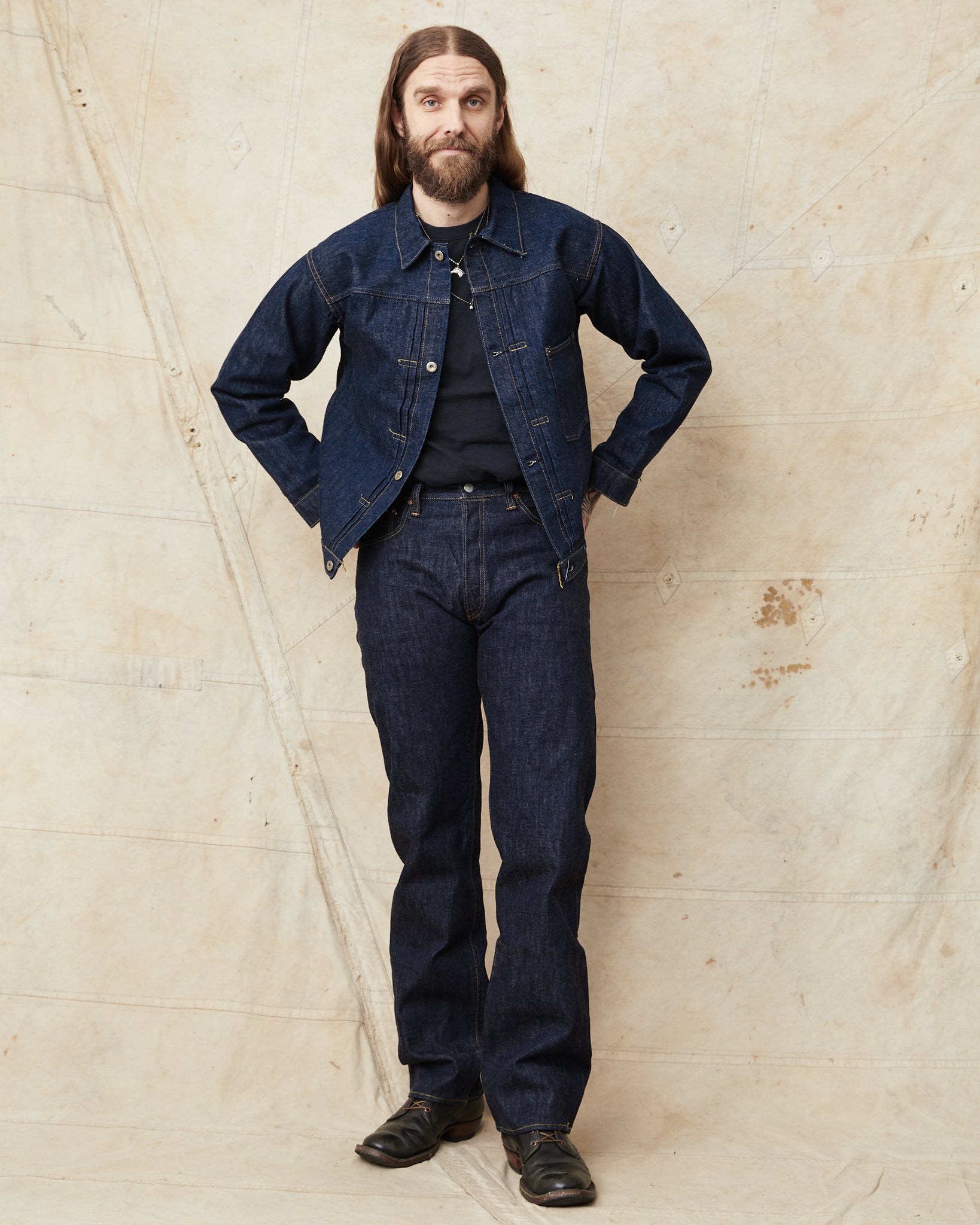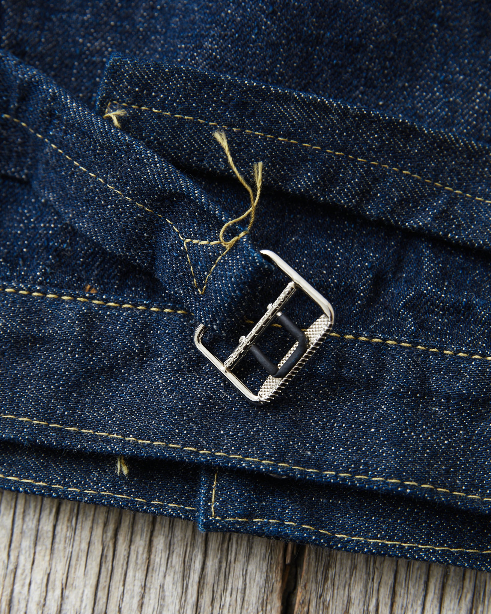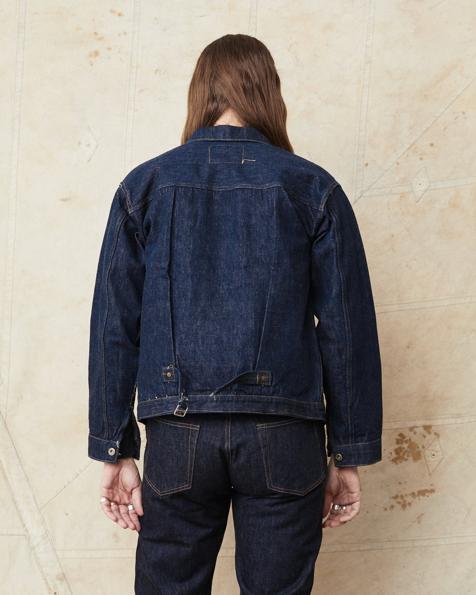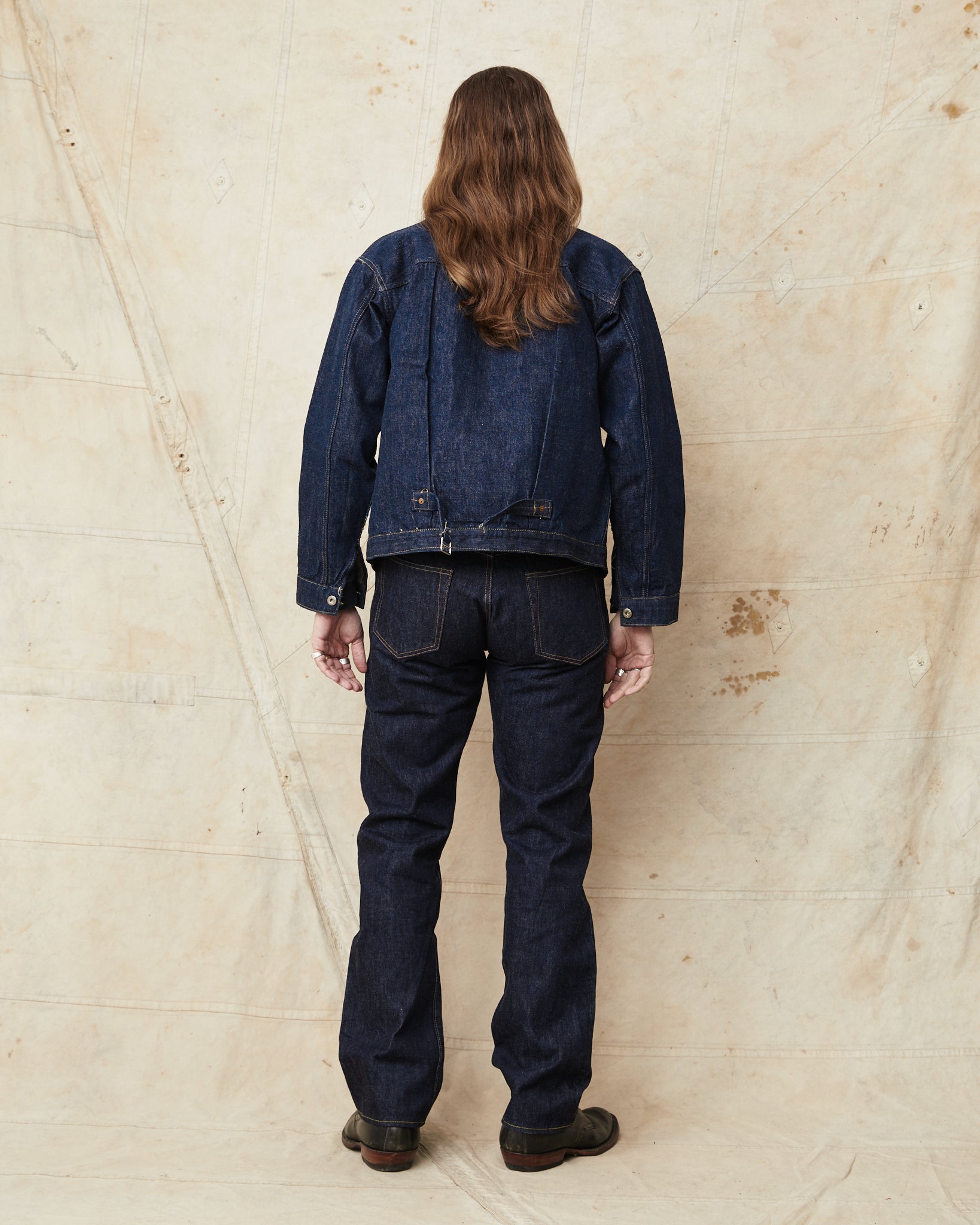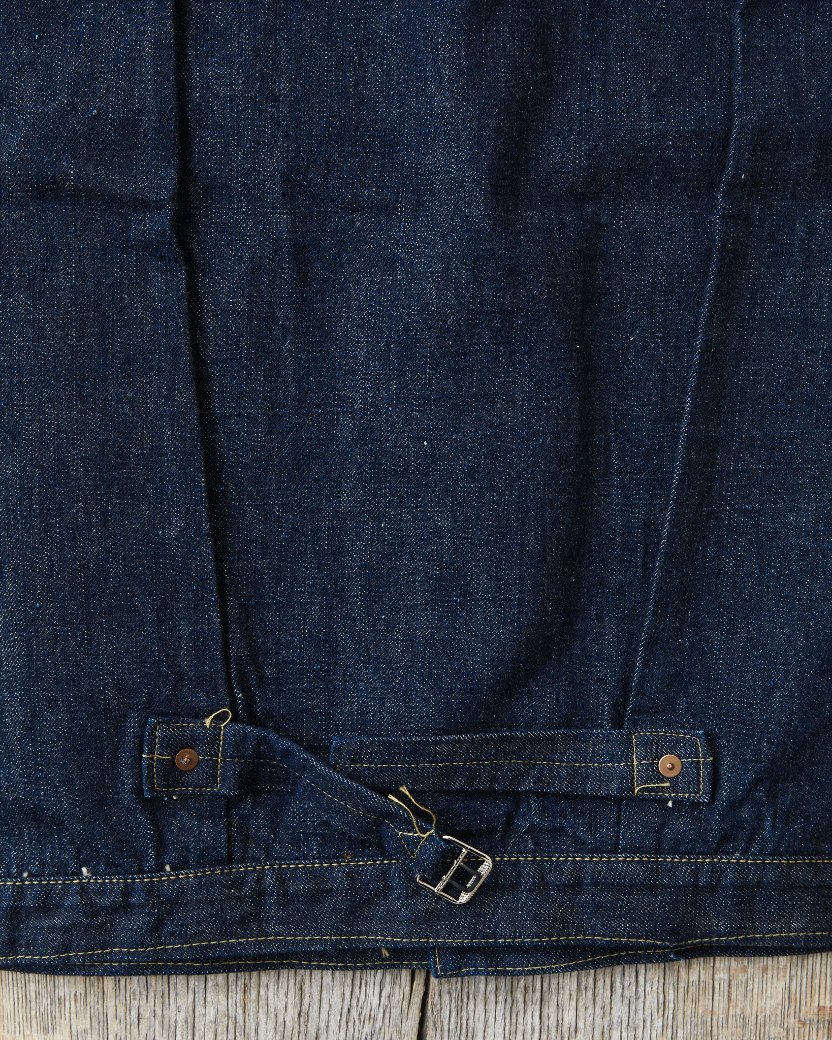 Super "Denim" is a new project launched by Yuchi Fukutomi of Sugar Cane. He has brought together denim specialist, commonly known as "SCSC". This second edition also welcomes known Japanese vintage denim collector, Mr. Shigeki Wakita. Under his supervision, Sugar Cane has developed new fabrics, trims, and patterns based on the rare-to find dead stock vintage garments from Mr. Wakita's collection. The goal of the project was to produce perfect duplications of the historically, original vintage garments by faithfully replicating all details such as war-time iron buckles, imperfect sewing stitches, and rough and uneven stitch counts. Simply to recreate them exactly as they looked in the past.