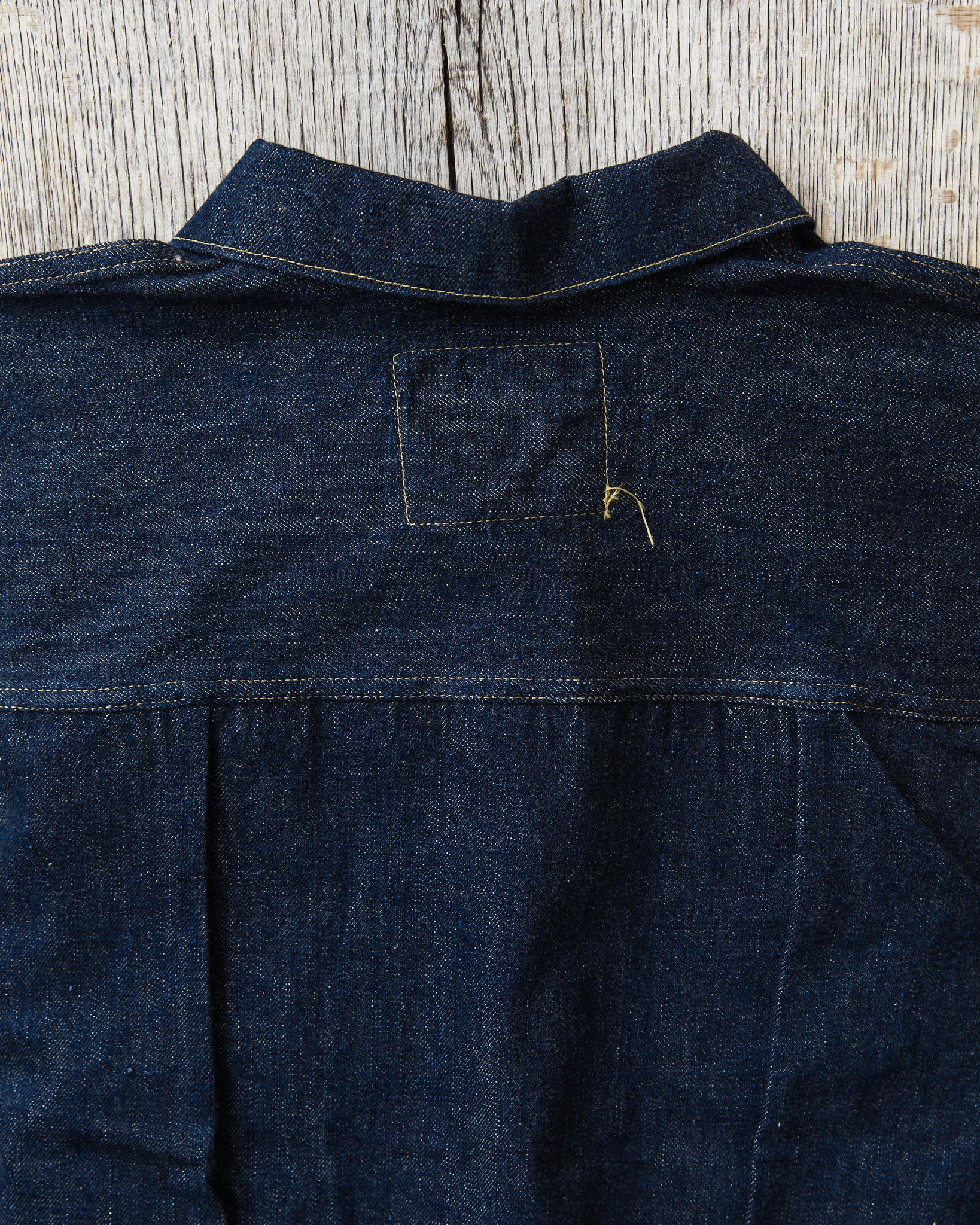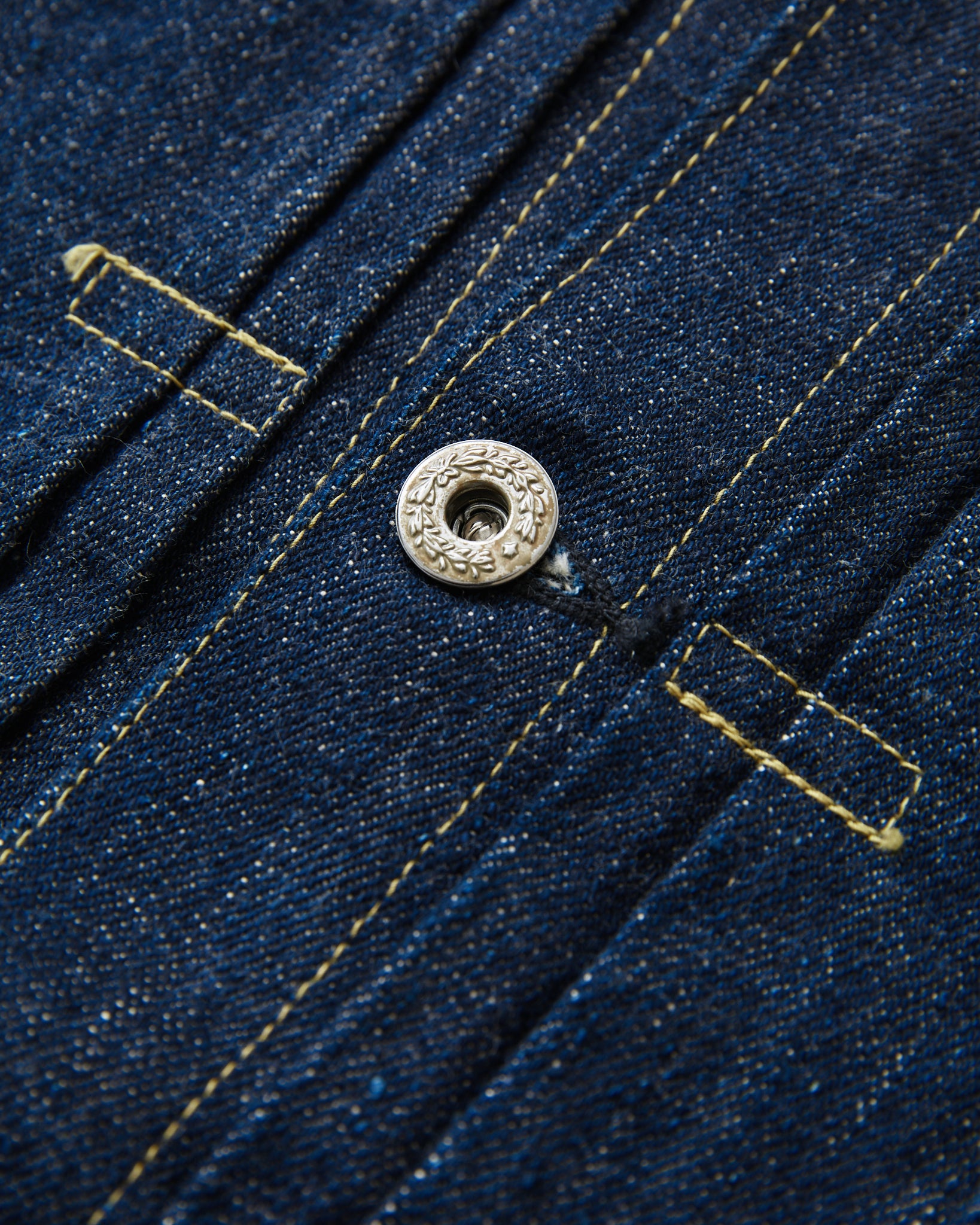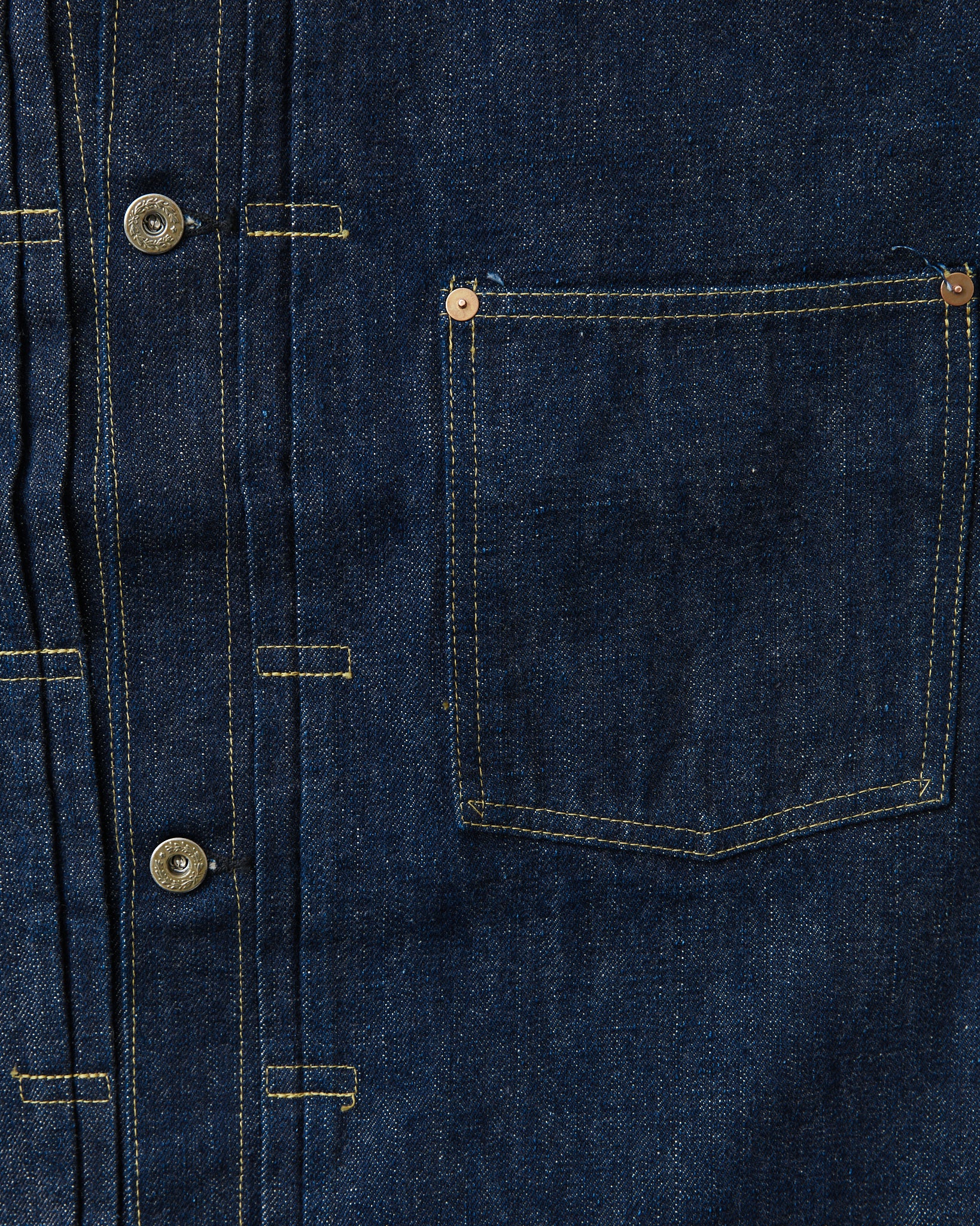 This 1945 Denim Blouse is a complete duplication of Mr. Yakiya's vintage denim jacket made in the year of 1945. As the war progressed, the US government had imposed strict restriction on the materials that the manufactures and factories used for their denim jackets. The number of front button was reduced to 4 pcs from 5. Their original embossed metal button was replaced by the commonly used laurel leaf donut button. The pocket flap was removed. Rough sewing and trimming prove that the jackets had to be completed hastily by unskilled sewers during the war. These changes, however, are now regarded as unique, distinctive and even charming details seen only on this war time garments