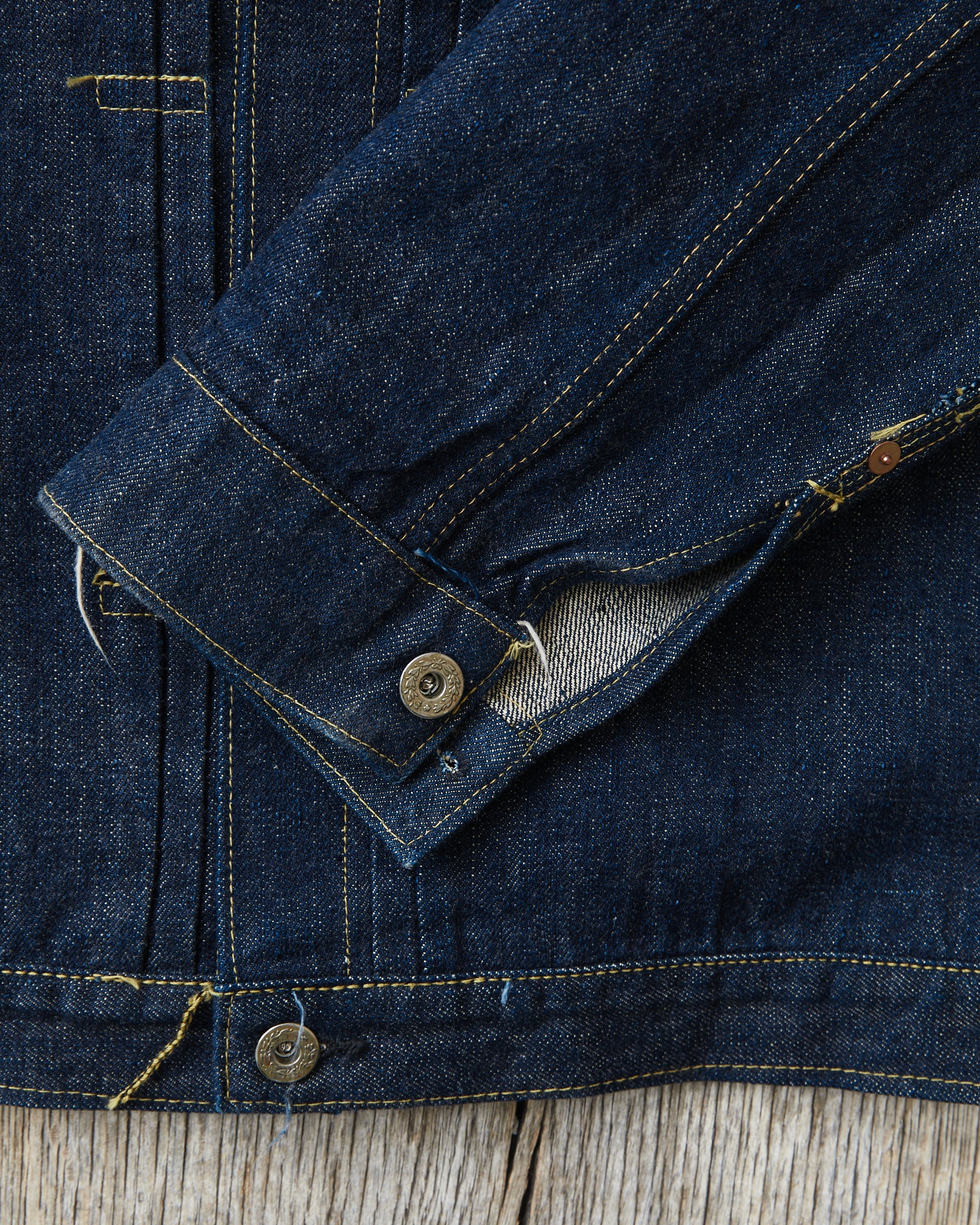To recreate an item as close as possible to the original dead stock item from Wakita's collection. Sugar Cane has oxidized the denim fabric, so to give it an aged look, parts are also made to look as if they are in a state of aged dead stock.