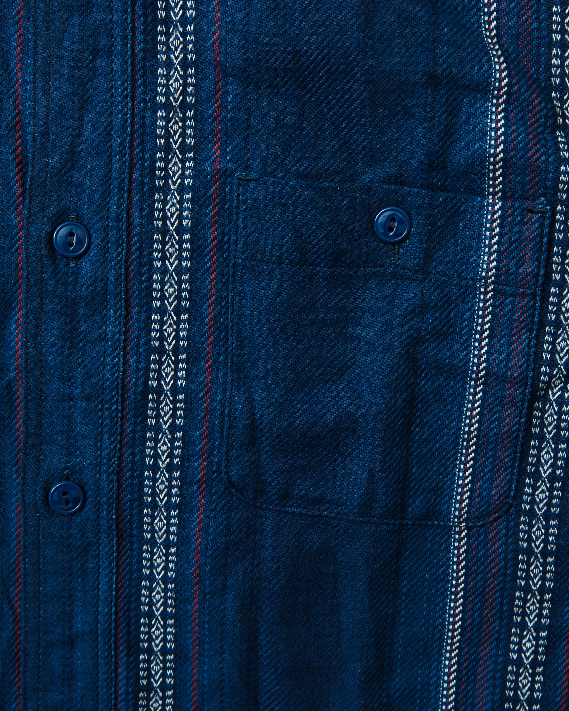 This is Sugar Cane's version of a classic work shirt, made of a beautiful indigo dyed cotton fabric with a woven striped pattern in blue and red. The touch of this fabric makes one think of garments produced in the early 20th century with a texture that is hard to find these days.