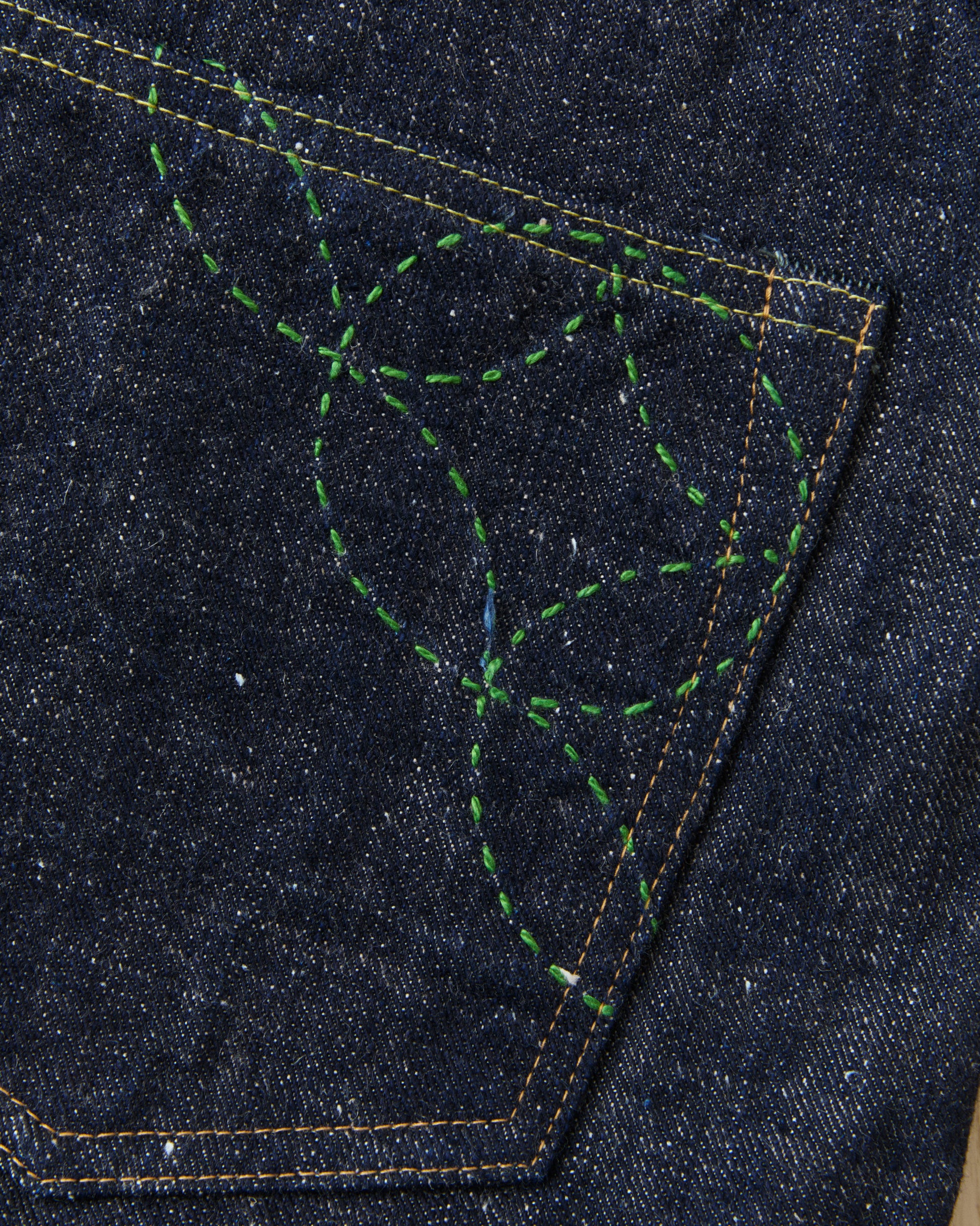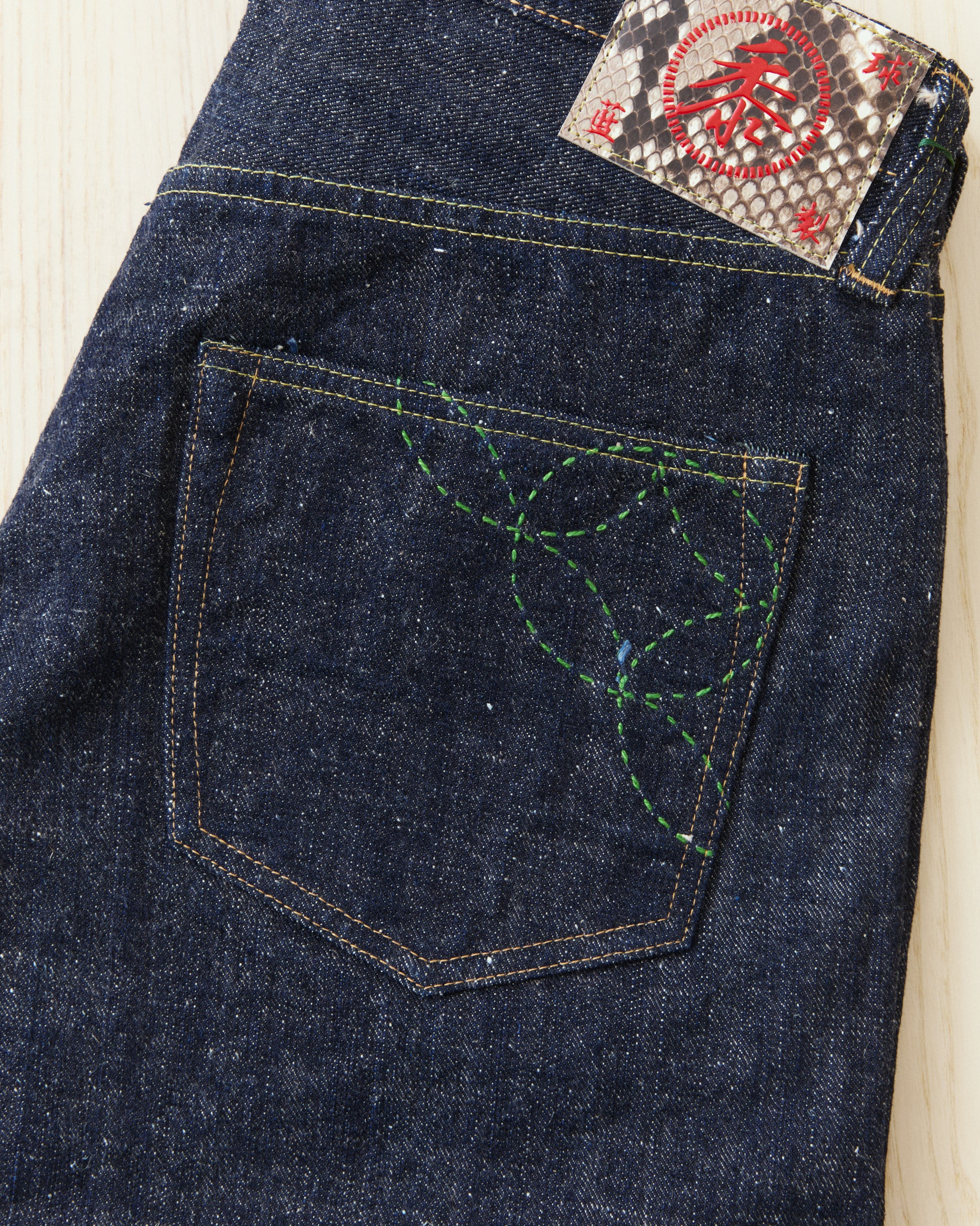 The Sugar Cane Fiber denim Lot. 301 is woven with the original yarns blended with 50% cotton and 50% sugar cane fiber. Ryukyu-Ai indigo from Okinawa and regular indigo are combined and resulted in the dark, reddish blue denim. The patch is made of python leather, and the logo is painted in lacquer. The silhouette is regular straight, similar to our 1947 model.
