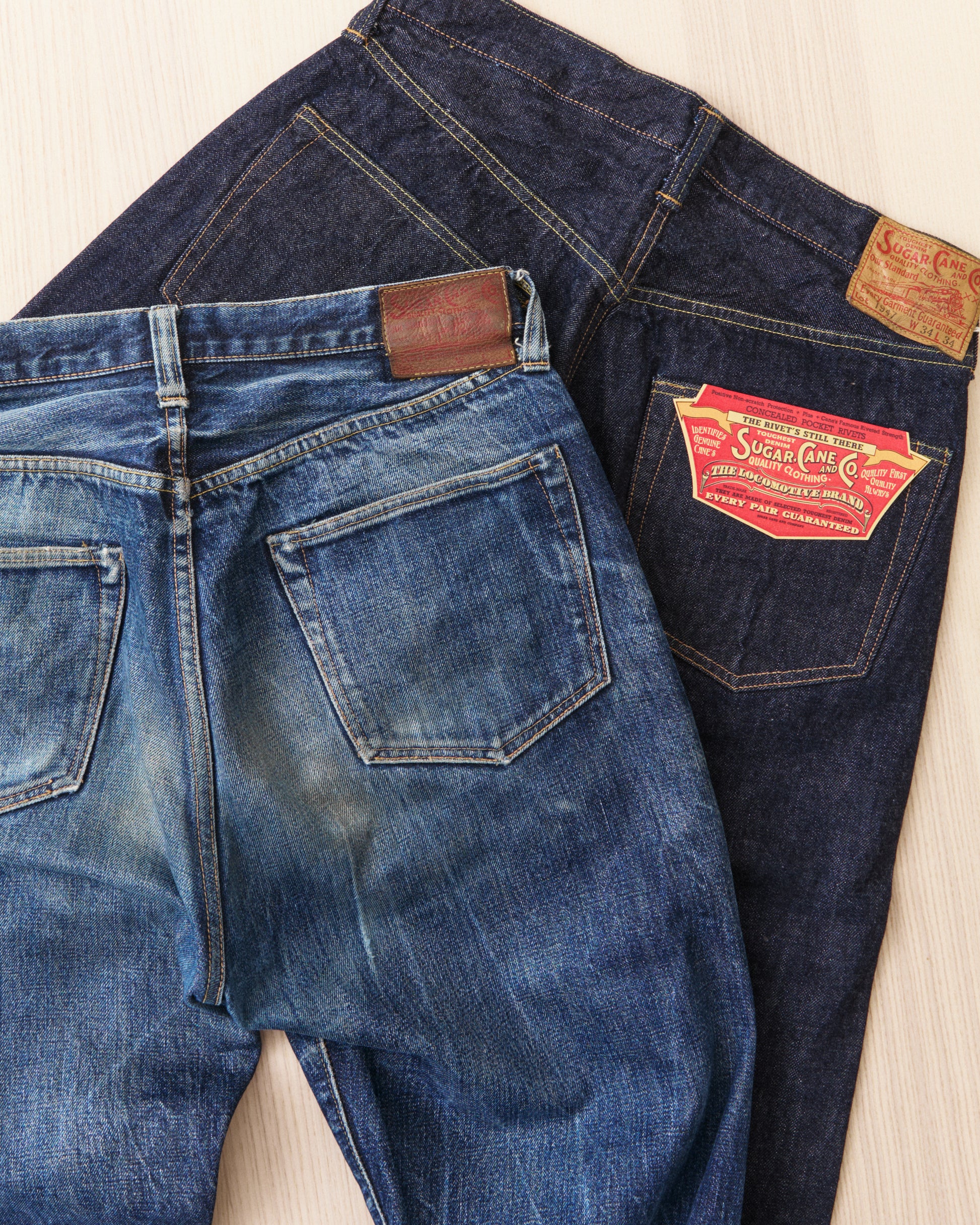The last two images shows the Sugar Cane jeans together with a pair of used ones. This is only to give an idea on how everyday use and washing will develop the denim and also to inspire.