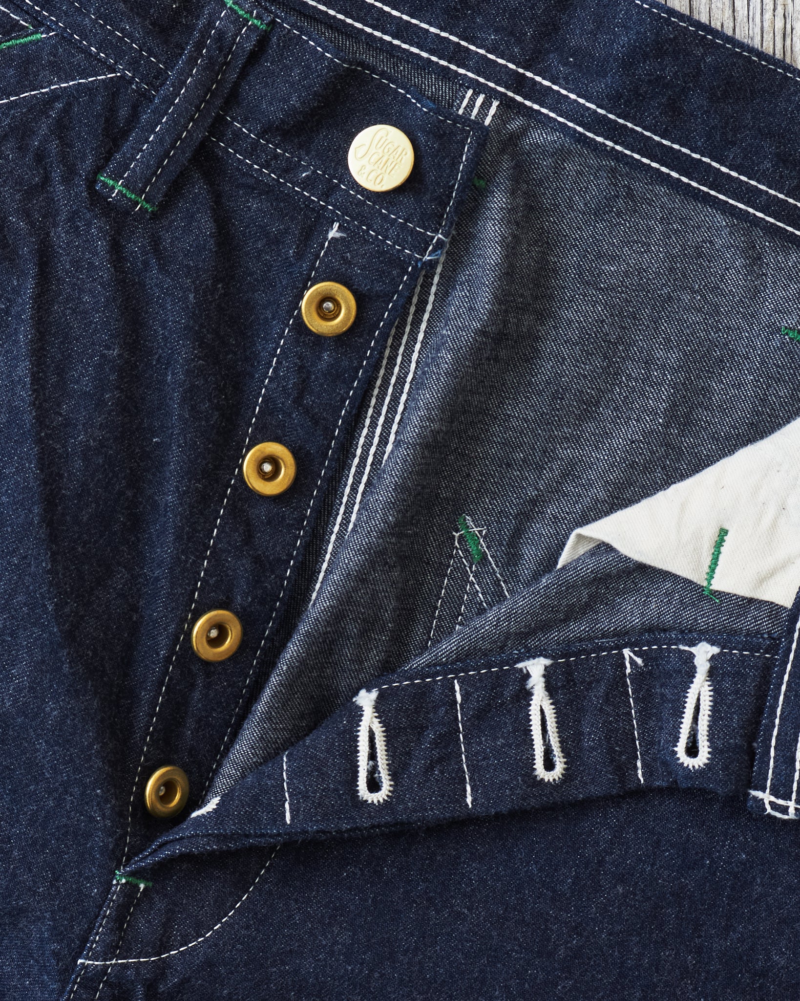 Here's Sugar Cane's take on a 1940's style work pant. They feature a hammer loop and tool pockets that will fit some nifty stuff. The fit is relaxed the fabric is a reproduction of vintage JELT denim, a fabric that was popular in work wear from the middle of the last century. In the production the yarn is twisted tightly making a fine and strong thread that is woven into a sturdy twill fabric. The result is a strong fabric which is not too heavy, ideal for comfortable and long lasting work wear!