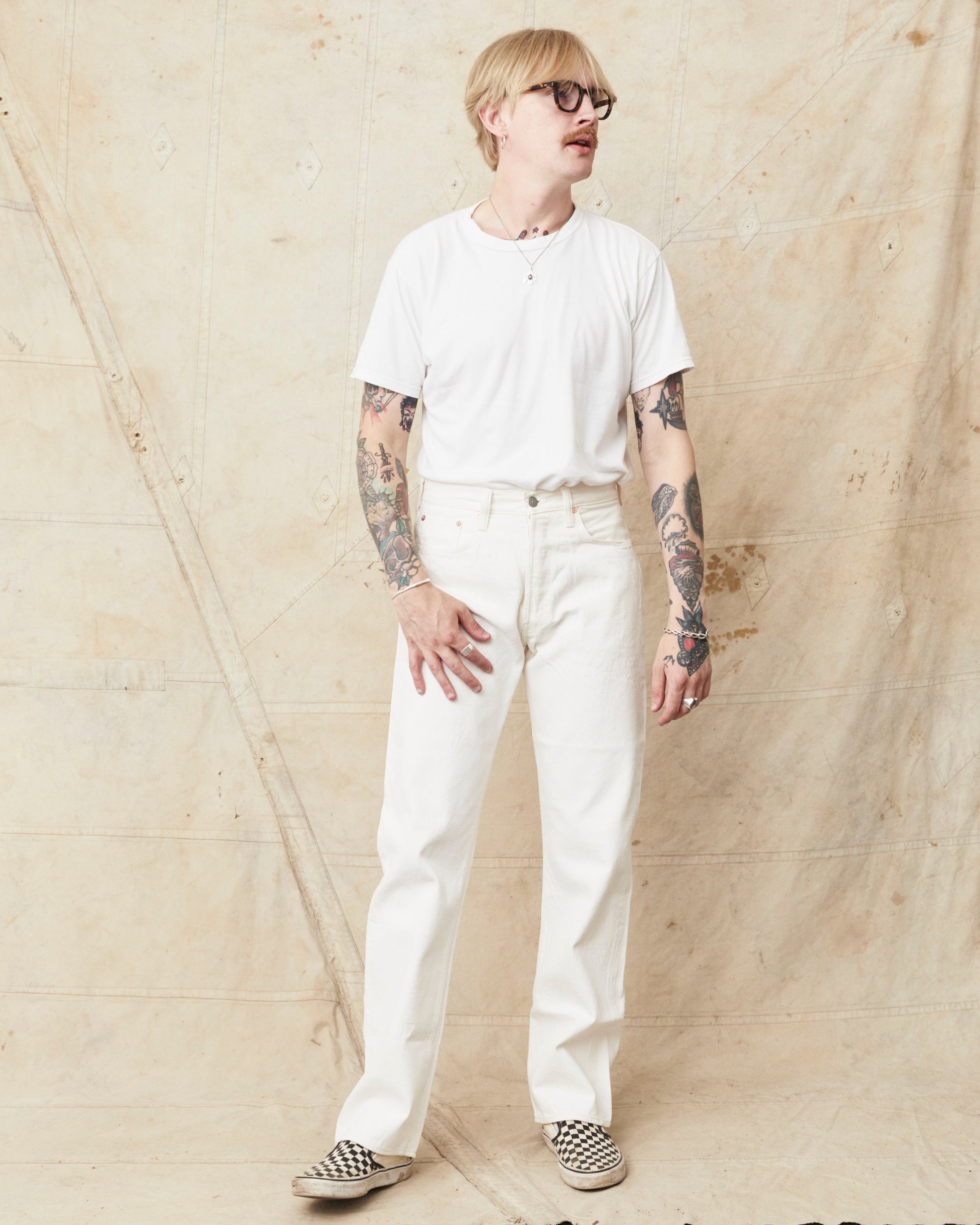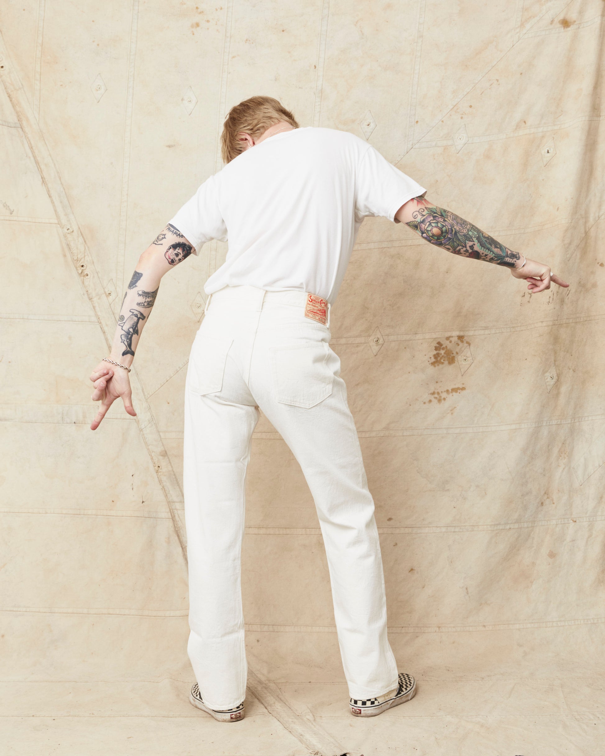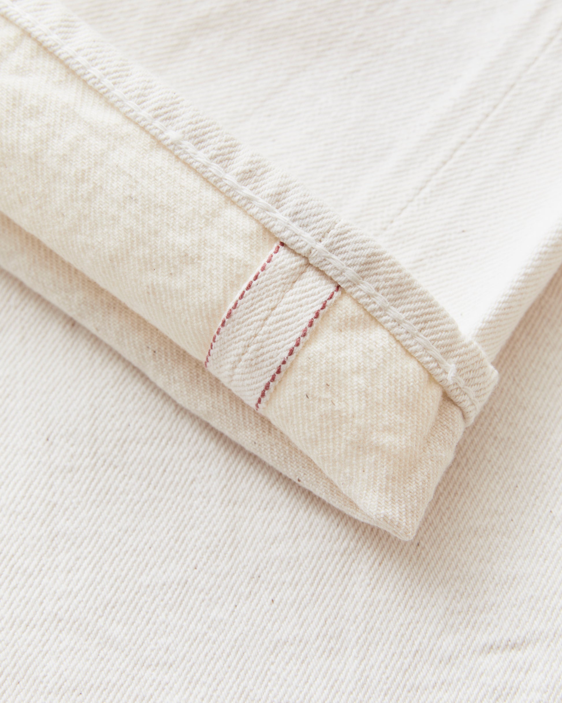 This version is made in a Japanese 13 oz white denim that has been washed once. You don't have to worry about shrinkage when you wash them for the first time. The 1947 models from Sugar Cane is one of our absolute favorite fits so we were really happy to finally see these in a white selavage denim fabric as well.