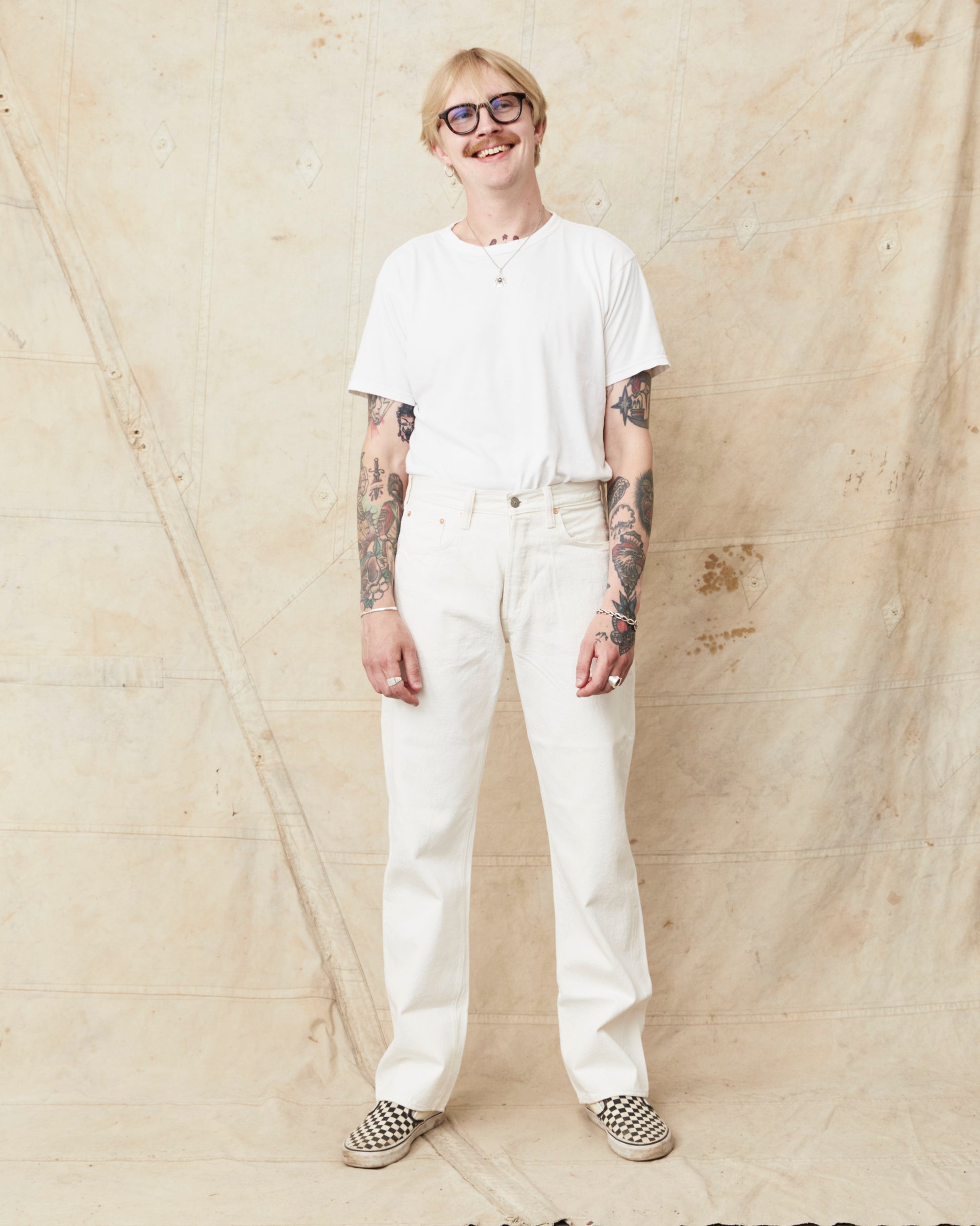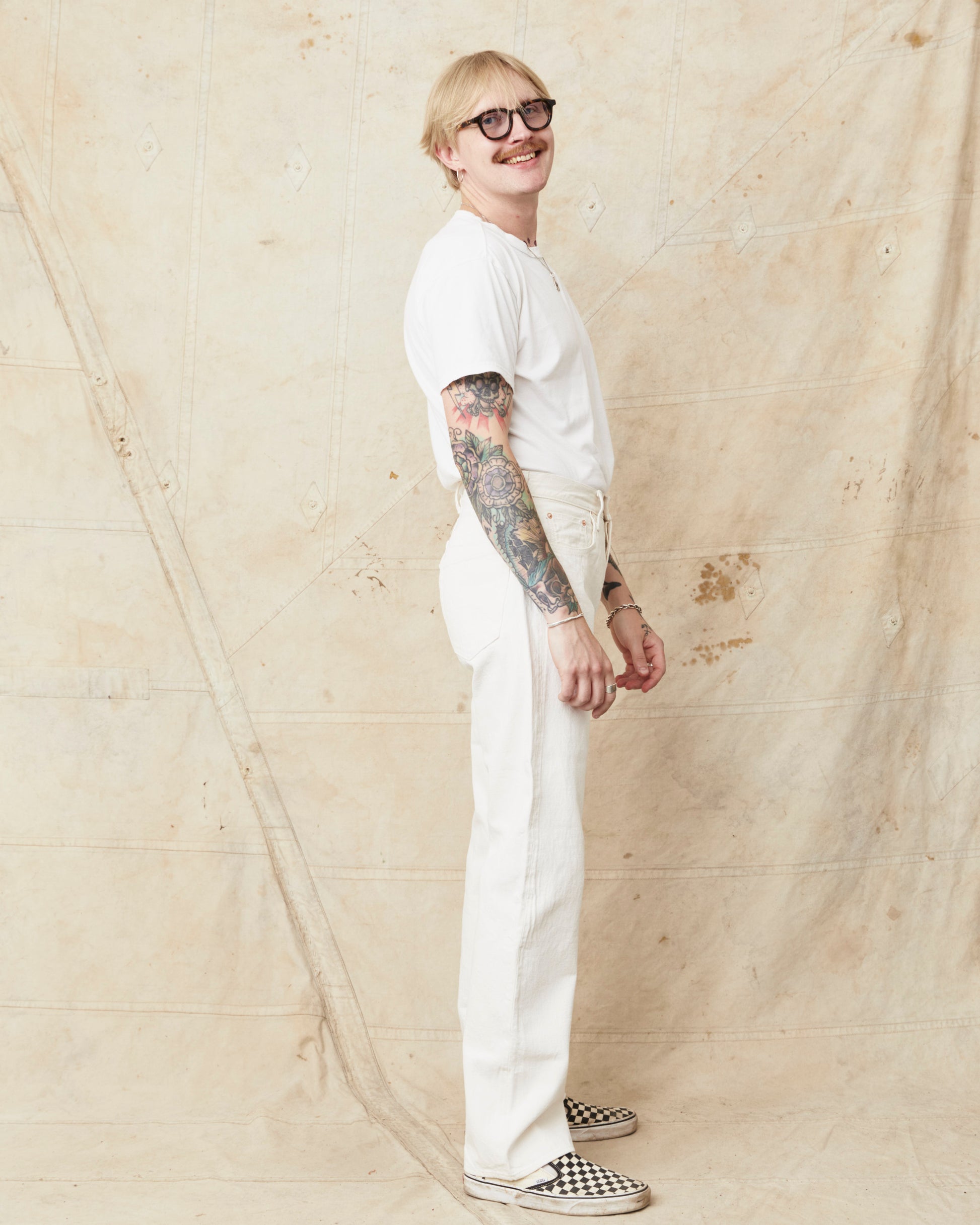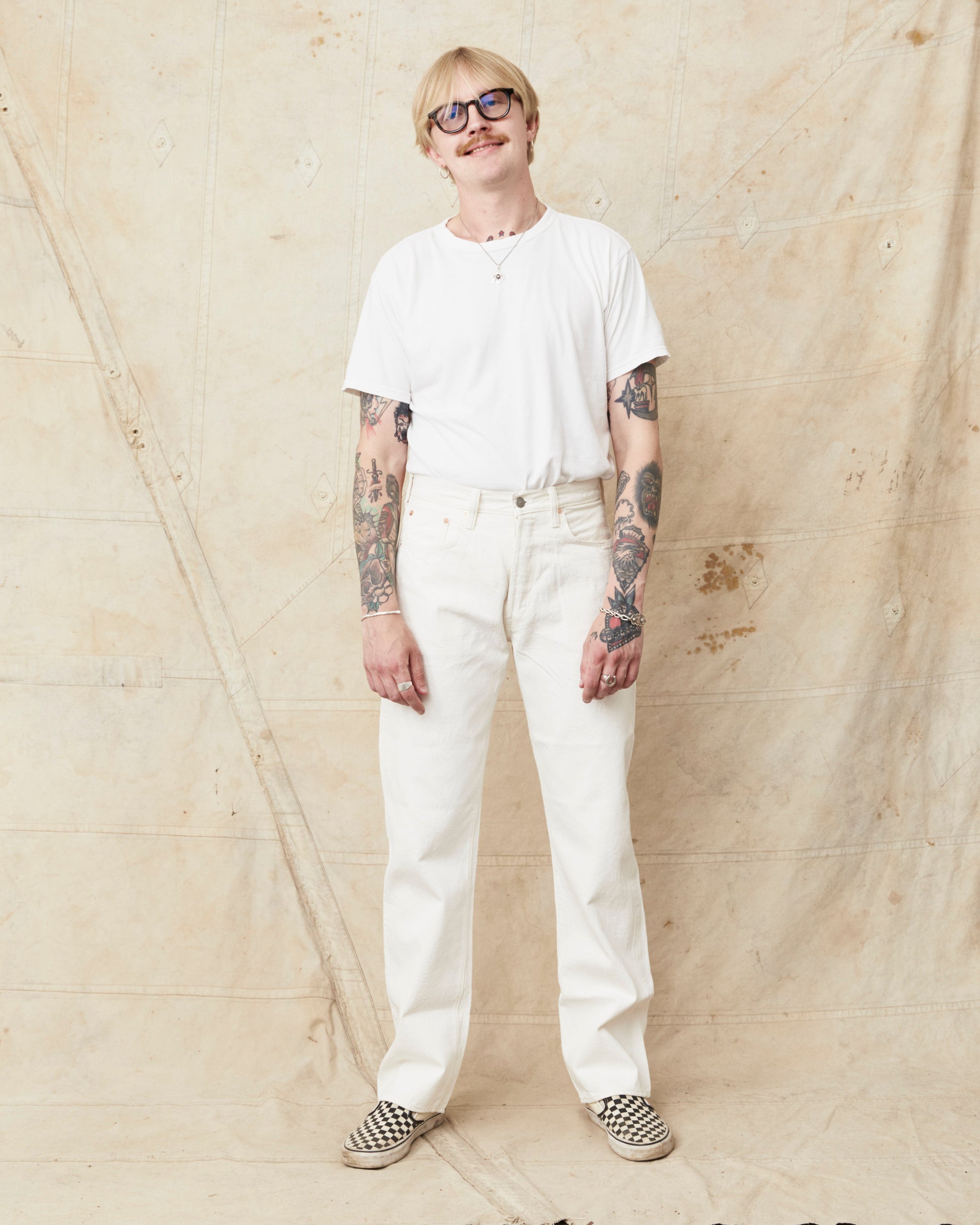 This version is made in a Japanese 13 oz white denim that has been washed once. You don't have to worry about shrinkage when you wash them for the first time. The 1947 models from Sugar Cane is one of our absolute favorite fits so we were really happy to finally see these in a white selavage denim fabric as well.