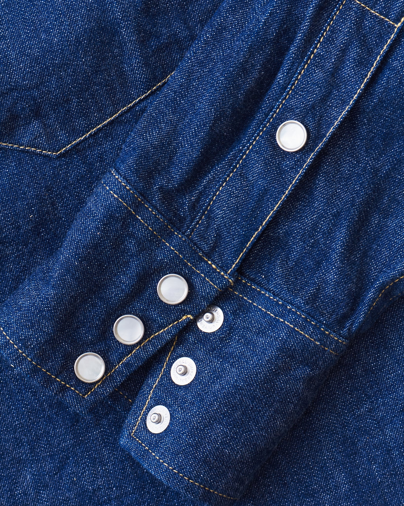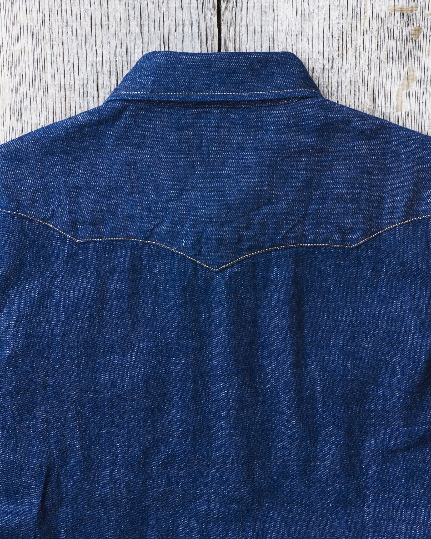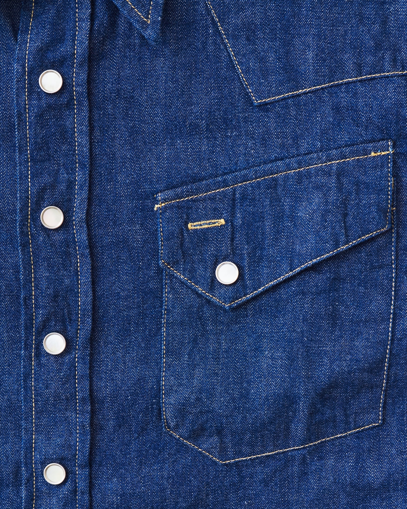 This is Sugar Cane's version of a 1950's/60's western snap button denim shirt. Western shirts back in the day were often seen in satin with big embroideries and fringes. The real, hard working cowboys needed something more rugged and durable and fabrics like denim, flannel and chambray were used instead. The snap buttons used are decorative but actually serves a very important purpose. If stuck, in for instance a bulls horns, snap buttons opens easily compared to regular sewn on buttons. A simple detail made to avoid accidents.