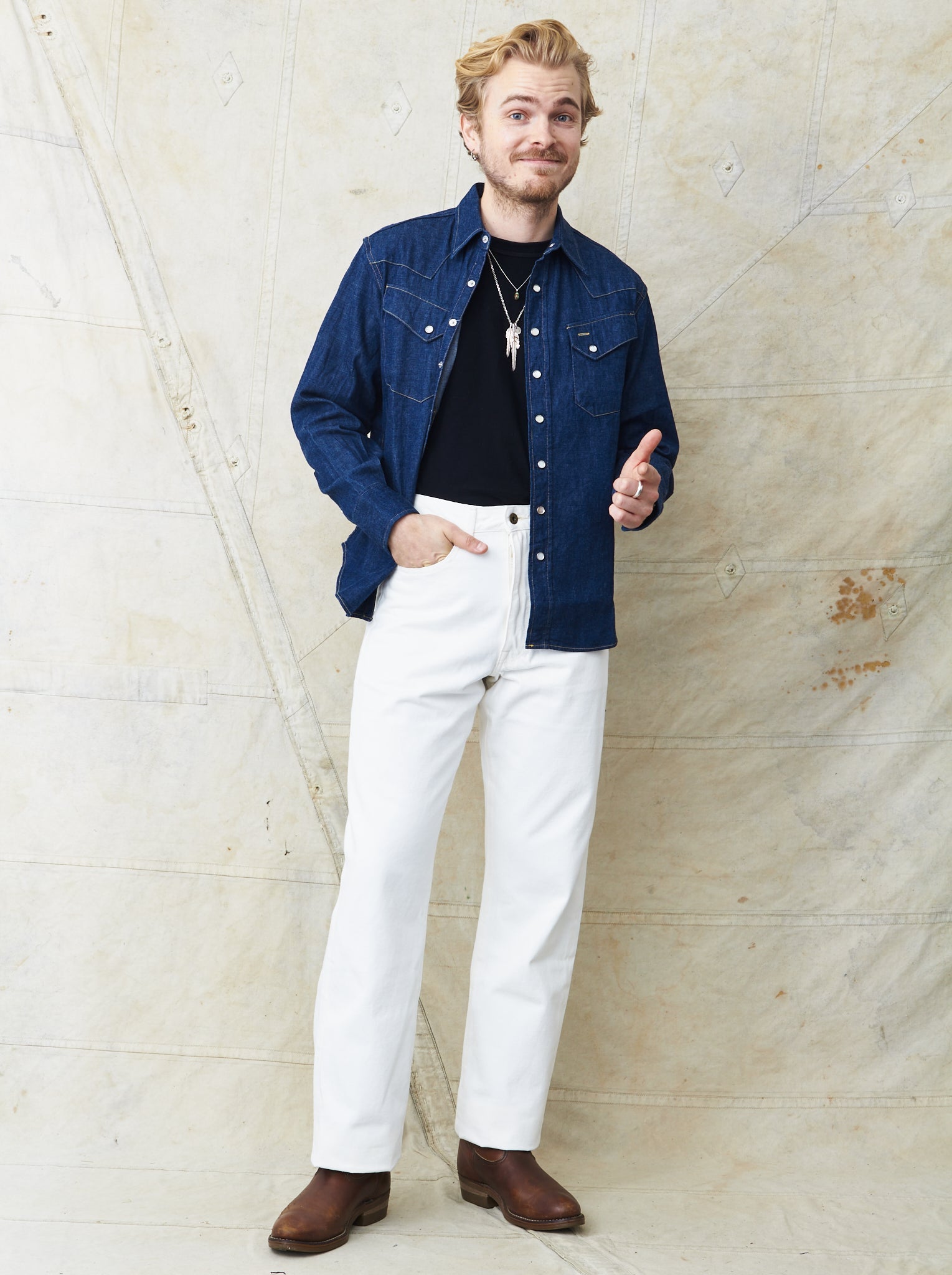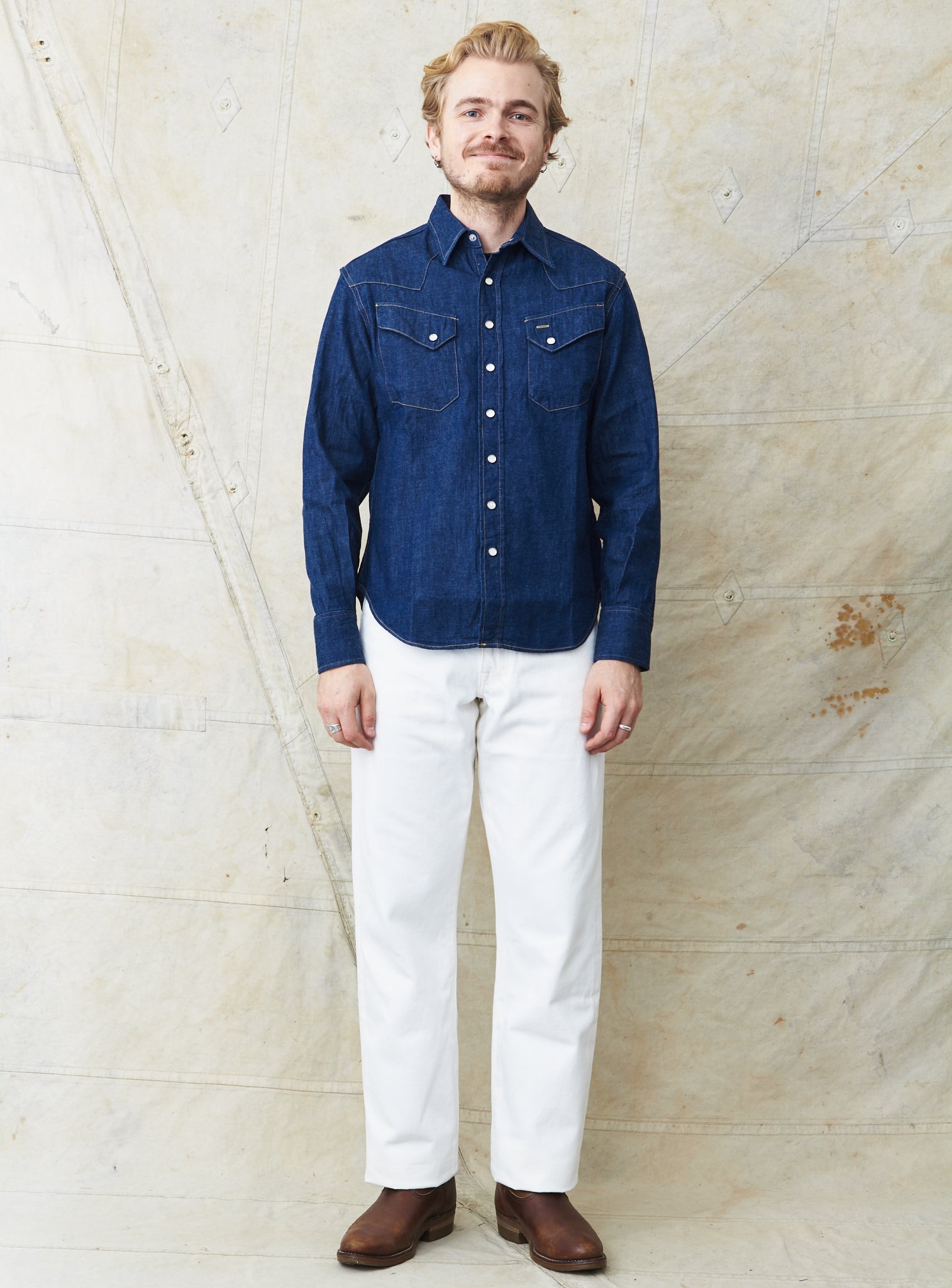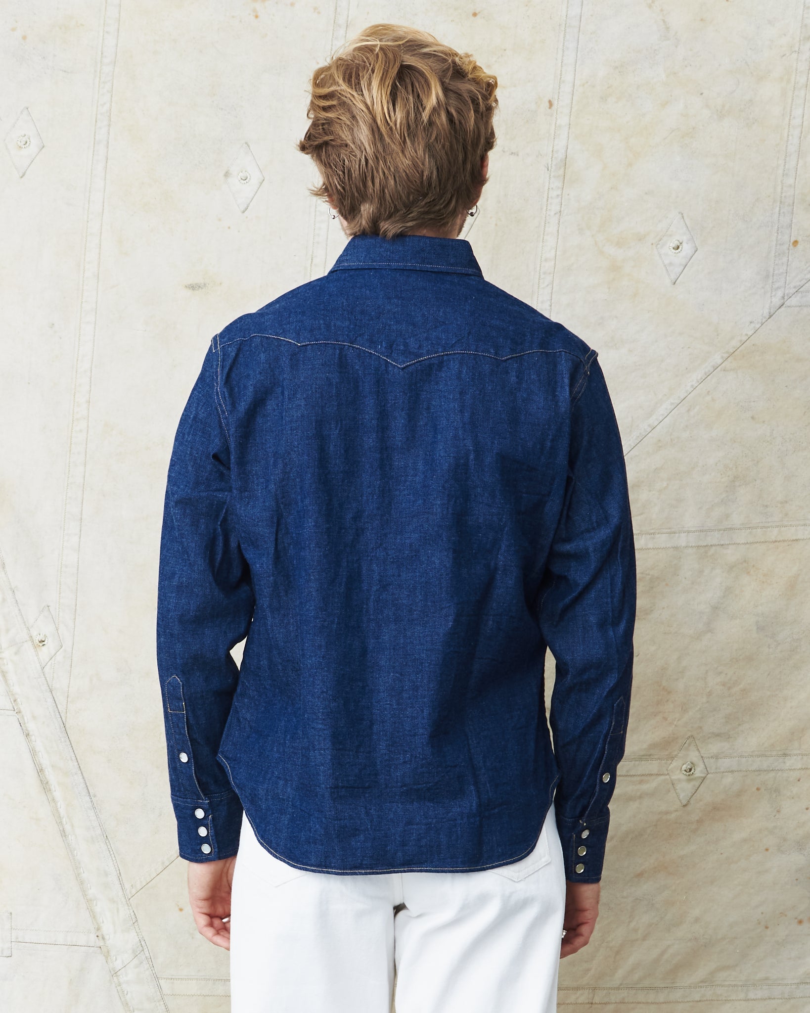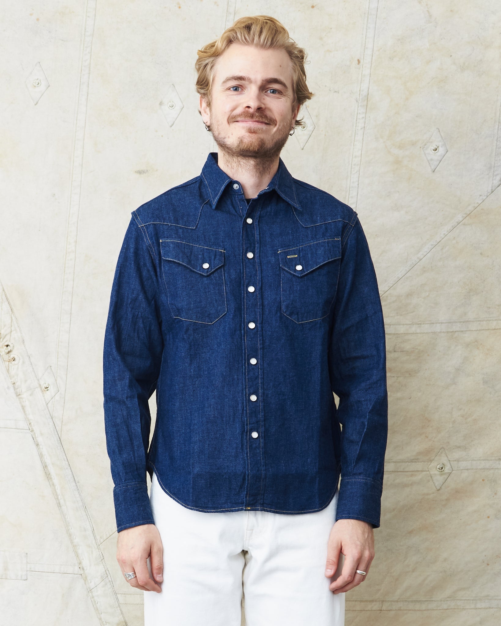 This is Sugar Cane's version of a 1950's/60's western snap button denim shirt. Western shirts back in the day were often seen in satin with big embroideries and fringes. The real, hard working cowboys needed something more rugged and durable and fabrics like denim, flannel and chambray were used instead. The snap buttons used are decorative but actually serves a very important purpose. If stuck, in for instance a bulls horns, snap buttons opens easily compared to regular sewn on buttons. A simple detail made to avoid accidents.