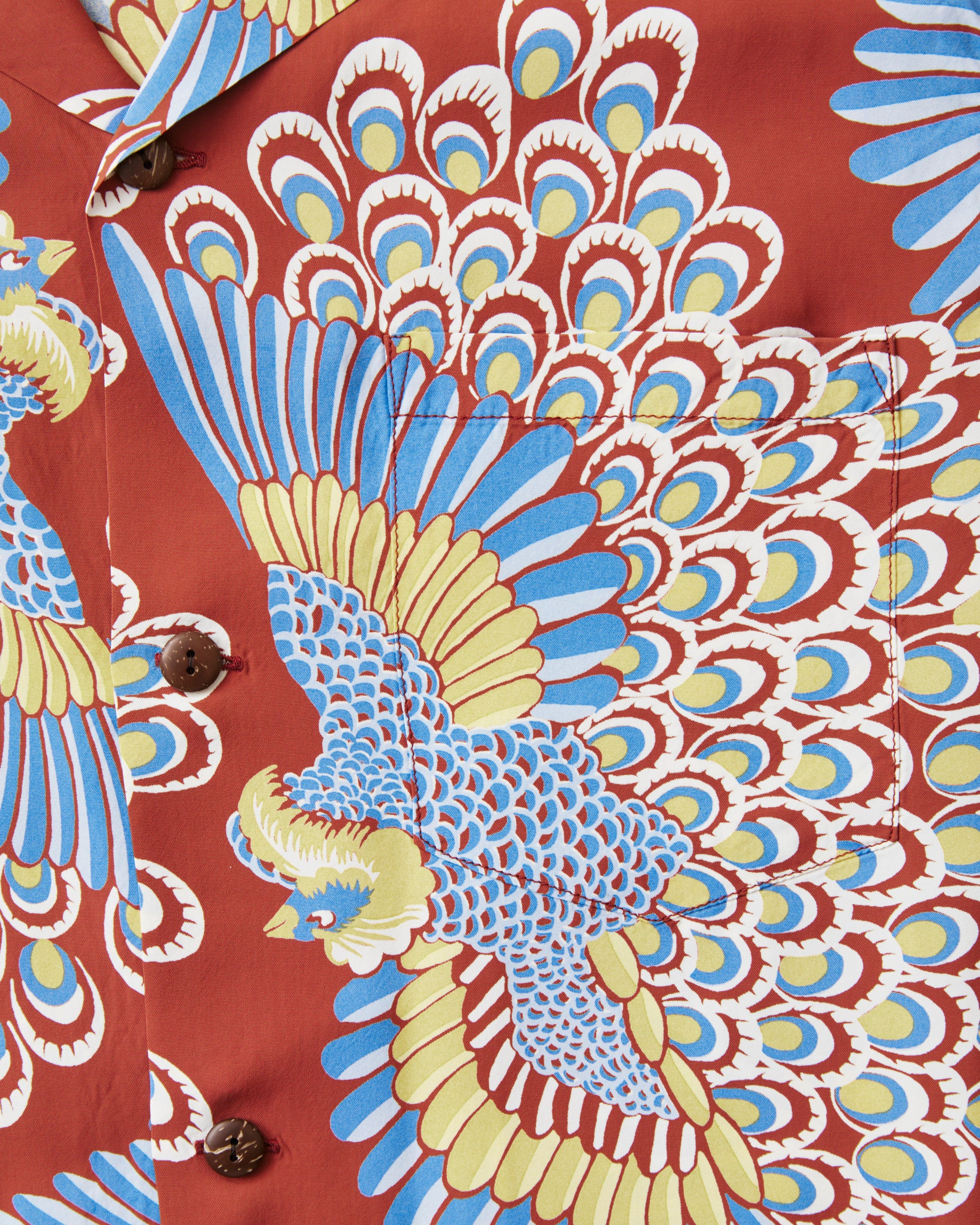 This is a reproduction of a vintage Hawaiian shirt produced in the mid 20th century. The pattern is called "Peacock".
