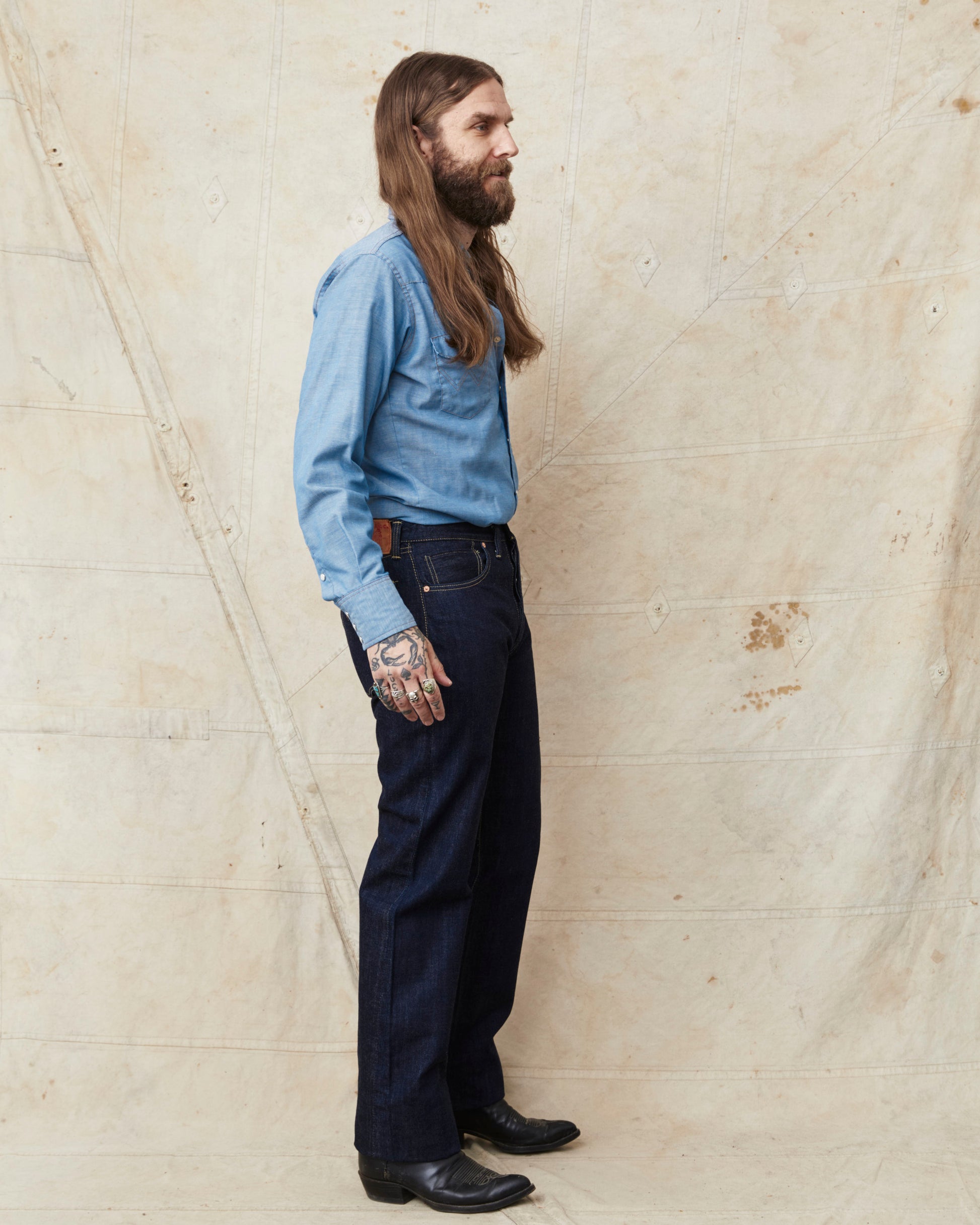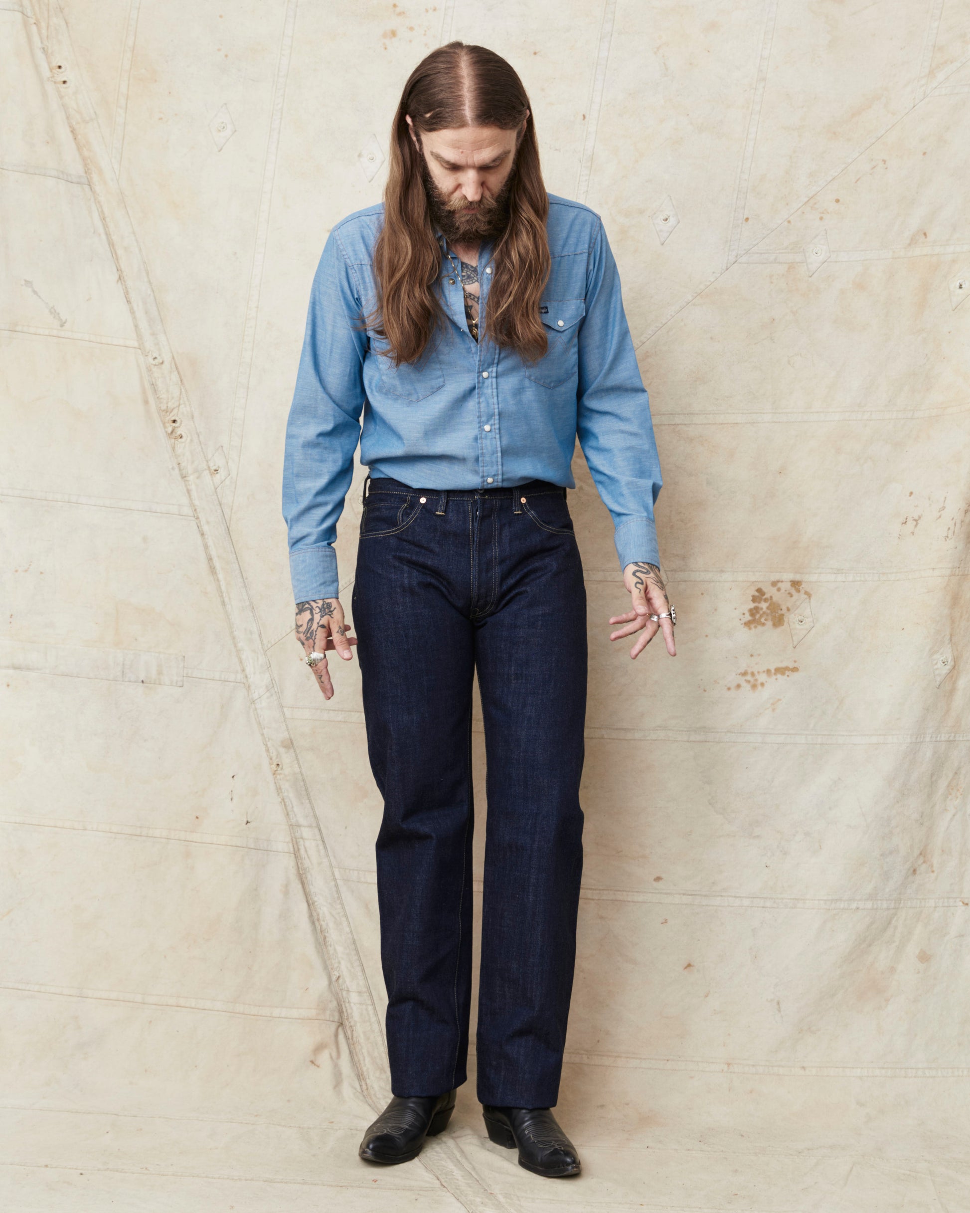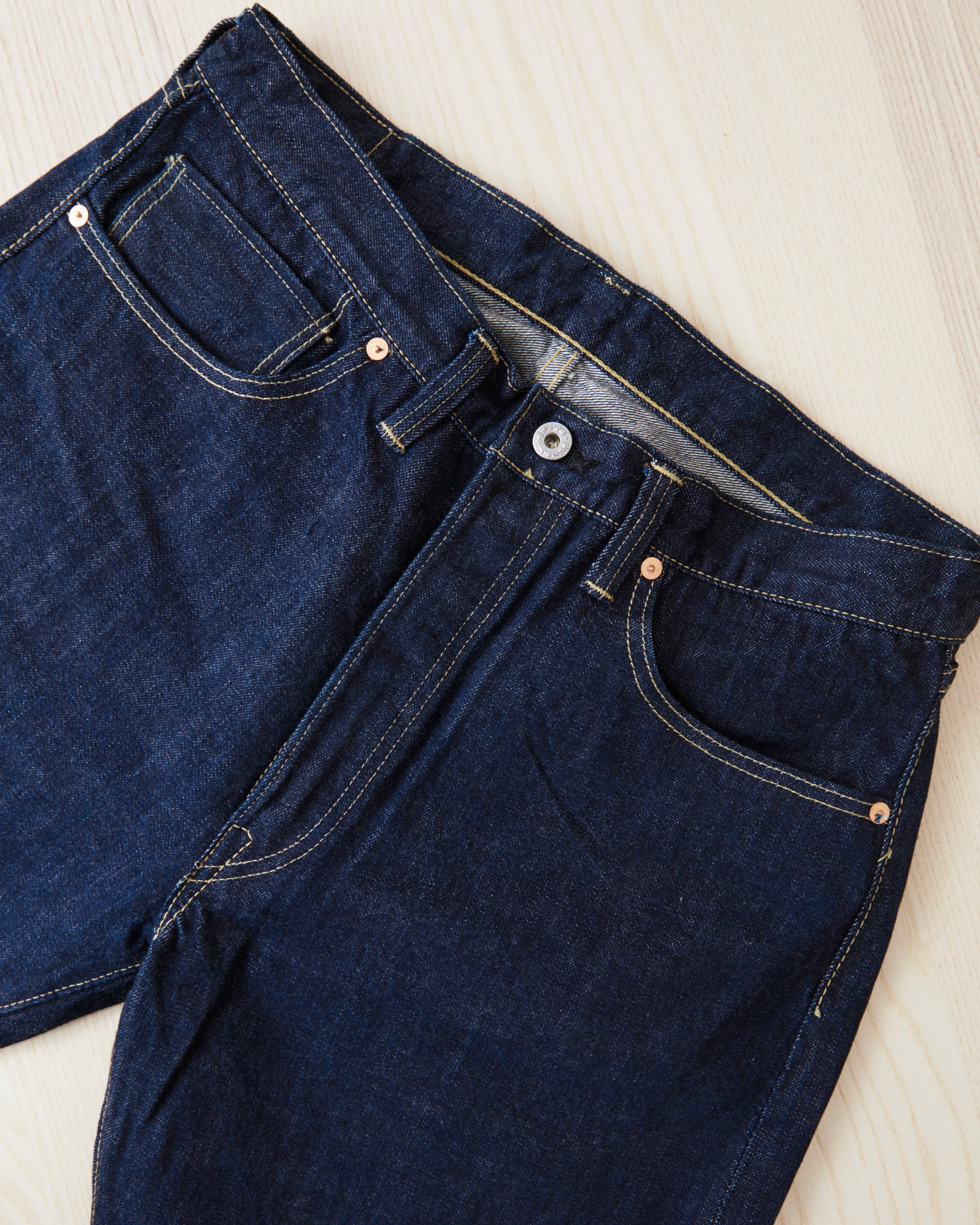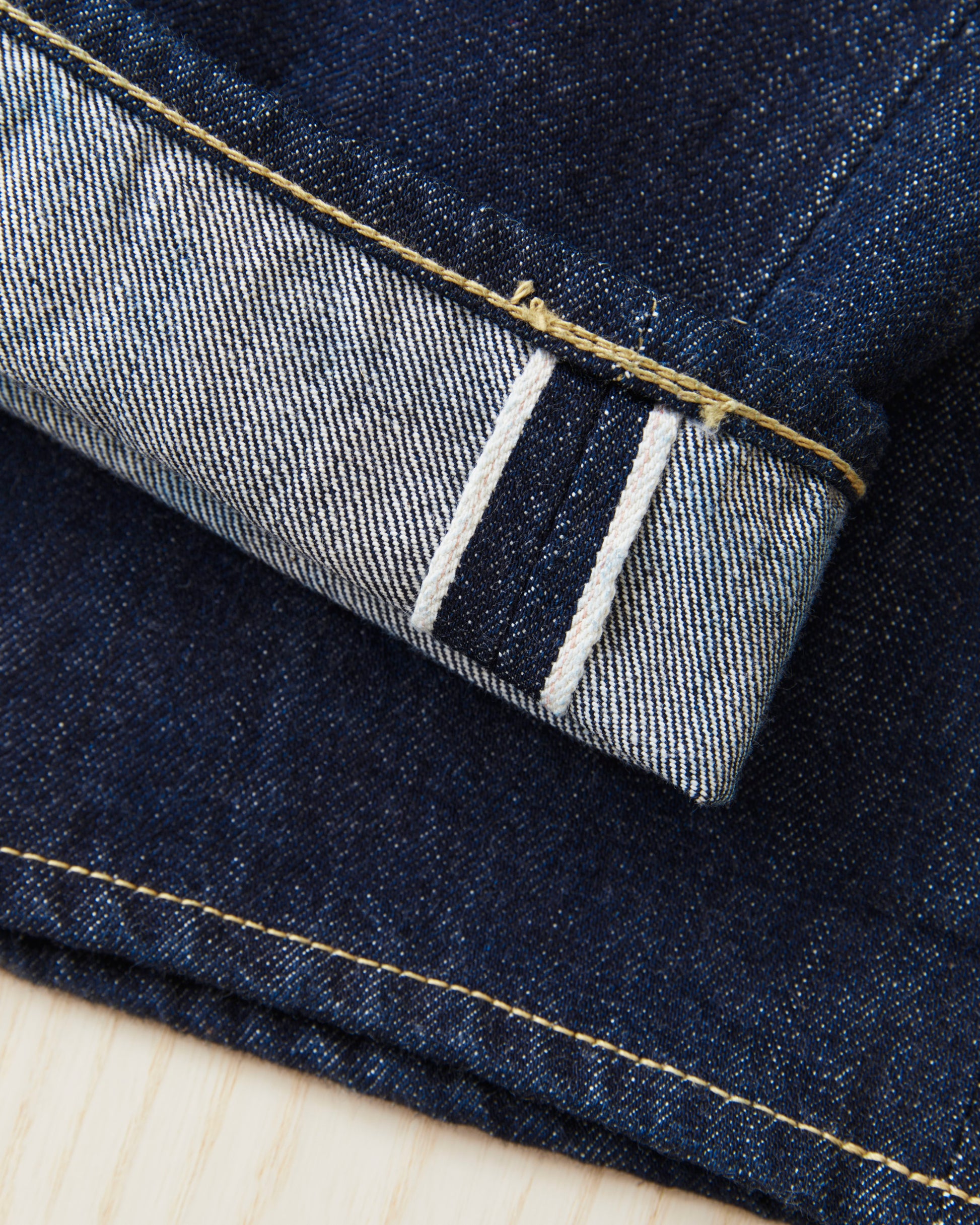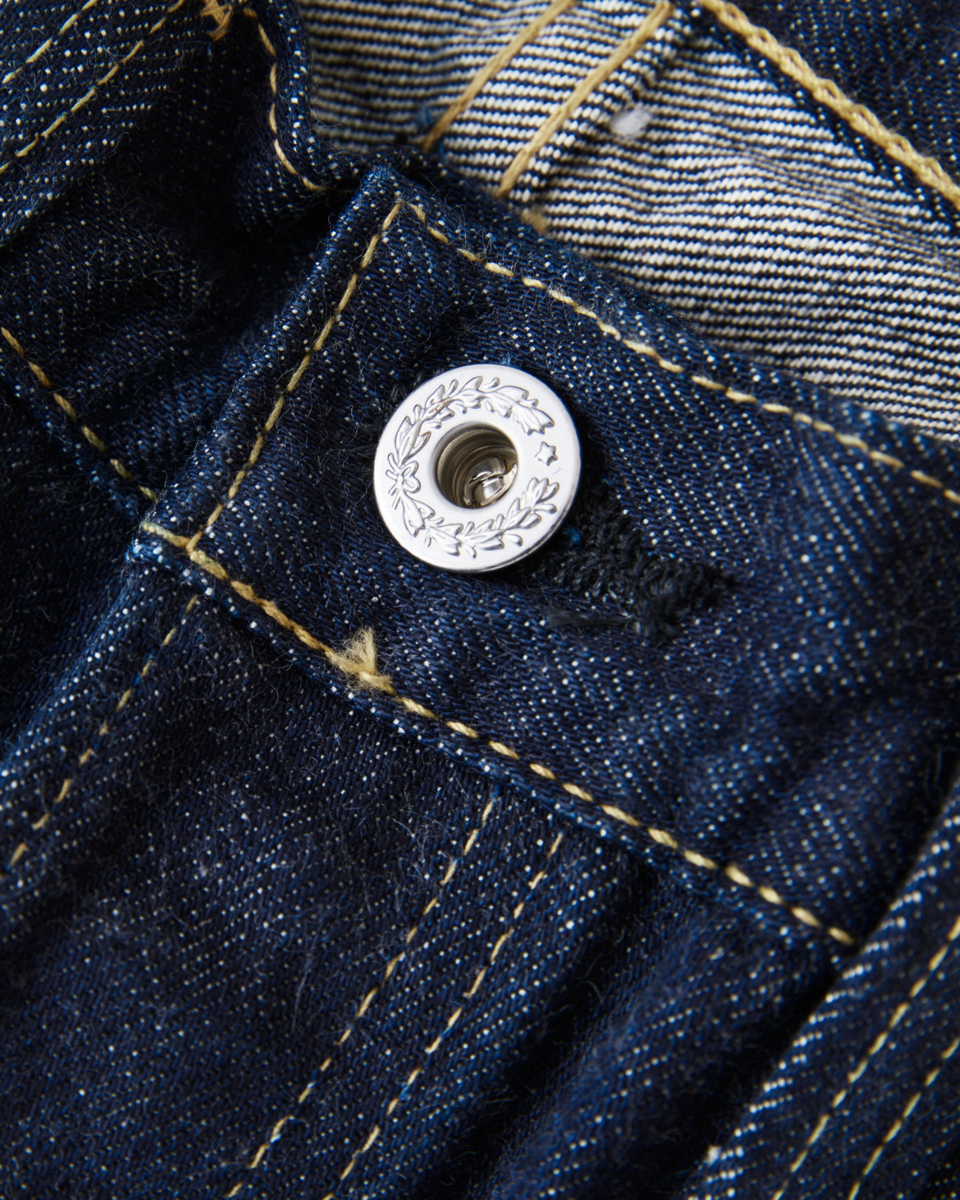 This pair of jeans are inspired by the war time jeans, the S501XX model made by Levi's in the 40s. The war's need for materials led to restrictions on what could be used for manufacturing, which led to a cleaner and simpler design on the jeans from this time. It is made with details such as hidden back pocket rivets and the so called V-stitch behind the top button. The japanese selvage fabric used in this garment is loomed to be as close to the fabrics specs from that time as possible.